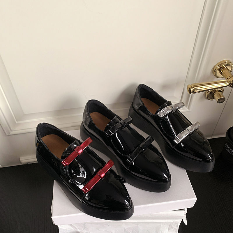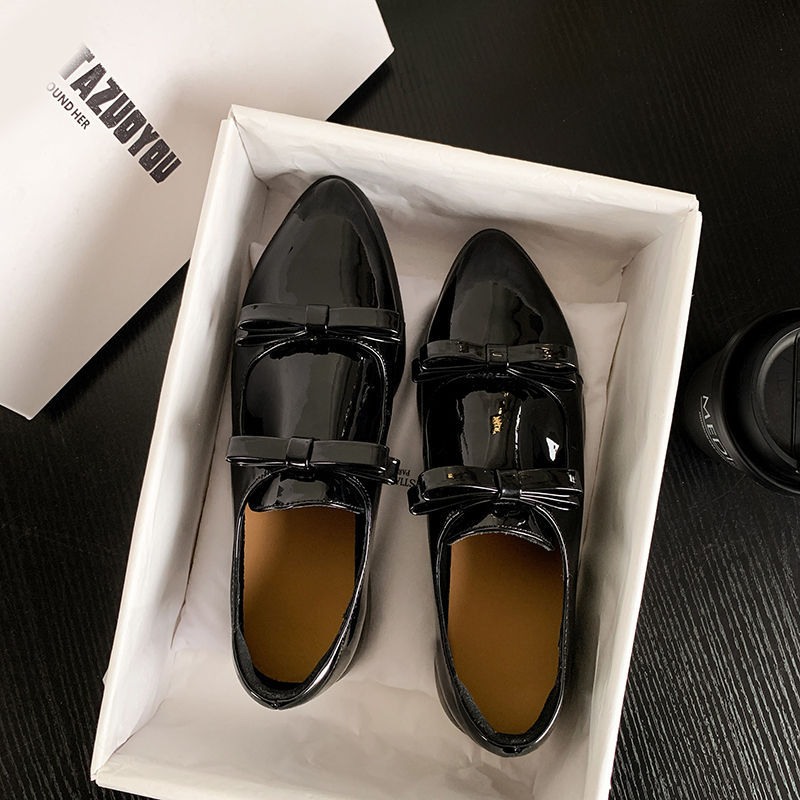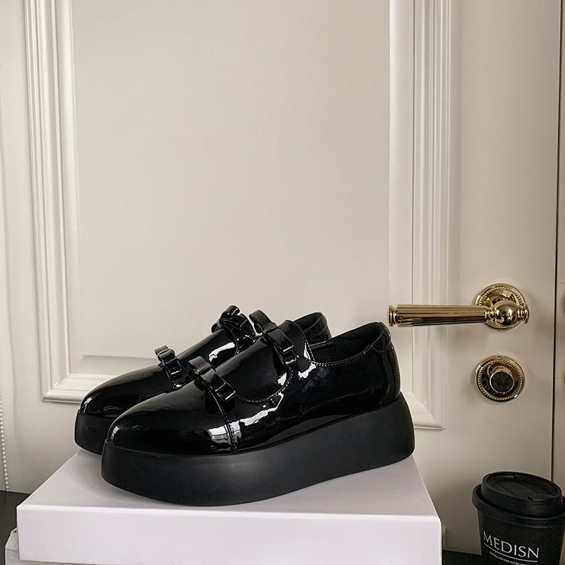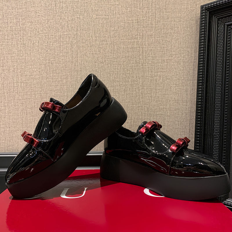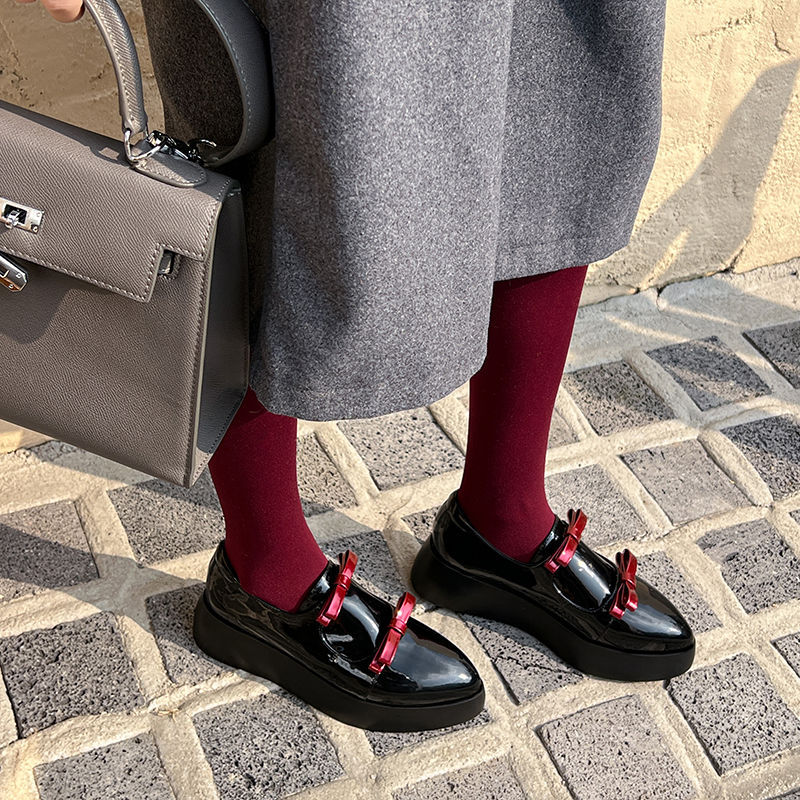 Французские 2025 нишевые круглые кожаные банты сетка красные толстые каблуки дикие кожаные туфли феи ветер одиночные туфли