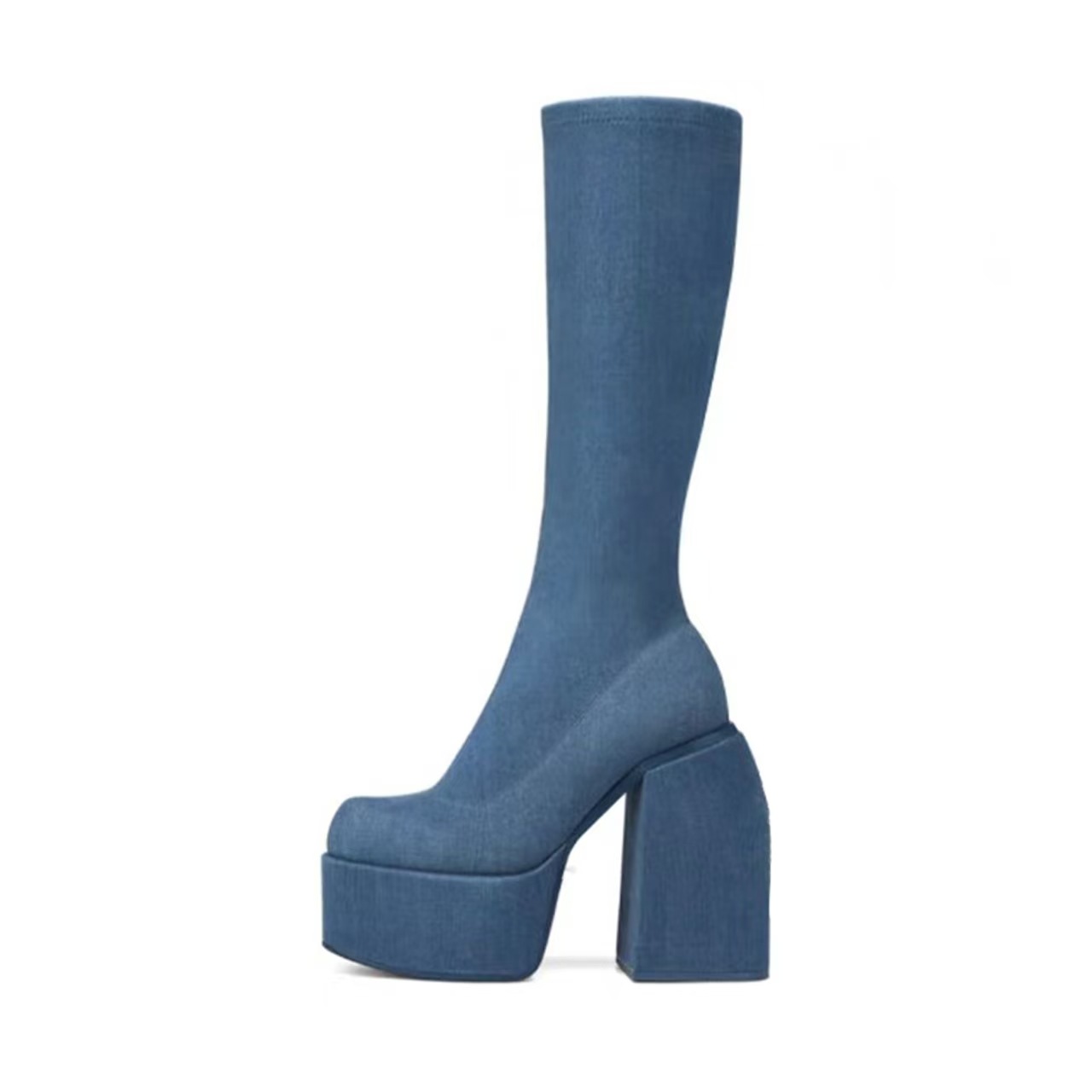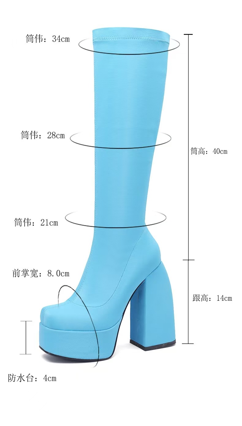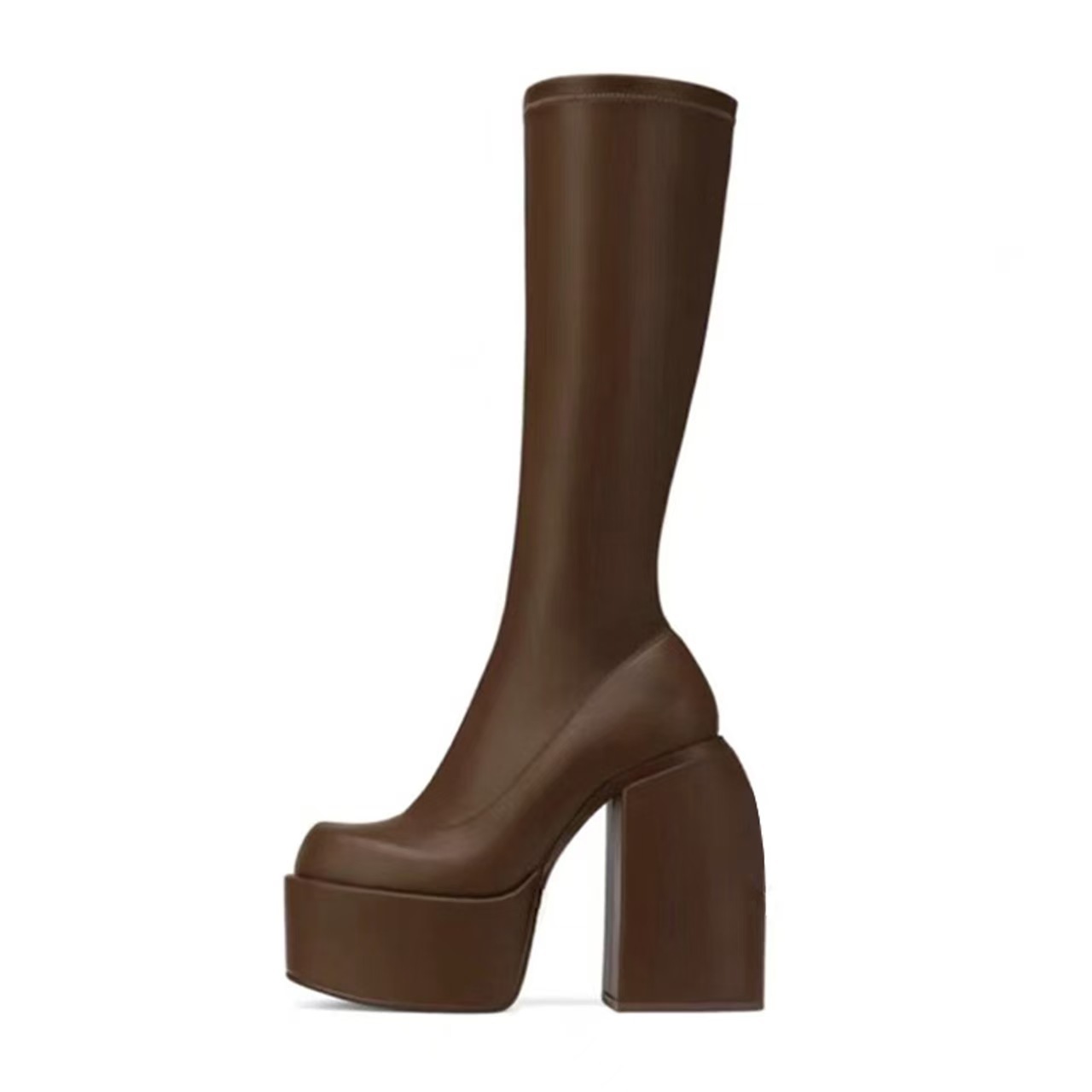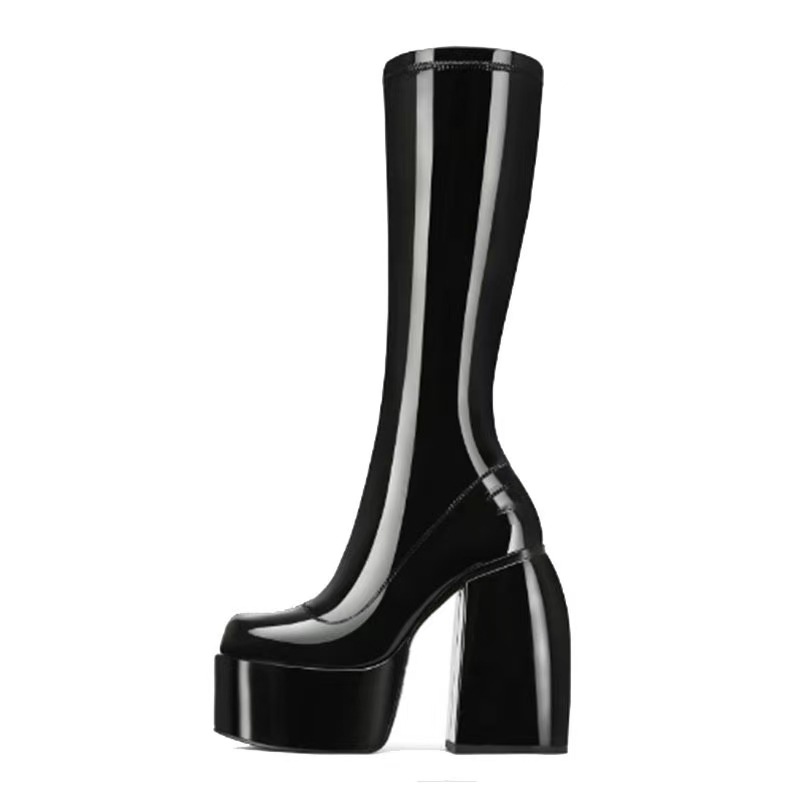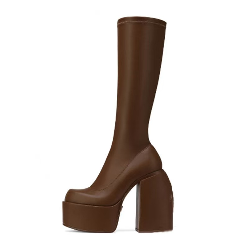 2025 весна и осень новые толстые каблуки на высоких каблуках до колен сапоги эластичные сапоги лакированные коричневые высокие сапоги большой размер женская обувь