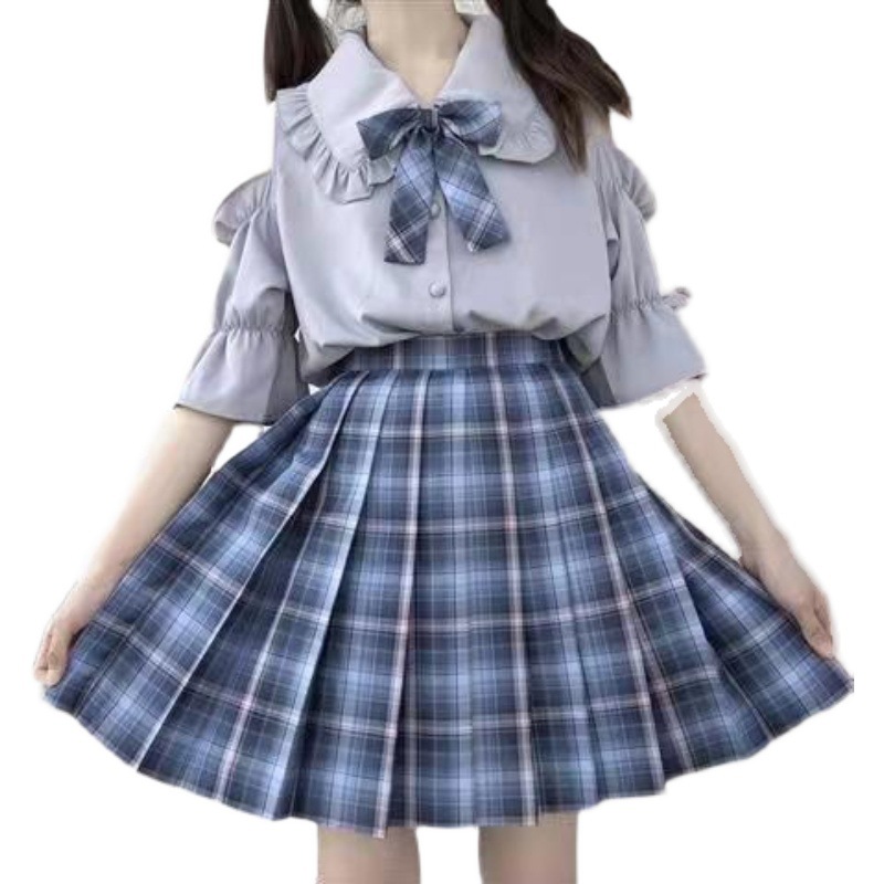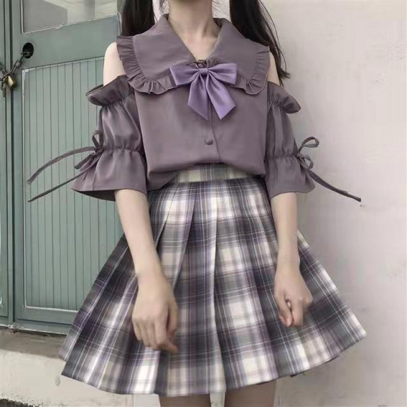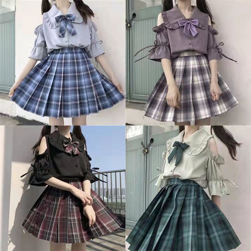Синий топ + синяя клетчатая юбка; Зеленый топ + синяя клетчатая юбка; Фиолетовый топ + серо-белая клетчатая юбка