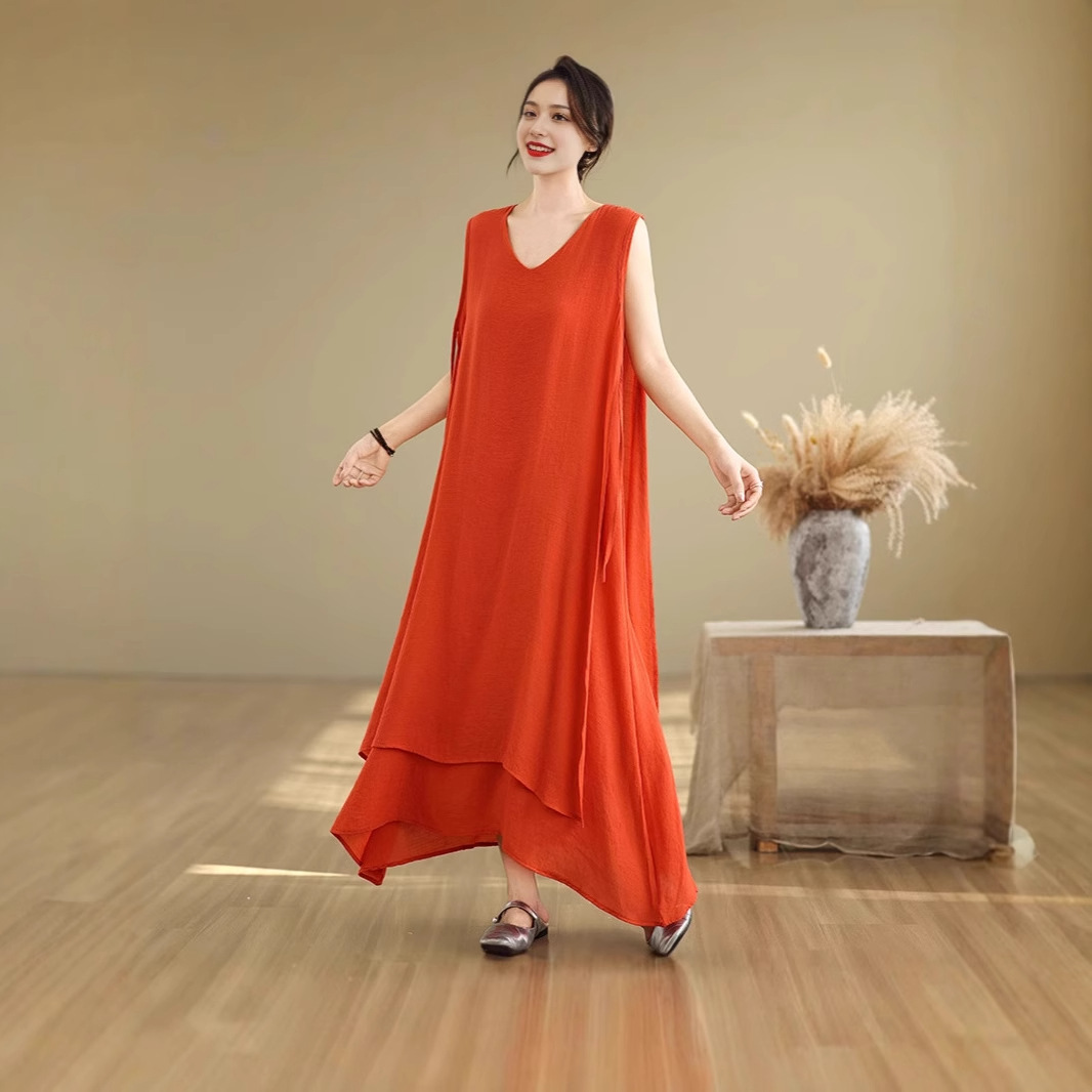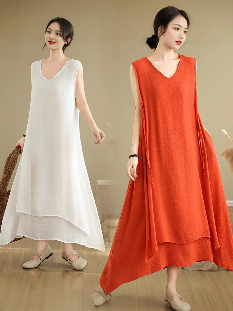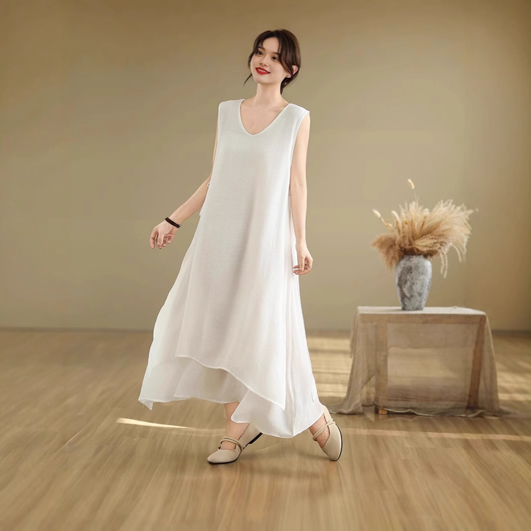 Китайский стиль без рукавов двухслойная юбка хлопчатобумажная юбка льняная длинное нижнее платье литературный фанатский жилет длинное платье