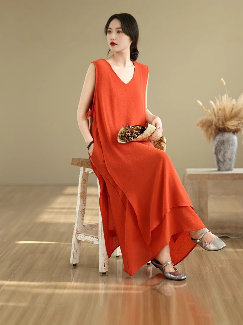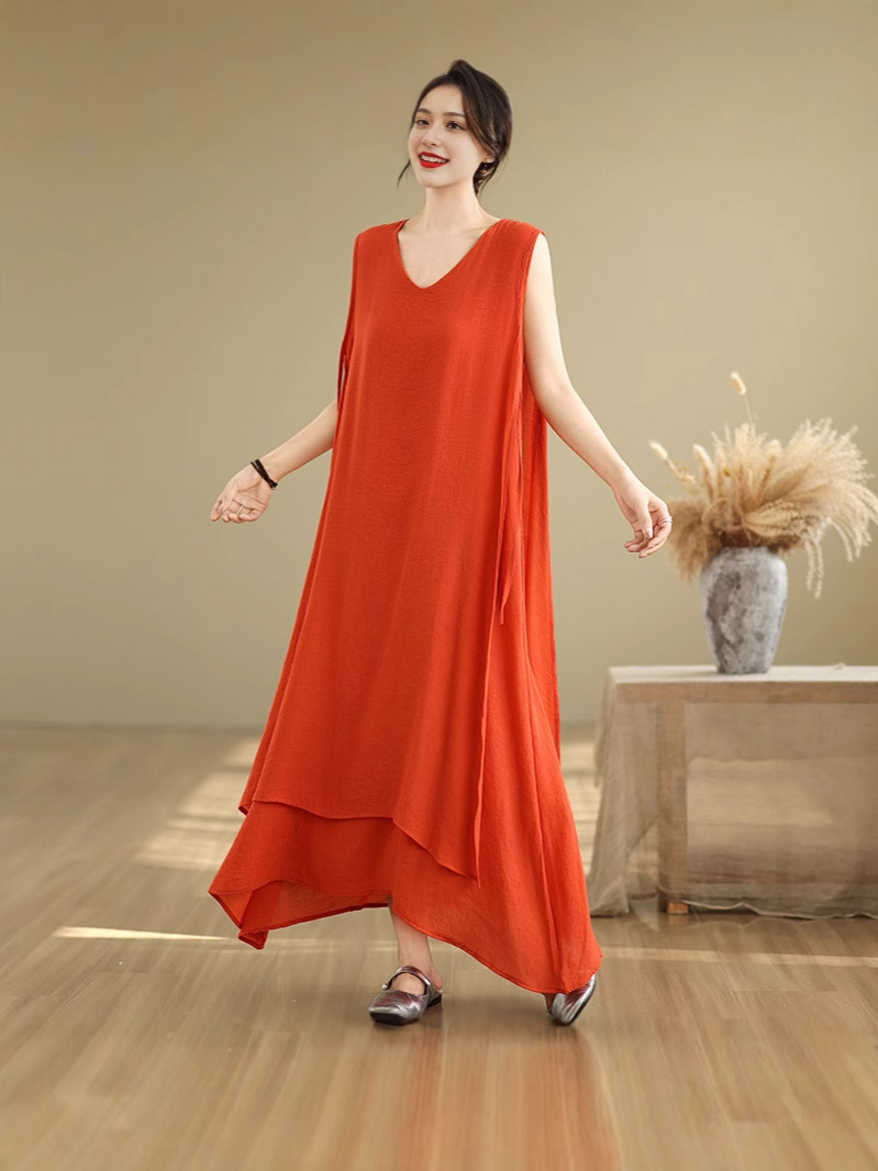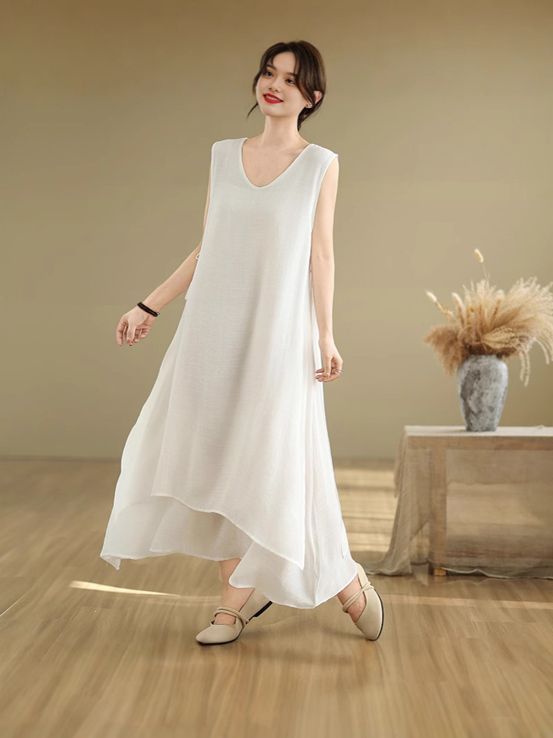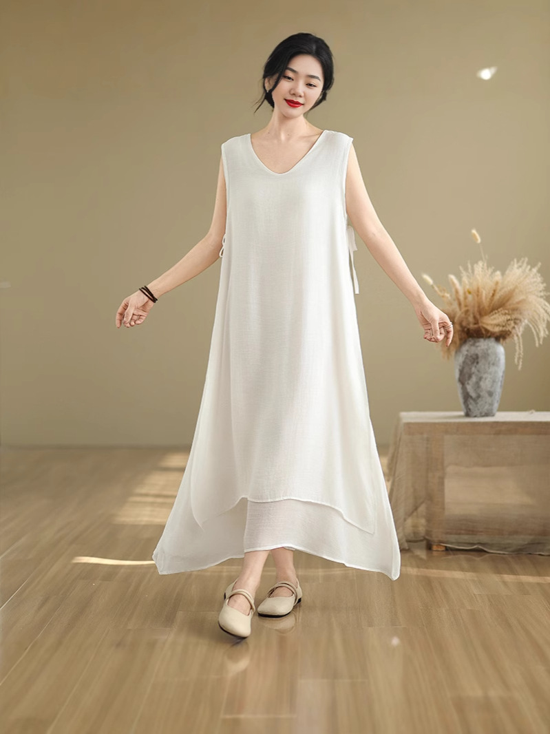 Китайский стиль без рукавов двухслойная юбка хлопчатобумажная юбка льняная длинное нижнее платье литературный фанатский жилет длинное платье
