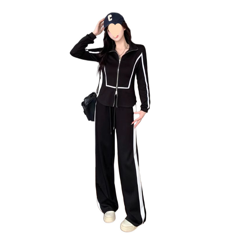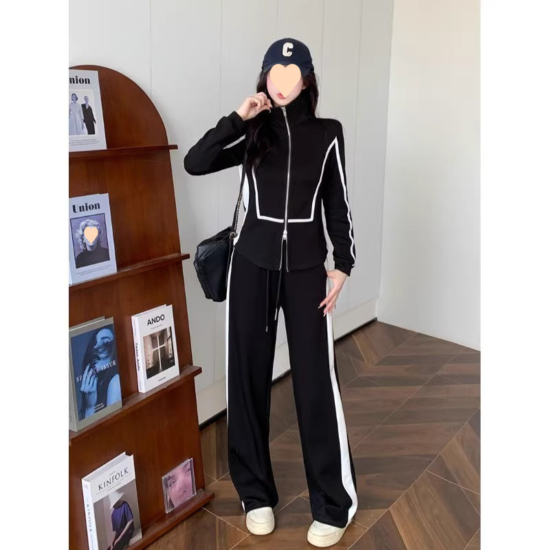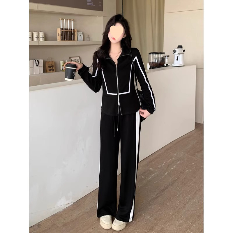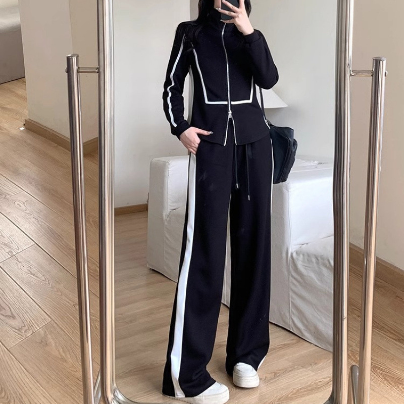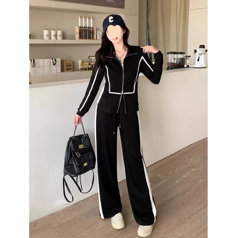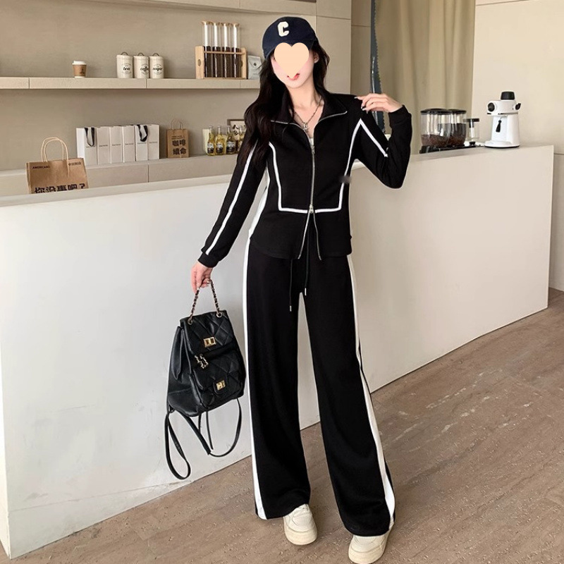 300 фунтов больших размеров осенние широкие брюки повседневная куртка на молнии свитер женский костюм толстый, чтобы покрыть живот, тонкий набор из двух частей