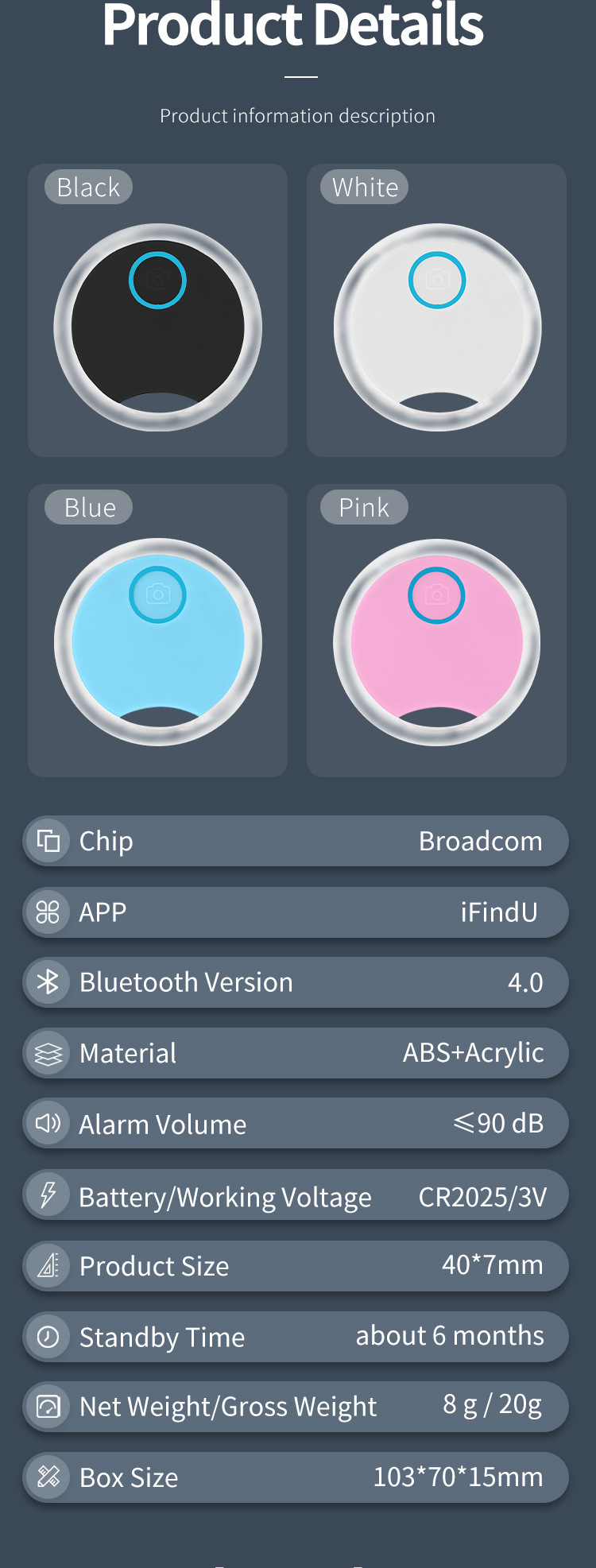 3.超级功耗绿色环保:采用新的Bluetooth5.0低功耗技术,一粒CR2032纽扣电池可持续待机时长6个月。