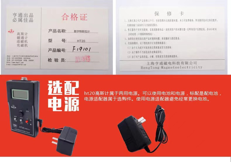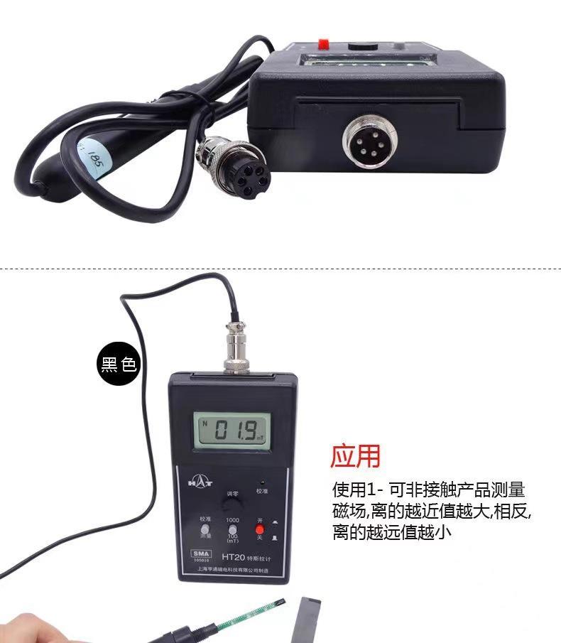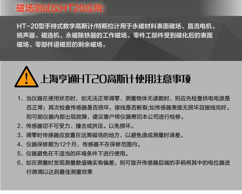 HT20型便携式数字高斯计,永磁材料表面磁场、直流电机、扬声器、磁选机、永磁除铁器的工作磁场。该款便携式高斯计用途广泛,价格便宜,质量可靠.