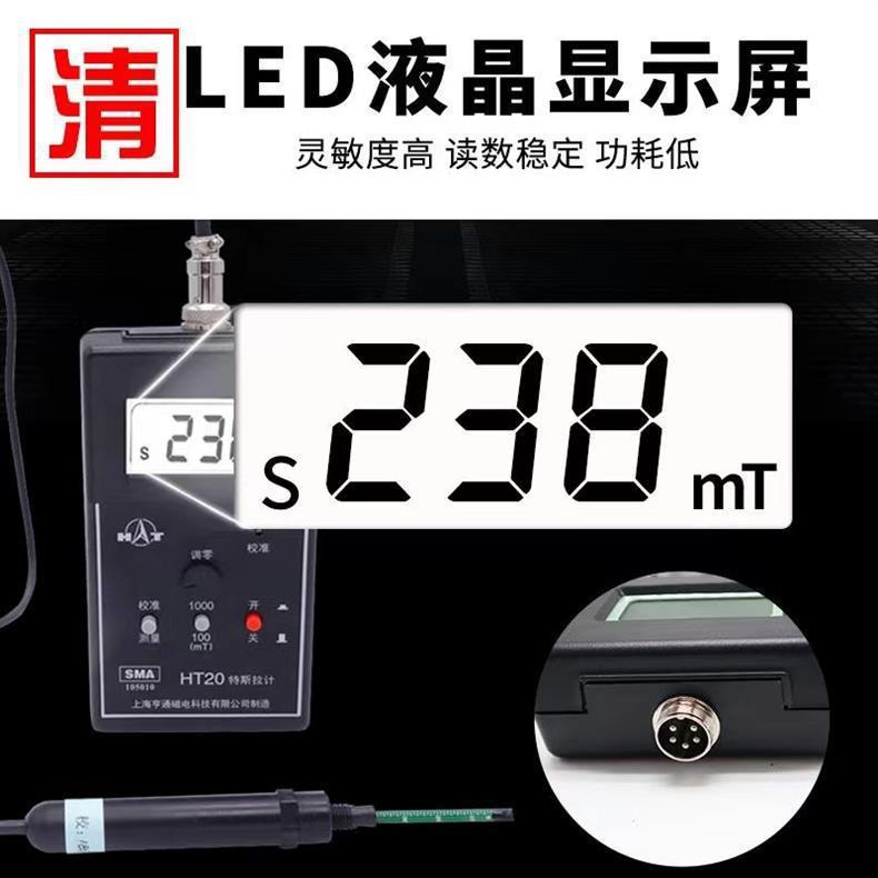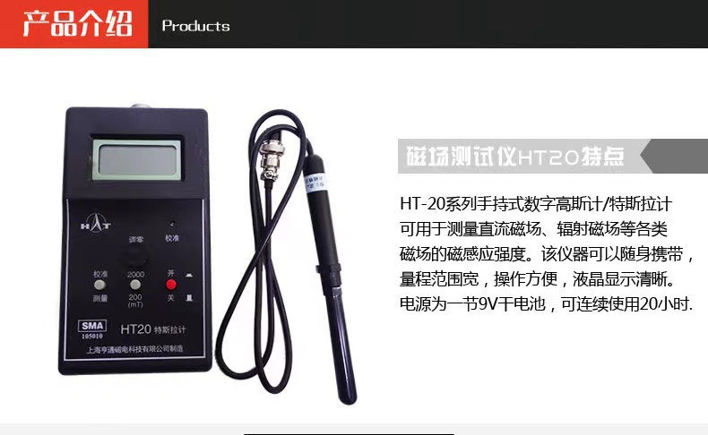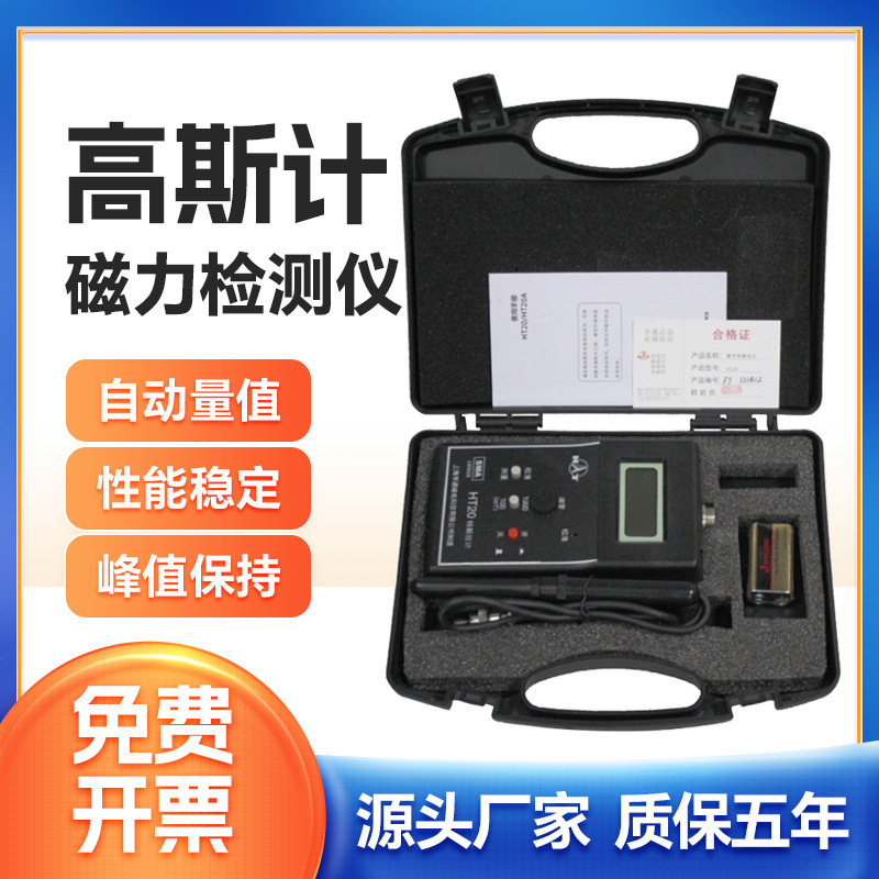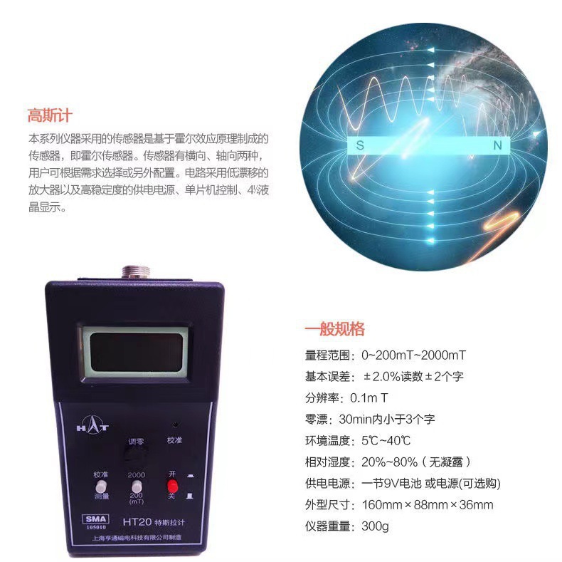 HT20系列便携式数字高斯计/特斯拉计可用于测量直流磁场、交流磁场、辐射磁场等各类磁场的磁感应强度。该便携式高斯计可以随身携带,量程范围宽,操作方便,液晶显示清晰。