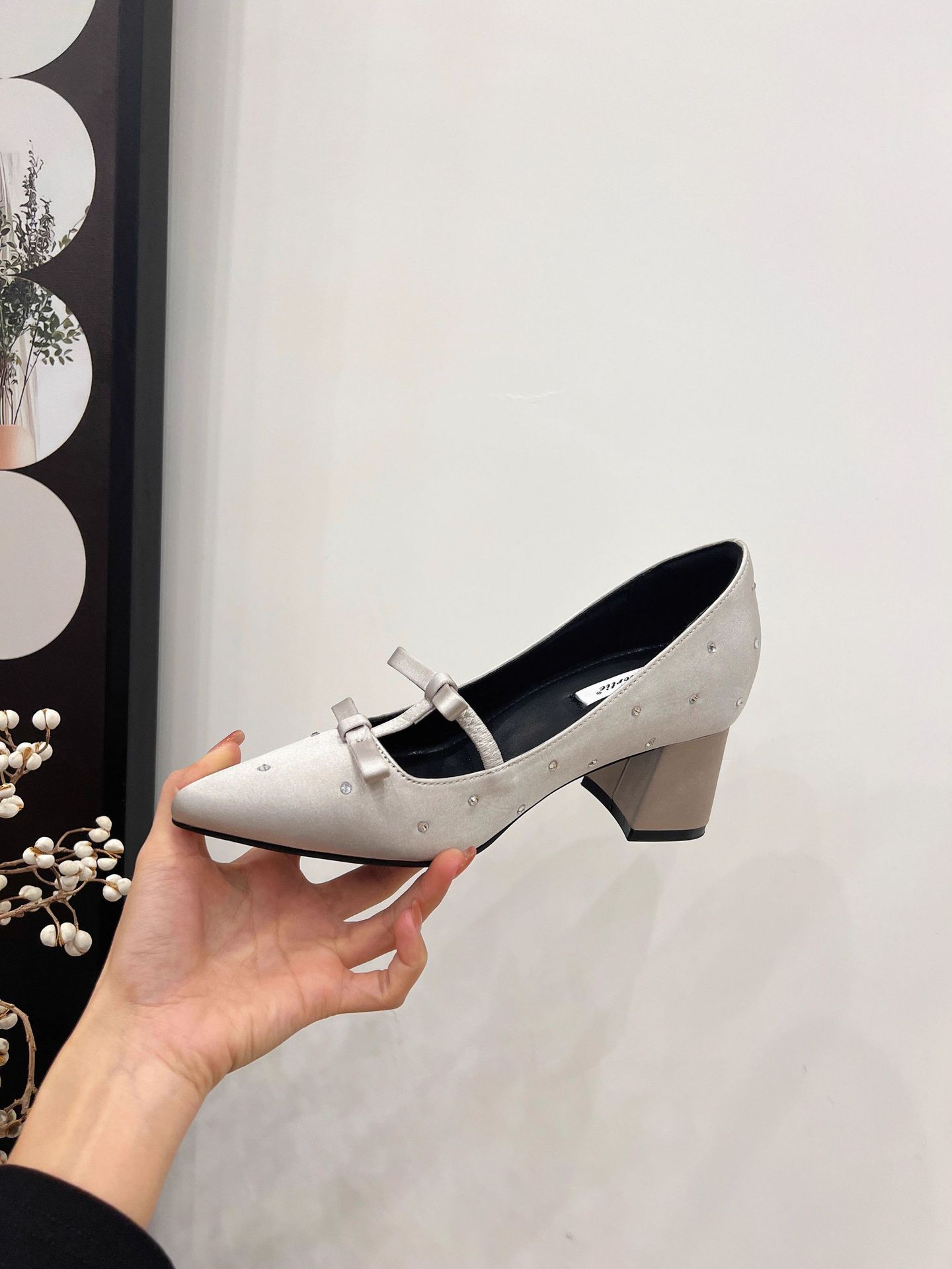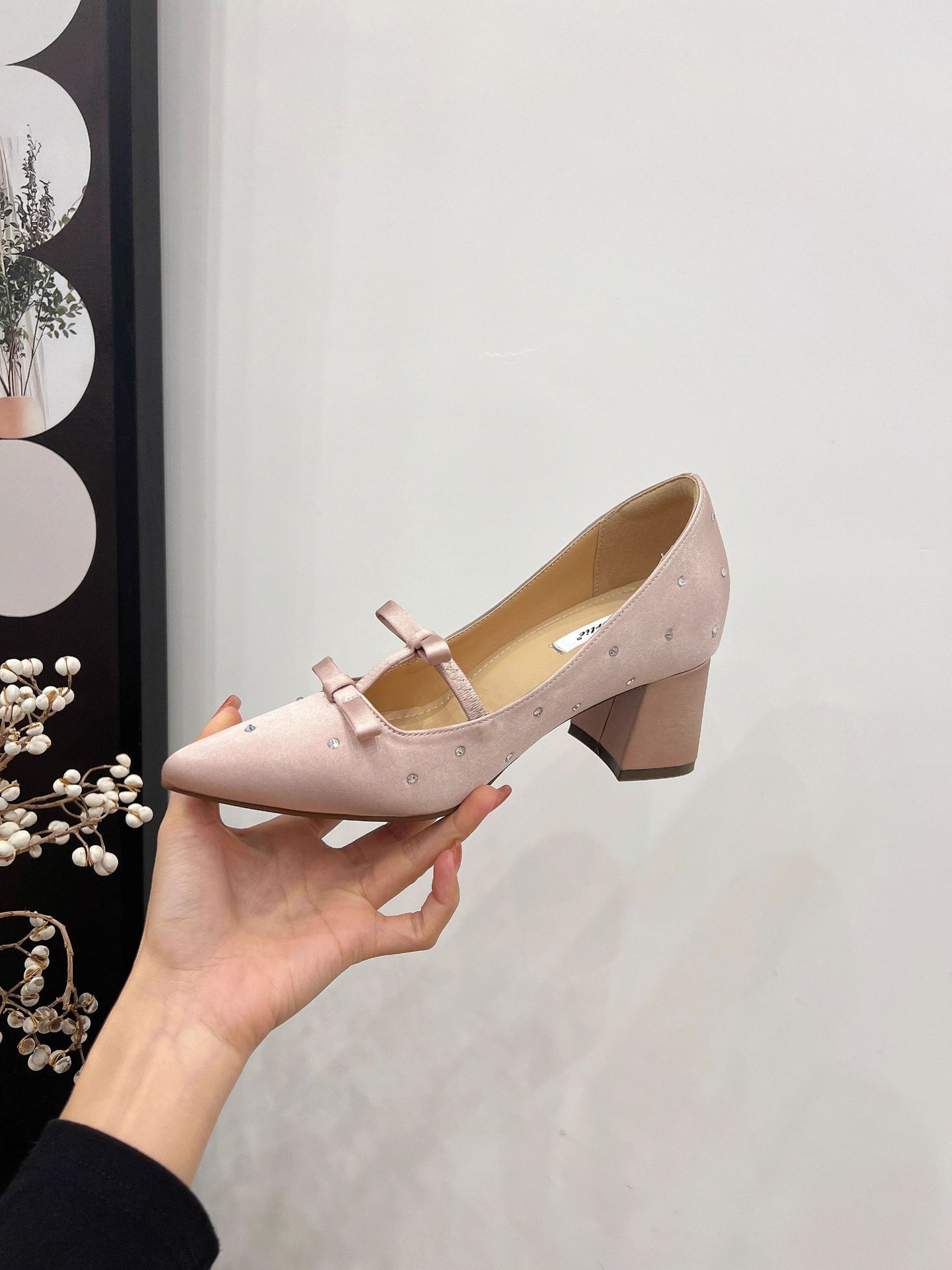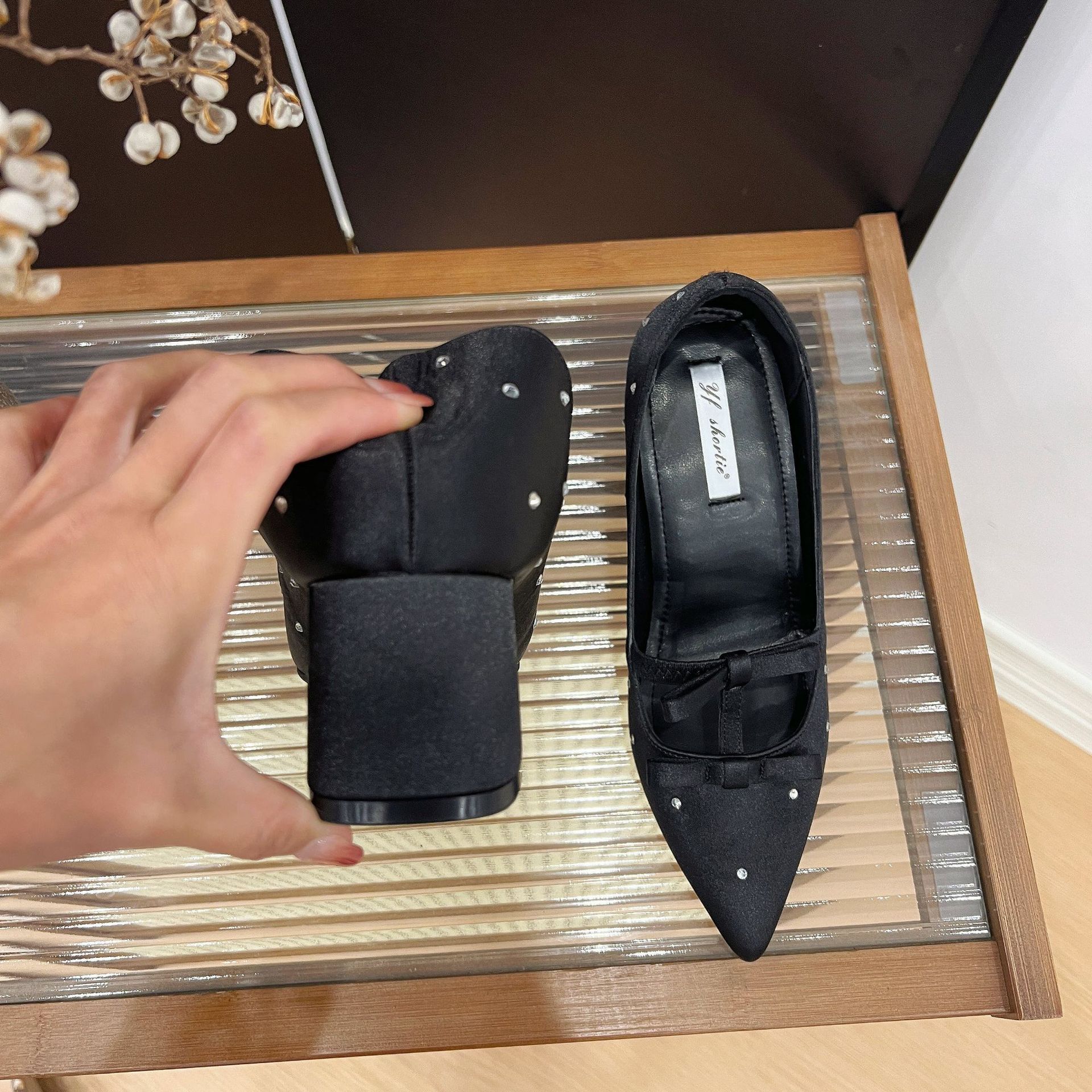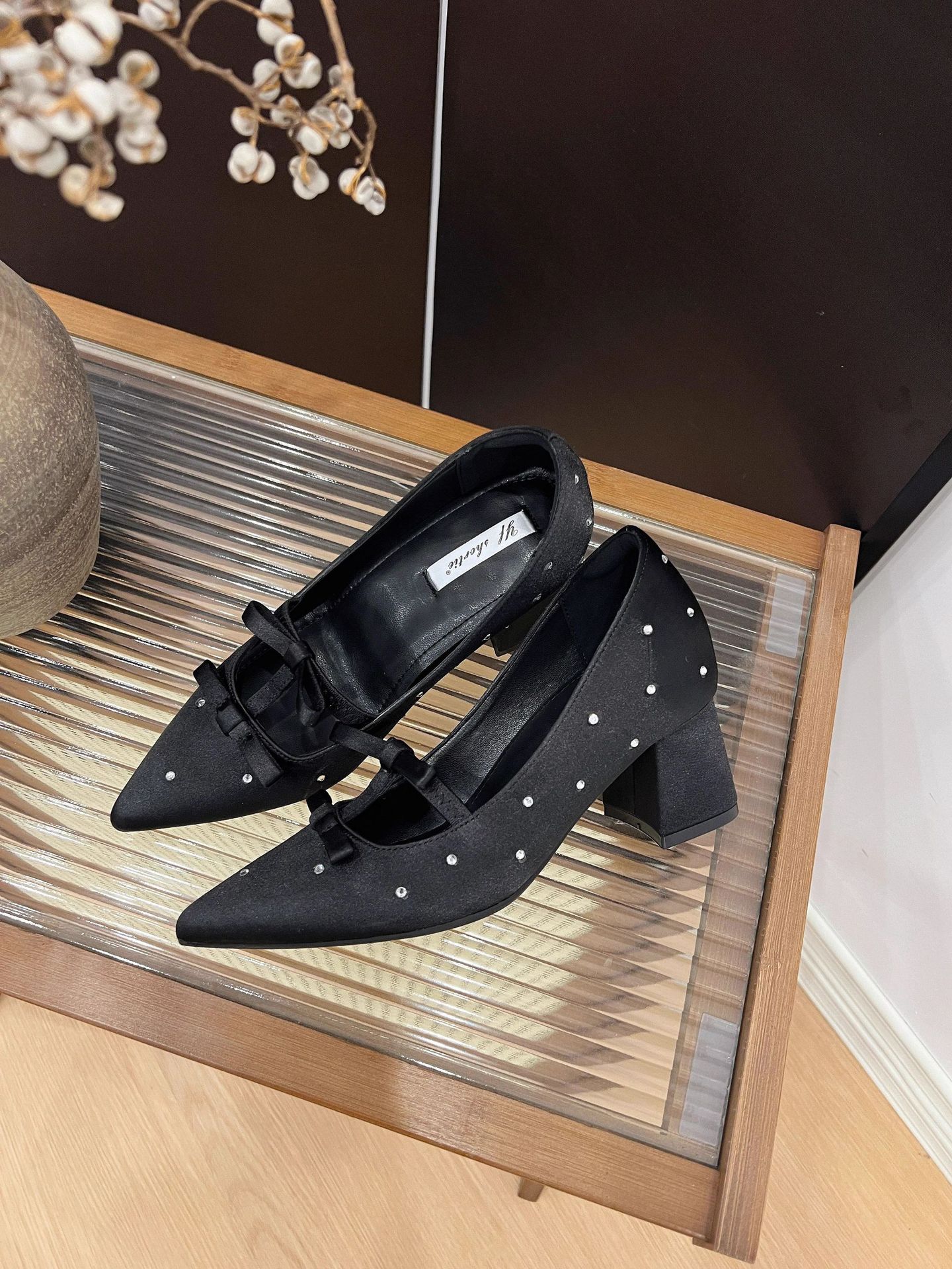 Женские туфли с атласным бантом на толстом каблуке кроссовки 2025 новый стиль премиум-класса чувство страз на высоких каблуках