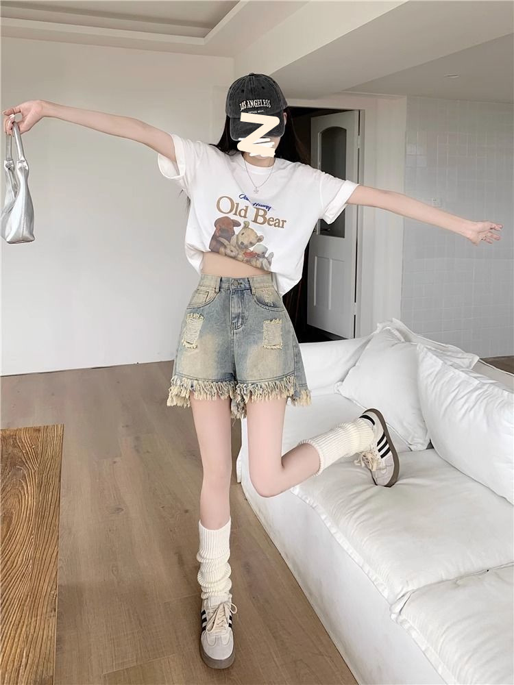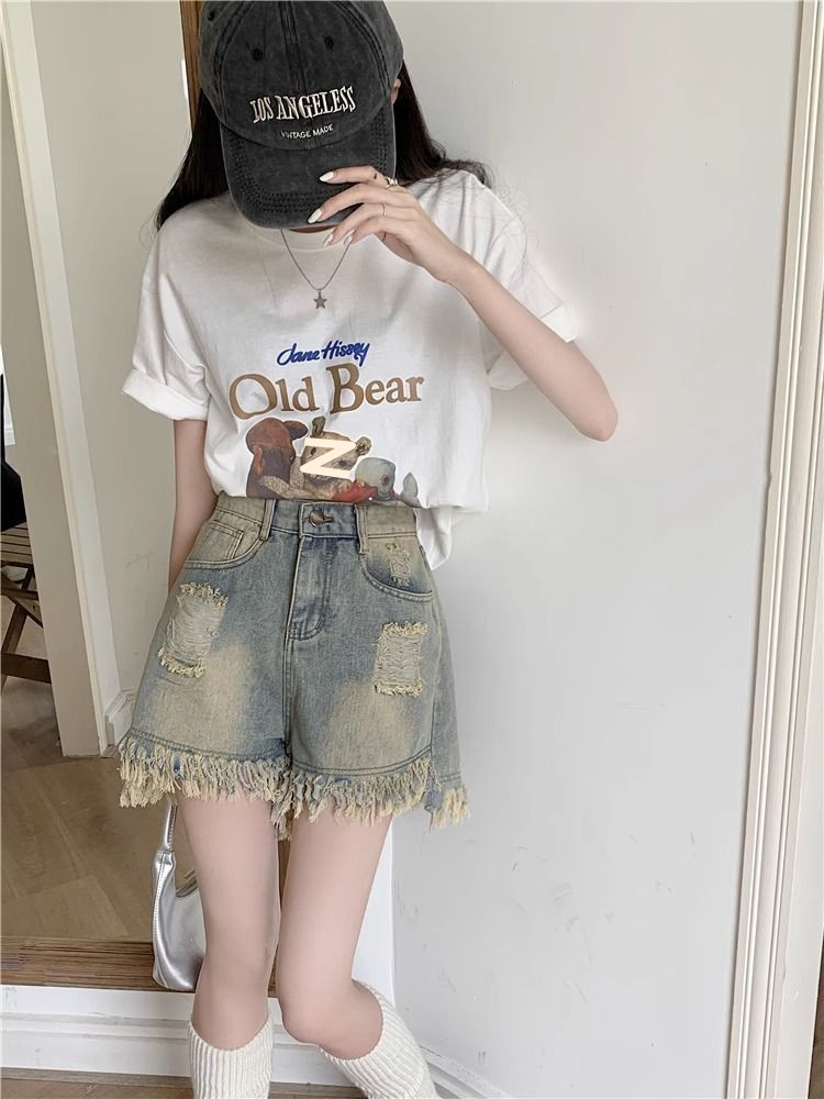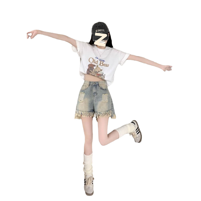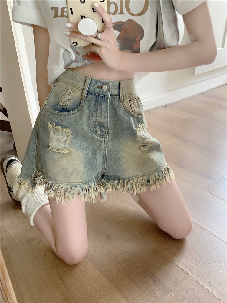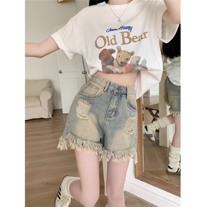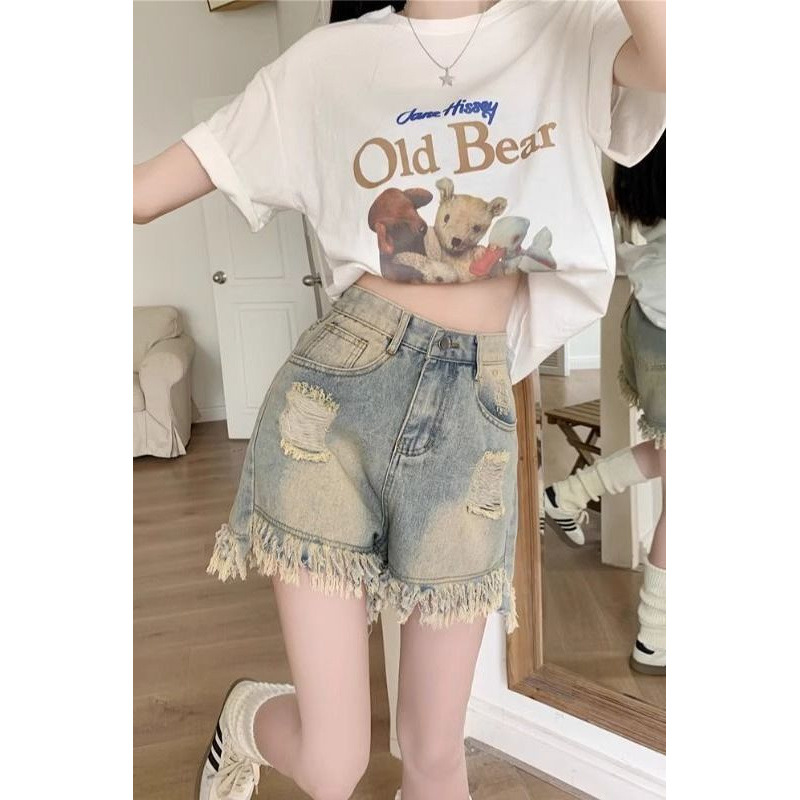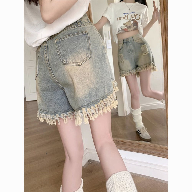 Лето 2025 новые стирание старые джинсовые шорты женские высокие талии, кисточки, широкие шорты дизайн