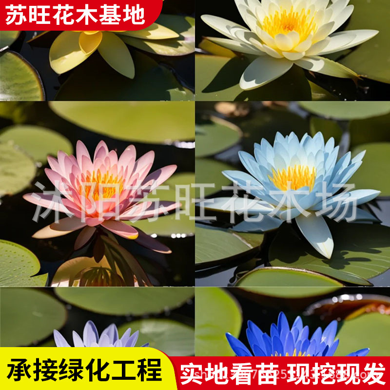 [Большая водяная лилия] цветущие розовые цветы; [Большая водяная лилия] цветет белыми цветами; [Большая водяная лилия] имеет желтые цветы.; [Большая водяная лилия] Цветет фиолетовым цветом.; [Маленькая водяная лилия] Цветы расцветают в случайных цветах.