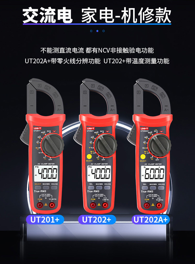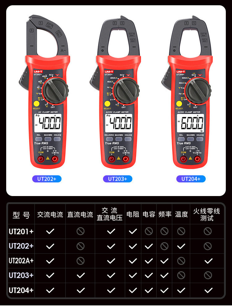 UT200A (ручной диапазон 200 А); UT200B (ручной диапазон 600 А); UT201+ (автоматический диапазон 400 А); UT202+ (автоматический диапазон 400 А с температурой); UT202A+ (автоматический диапазон 600 А); UT203+ (переменный/постоянный ток, частота 400 А); UT204+ истинный среднеквадратичный переменный и постоянный ток 600 А; UT204A Конденсатор частоты переменного и постоянного тока 600 А; Конденсатор UT210D True RMS переменного и постоянного тока, 200 А; UT210E True RMS преобразование частоты емкости, защита от помех; UT211B истинное среднеквадратичное значение переменного и постоянного тока 60 А; UT213A Фонарик с конденсатором переменного тока, 400 А; UT213B True RMS AC 400A Температура; UT213C True RMS AC 400A Емкость; UT216A Справедливая среднеквадратическая мощность переменного тока 600 А; UT216B Справедливая среднеквадратическая мощность переменного тока 600 А; UT216C истинный среднеквадратичный ток переменного и постоянного тока 600 А