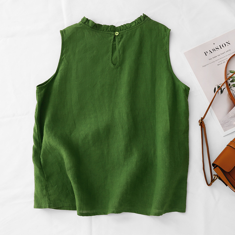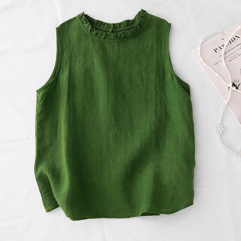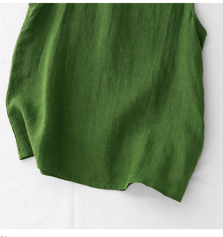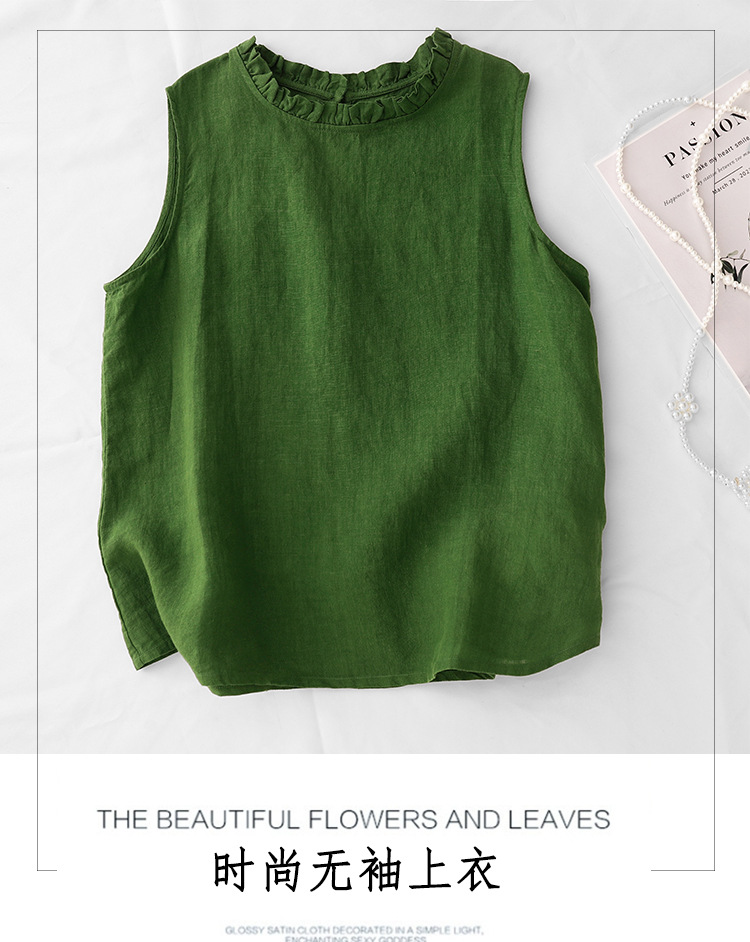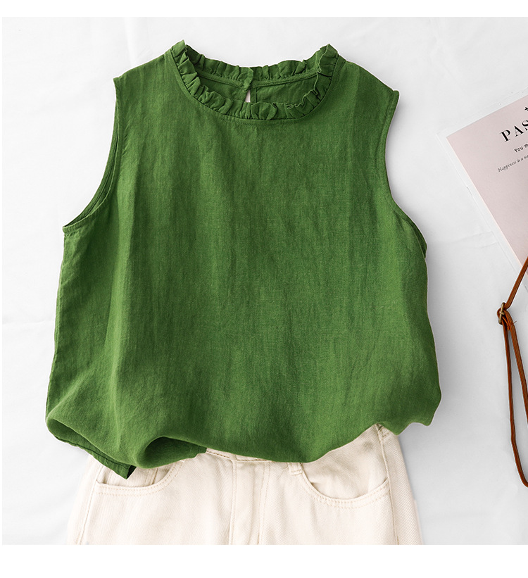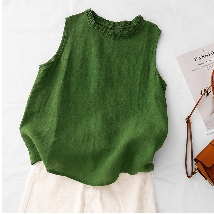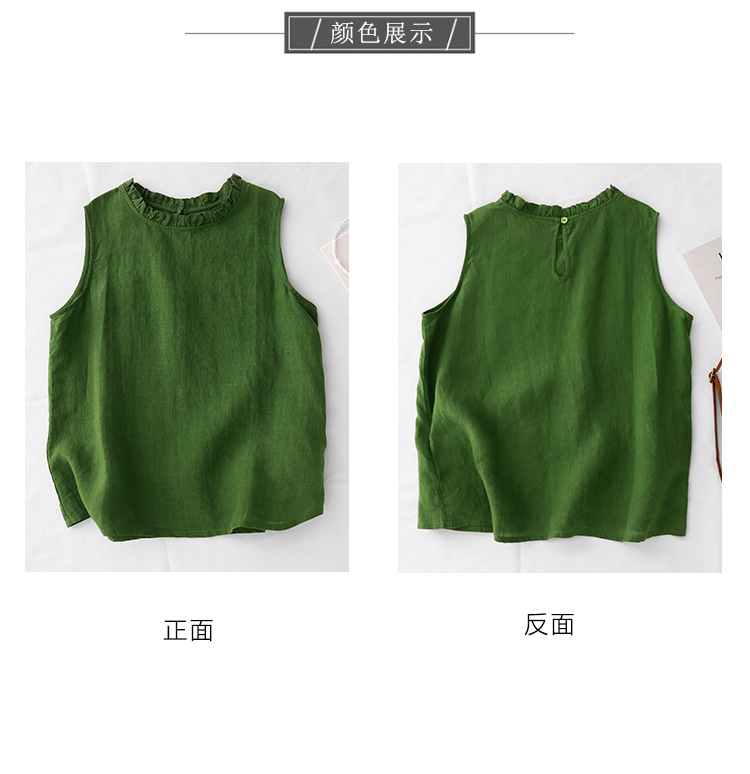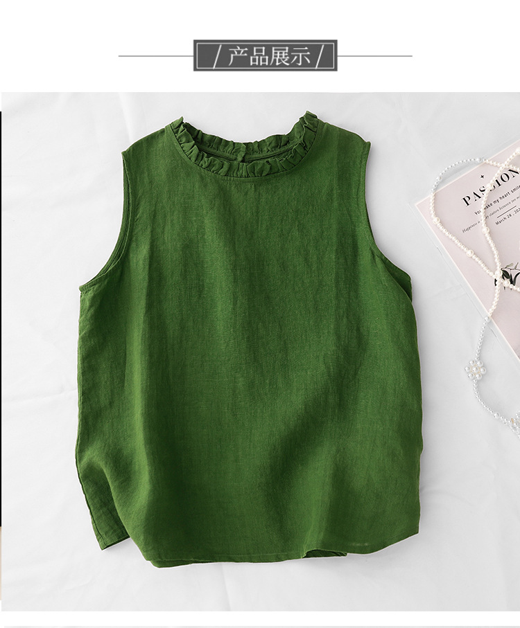Реальный выстрел льняной зеленый жилет женский 2025 летний новый нишевой дизайн деревянный ушной воротник без рукавов
