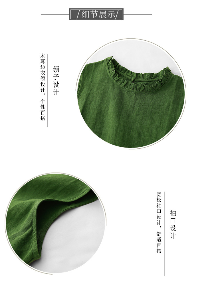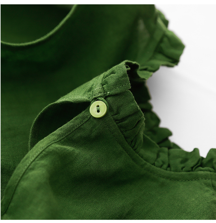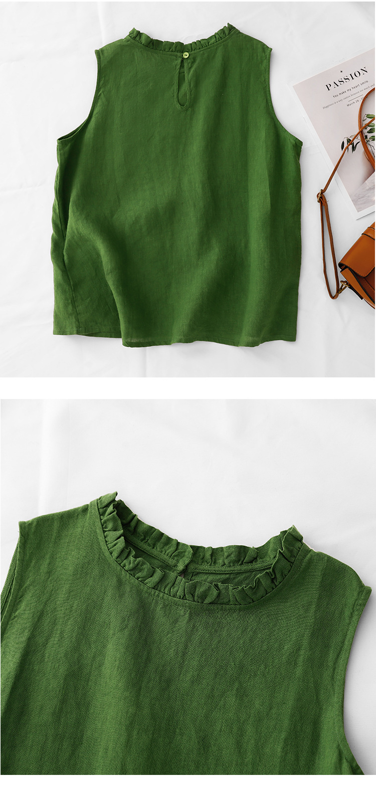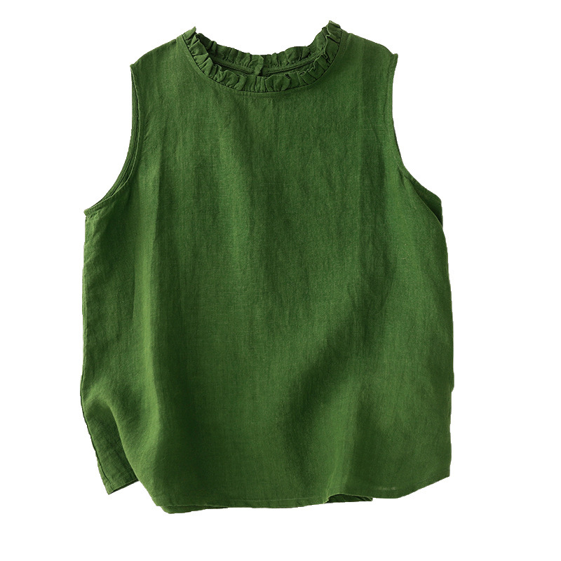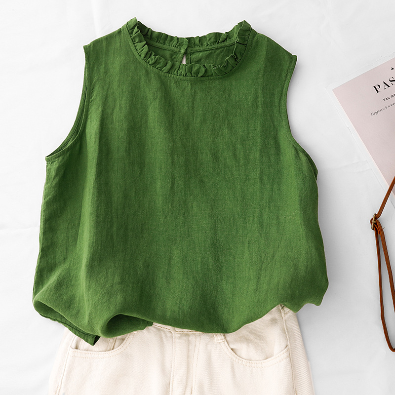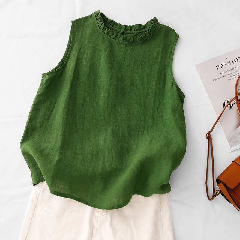 Реальный выстрел льняной зеленый жилет женский 2025 летний новый нишевой дизайн деревянный ушной воротник без рукавов