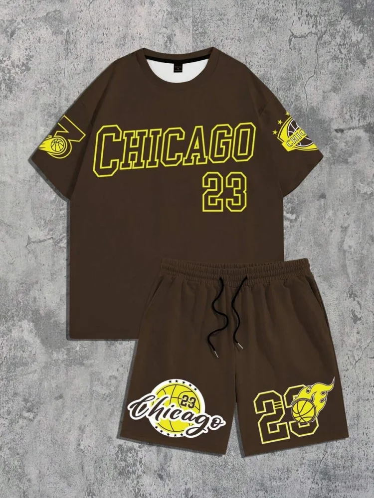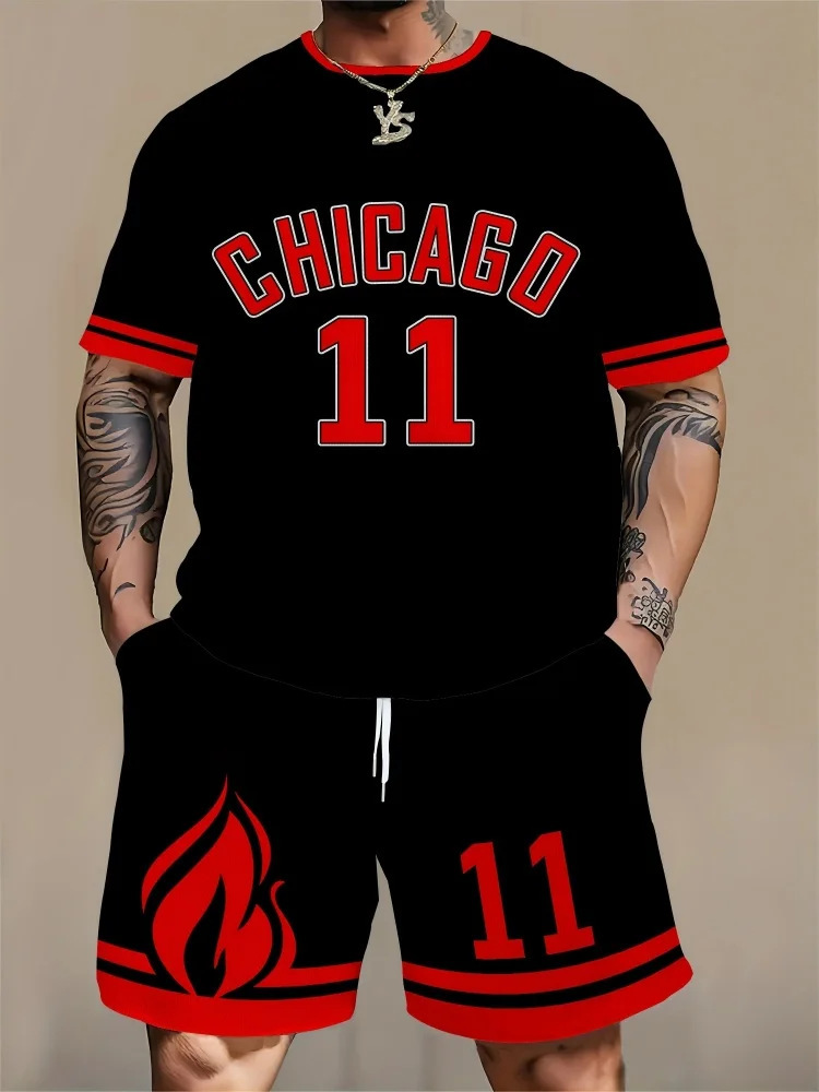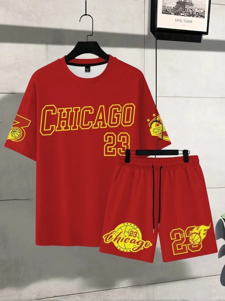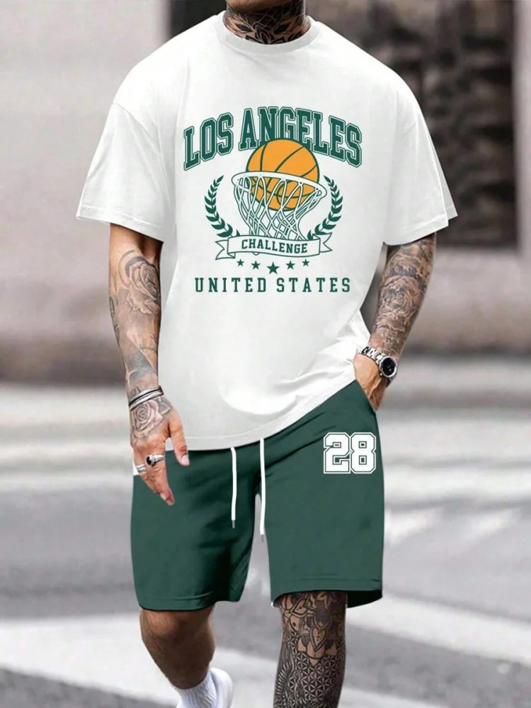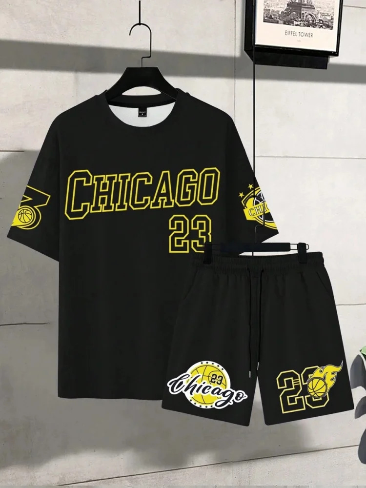 Трансграничная мода баскетбольная футболка открытый спорт мужская футболка с короткими рукавами шорты из двух частей набор букв 3D принт