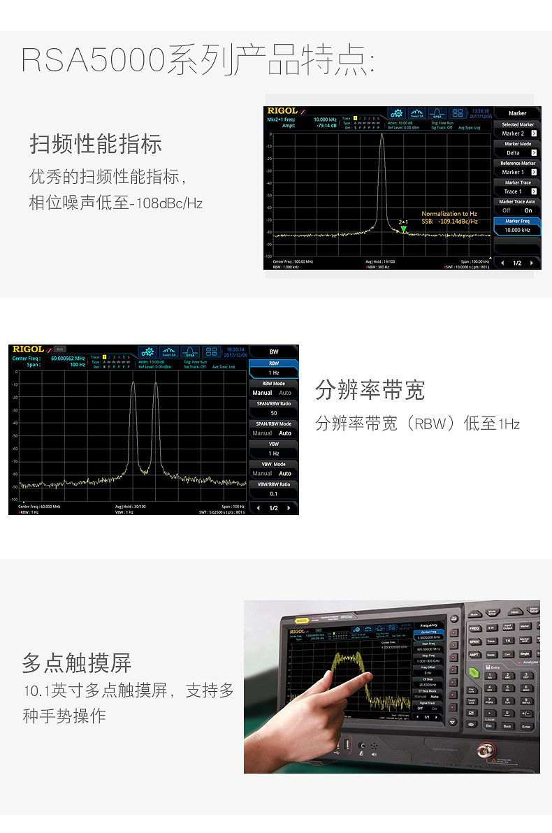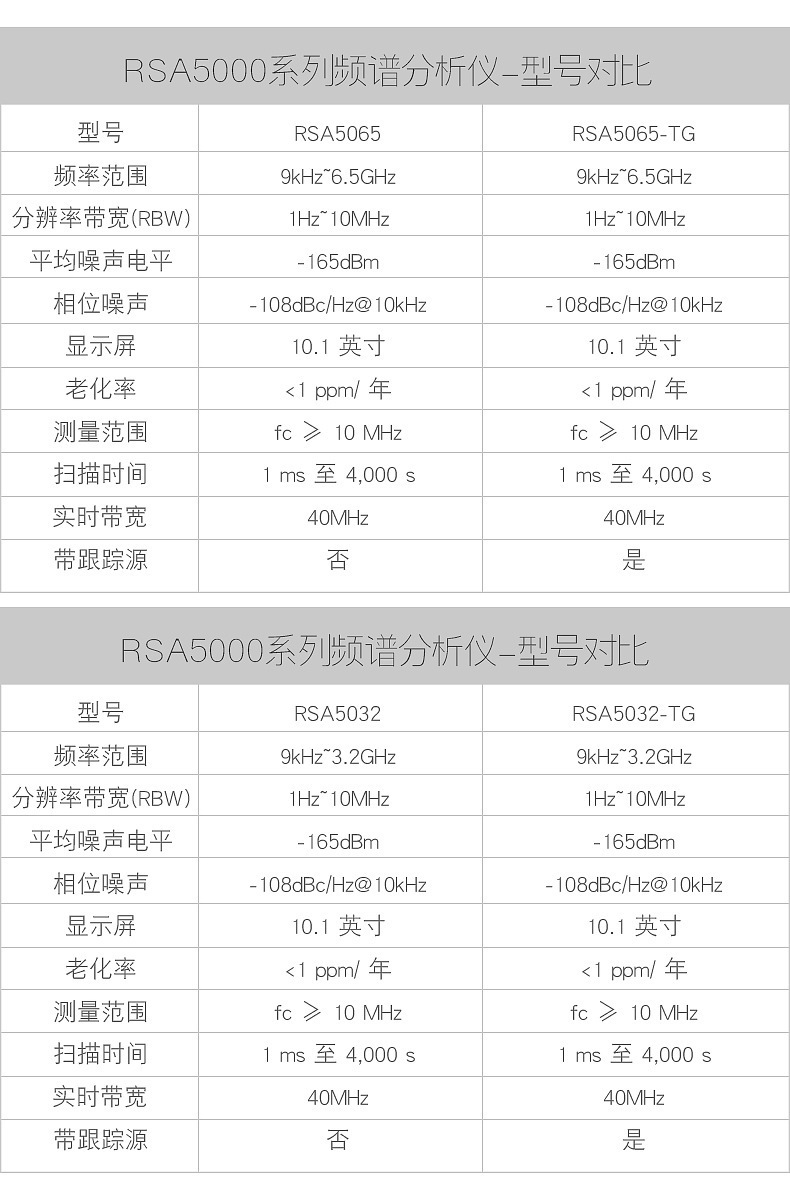 RSA5032(9KHz-3.2GHz); RSA5032N (9–3,2 ГГц) с функцией VNA; RSA5032-TG (с источником отслеживания); RSA5065(9KHz-6.5GHz); RSA5065N (9–6,5 ГГц) с функцией VNA; RSA5065-TG (с источником отслеживания); RSA5000-B40 (полоса пропускания анализа в реальном времени 40 МГц); RSA5000-EMI (прикладное программное обеспечение для измерения электромагнитных помех); RSA5000-AMK (классический измерительный комплект); RSA5000-PA (предусилитель); VB1080 (мостовая полоса КСВ) от 2 ГГц до 8 ГГц; VB1032 (мостовая полоса КСВ) от 1 МГц до 3,2 ГГц; NFP-3 (датчик ближнего поля) от 30 МГц до 3 ГГц; TX1000 (демонстрационный комплект RF)