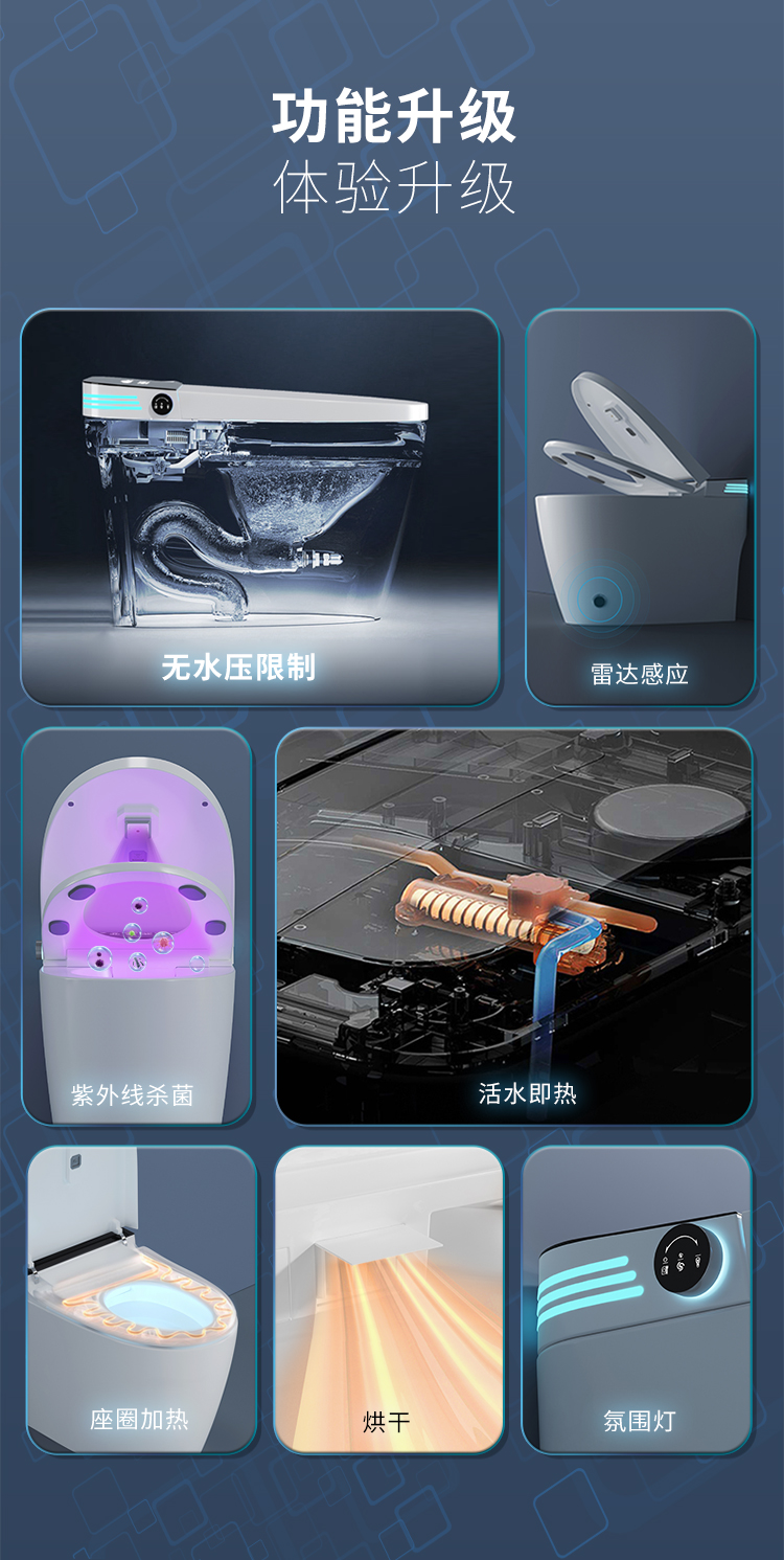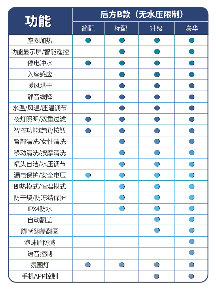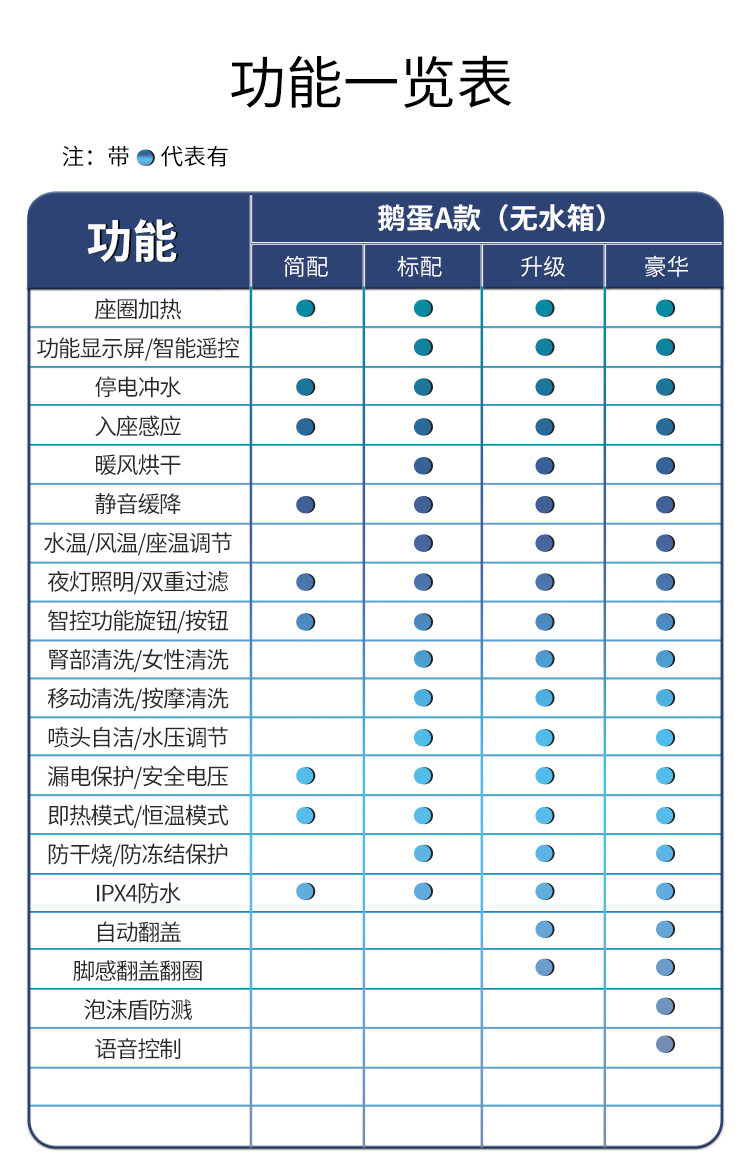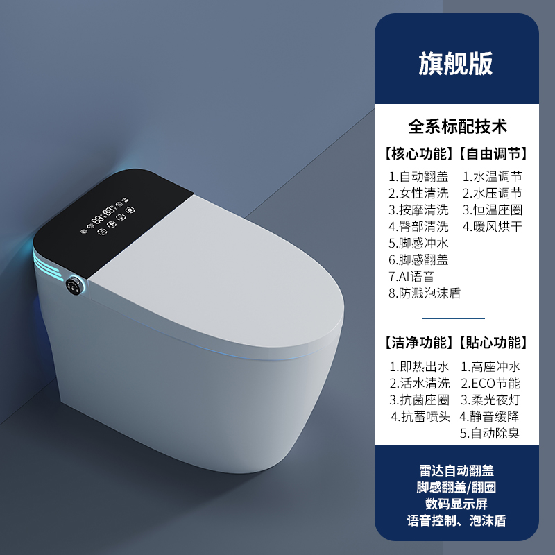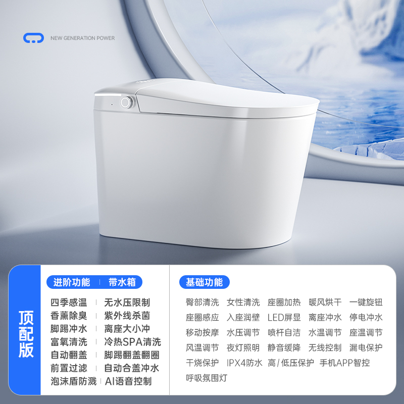 дистанционное управление; Бустерный насос; сухой; Тип мгновенного нагрева; Регулировка температуры воды; Умыть ягодицы; женщины стирают; Подогрев сидений; Самоочистка сопла; Автоматическая дезодорация; Очистка движущейся насадки; Голосовое управление; Температура нагревающей воды; Отрегулируйте нагрев; Индукционная откидная крышка; пенопластовый щит; Система ароматерапии; Нет ограничения давления воды; Промывка при отключении электроэнергии; удар ногой; удар ногой; Двойной режим срабатывания; Тепло четырех времен года; Регулировка давления промывочной воды