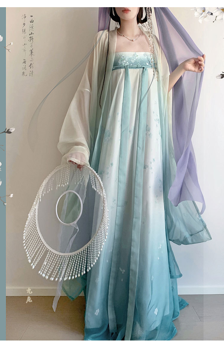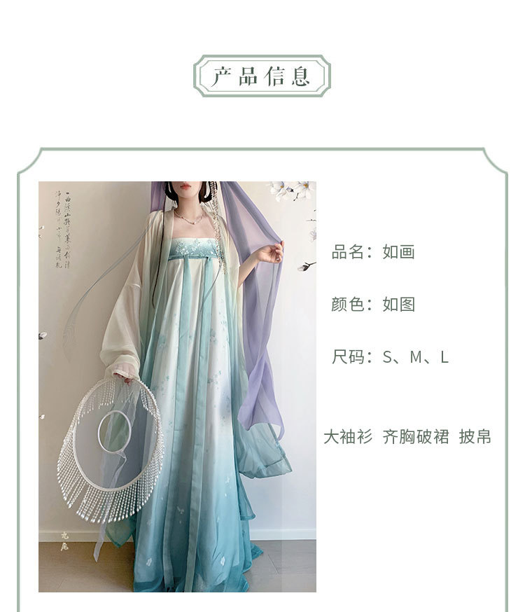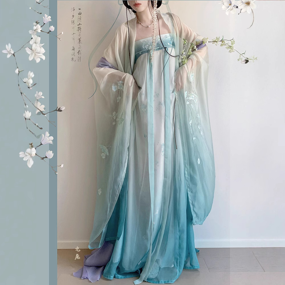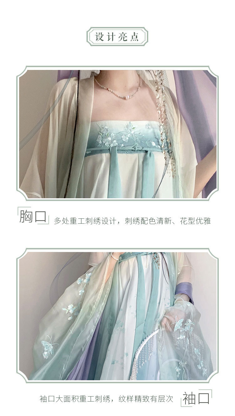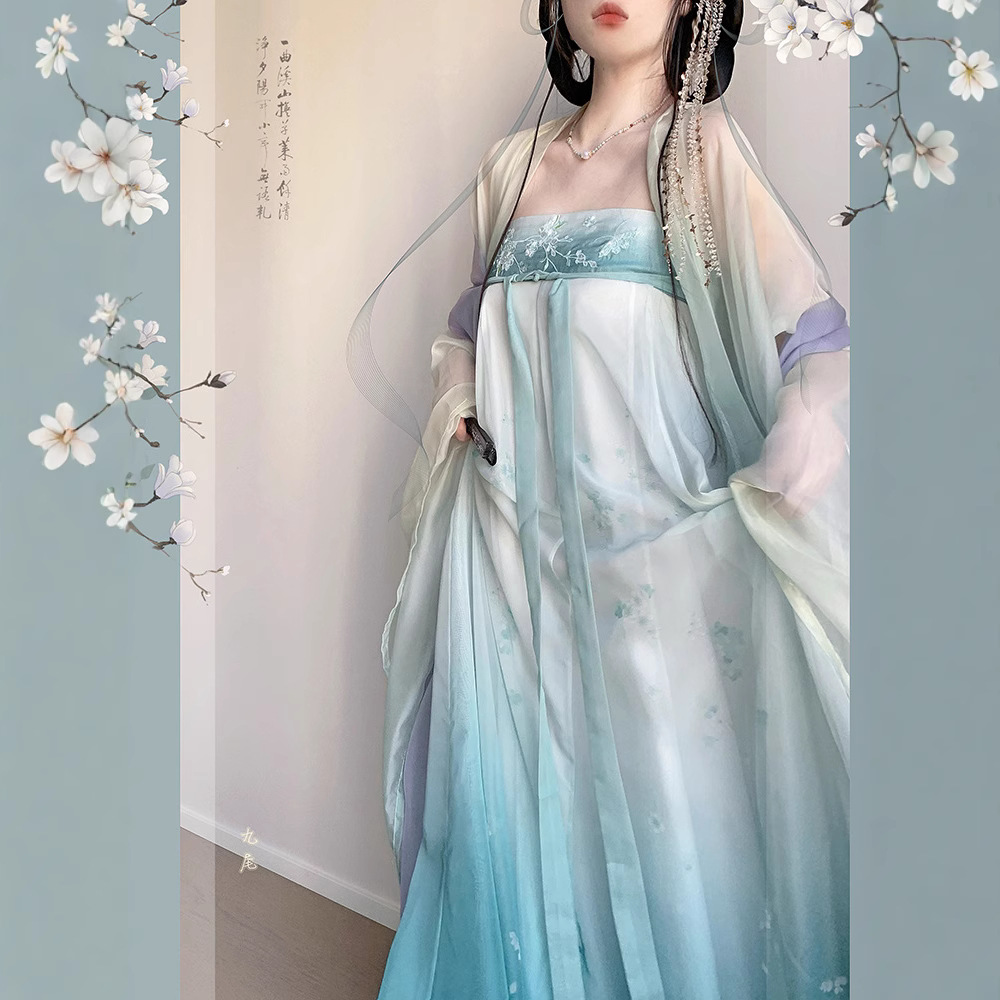 Оригинальное ханфу [как в картине] в стиле Тан: юбка до груди с разрезом, с обильной вышивкой и широкими рукавами, повседневный женский стиль весна/лето.