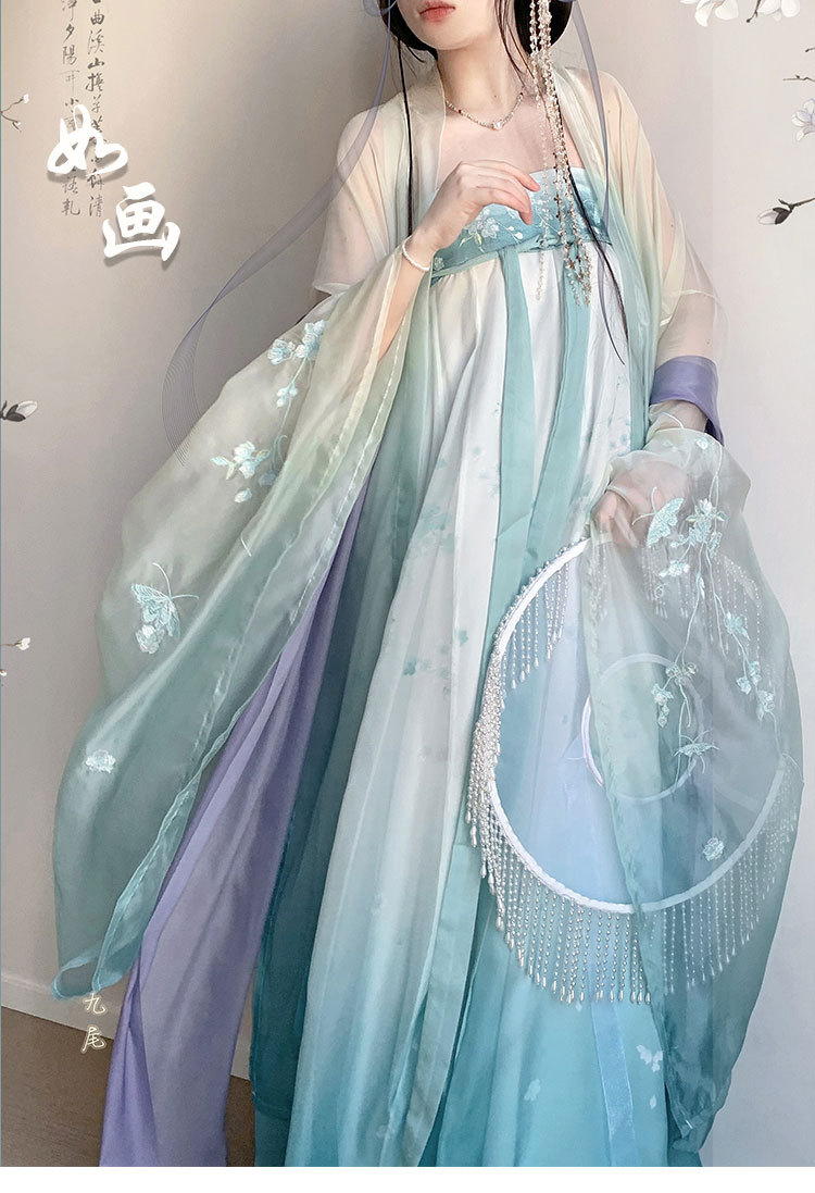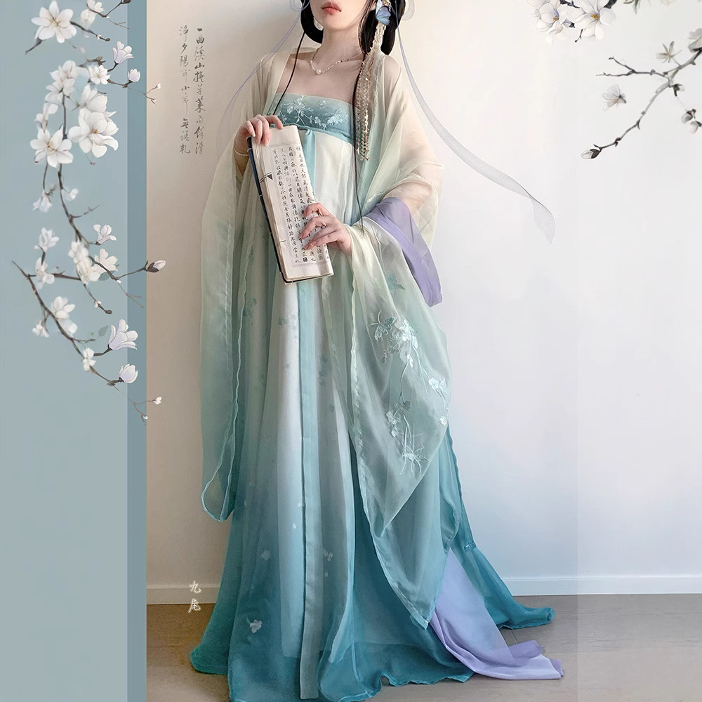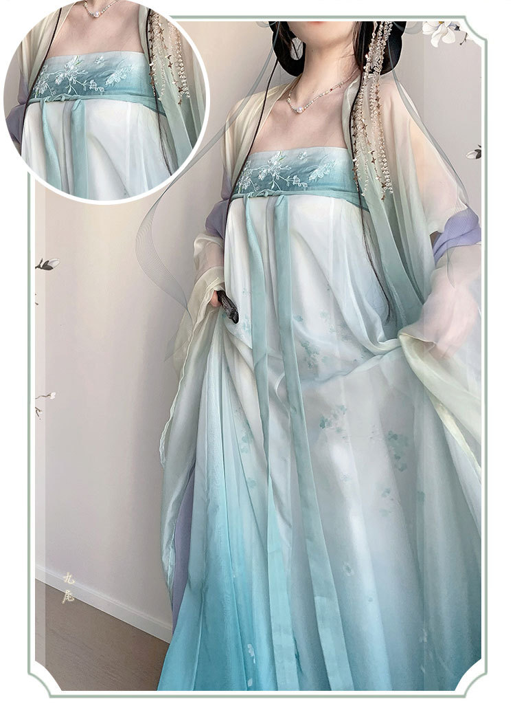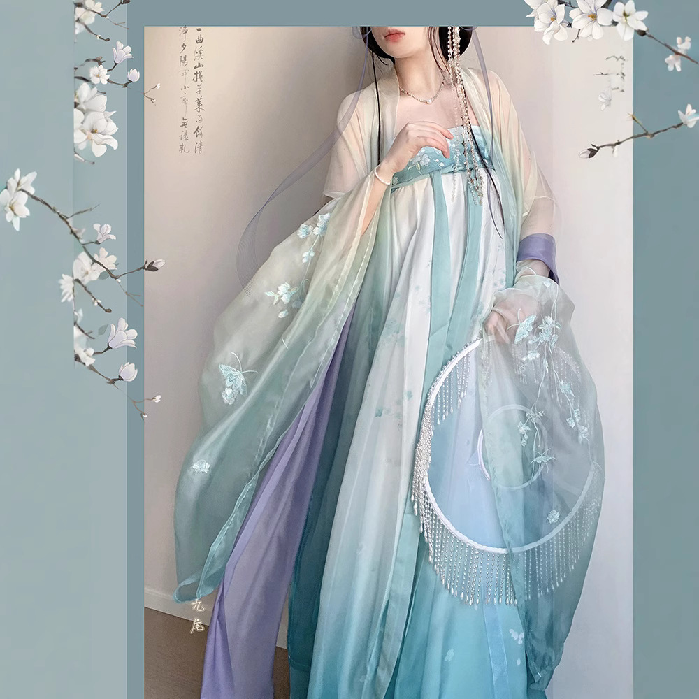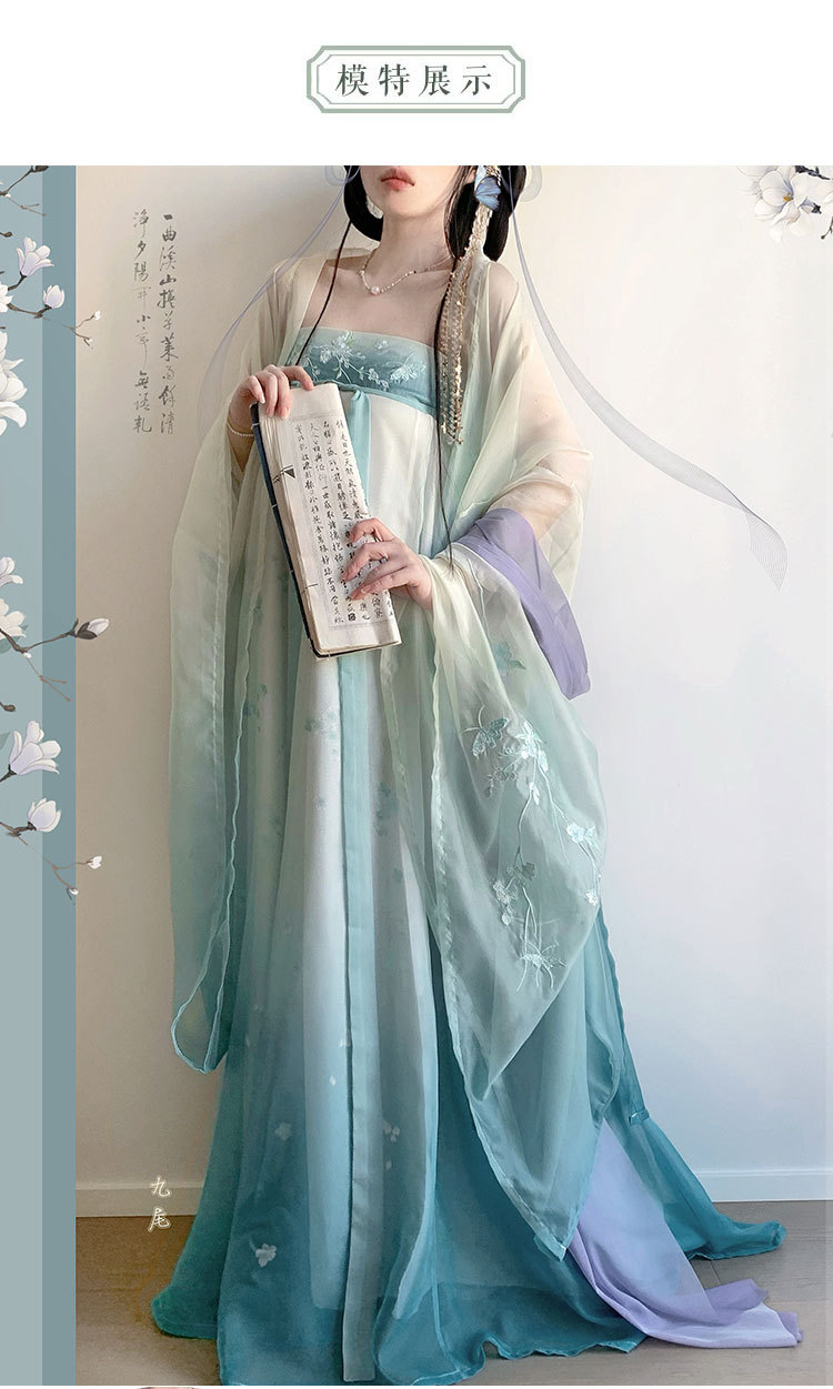 Оригинальное ханфу [как в картине] в стиле Тан: юбка до груди с разрезом, с обильной вышивкой и широкими рукавами, повседневный женский стиль весна/лето.