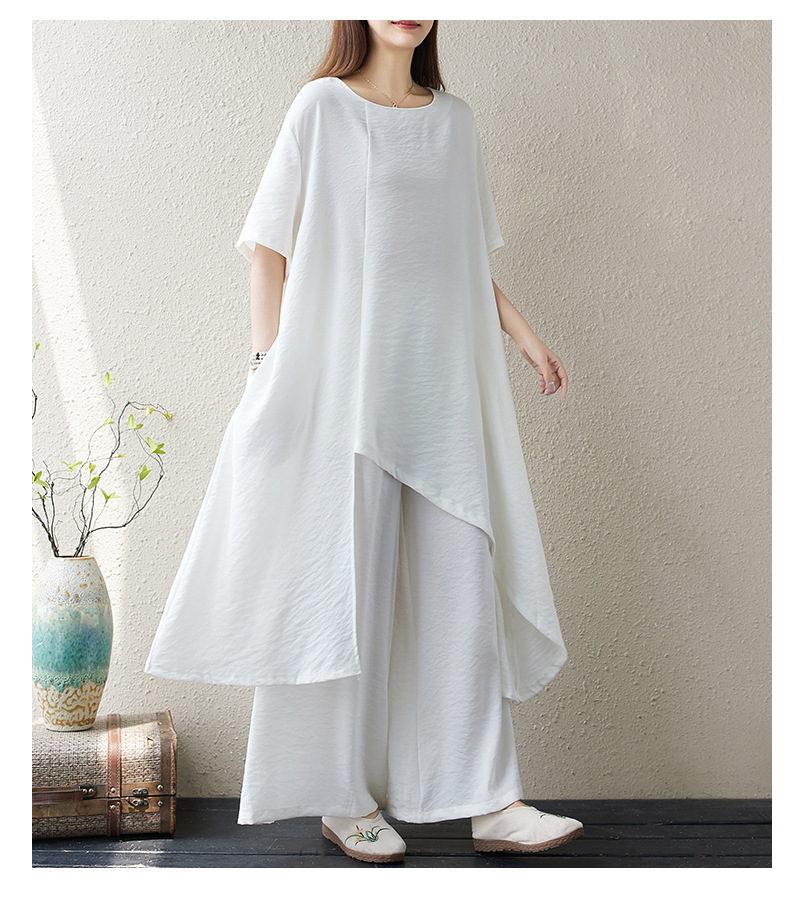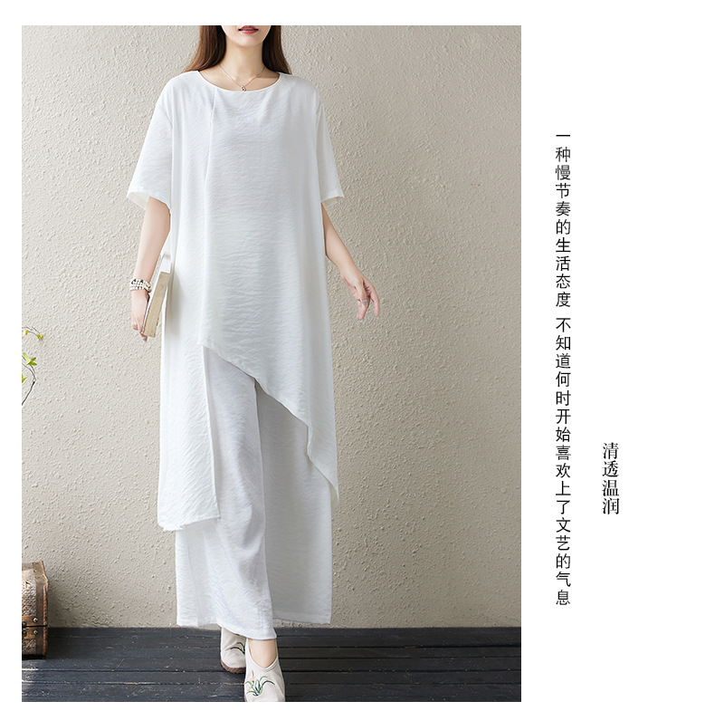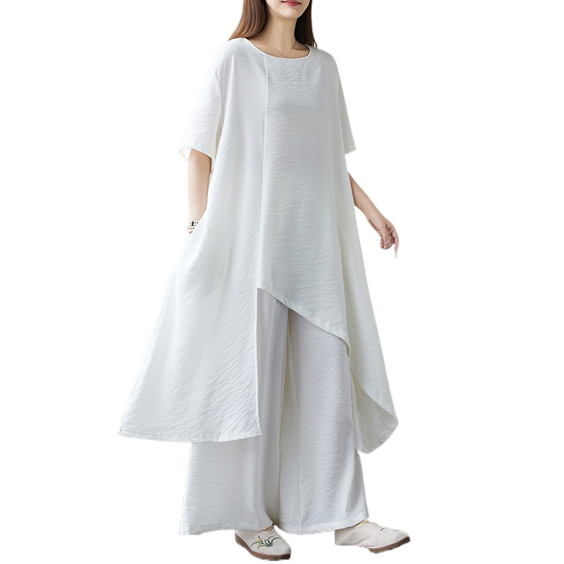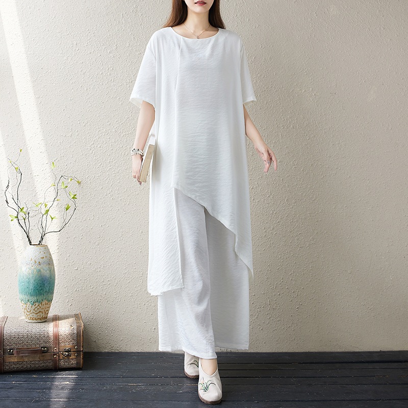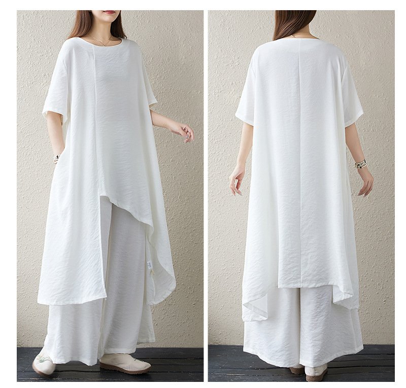 Реальная съемка большого размера индивидуальность нерегулярный набор из хлопка и льна для женщин длинная тонкая белая рубашка с широкими брюками весной и летом
