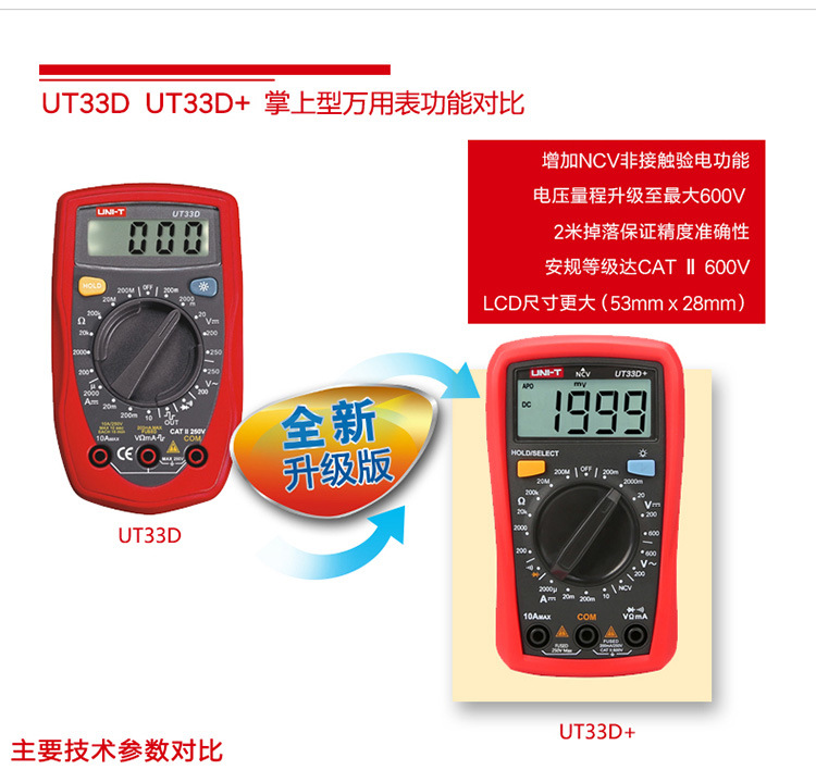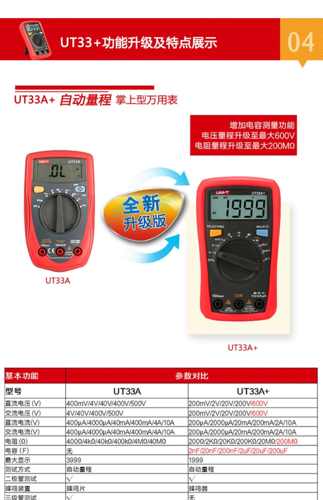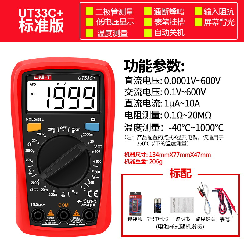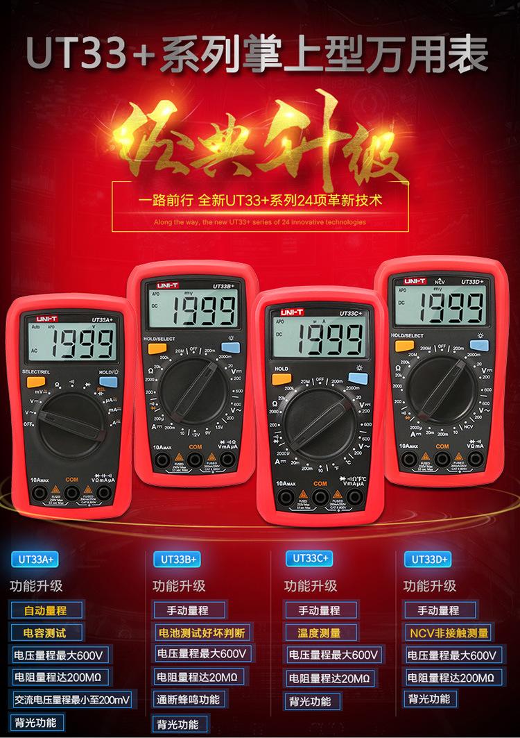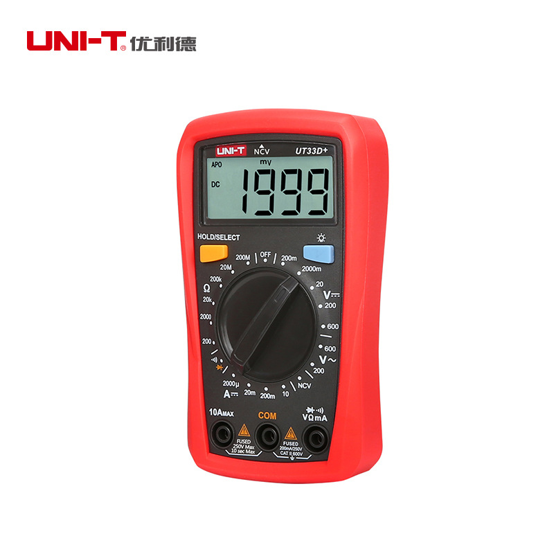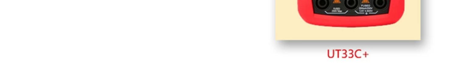 UT33A+ (измерение емкости с автоматическим диапазоном) поставляется с предохранителем.; UT33B+ (оценка качества батареи) поставляется с предохранителем; UT33C+ (измерение температуры) поставляется с предохранителем.; UT33D+ (бесконтактное измерение NCV) поставляется с предохранителем