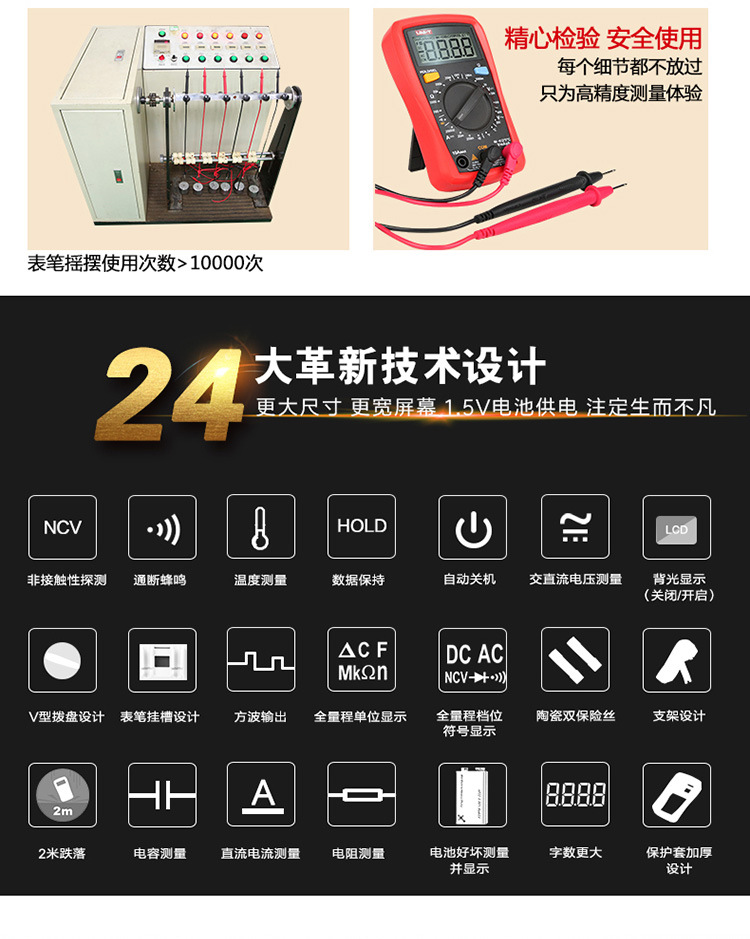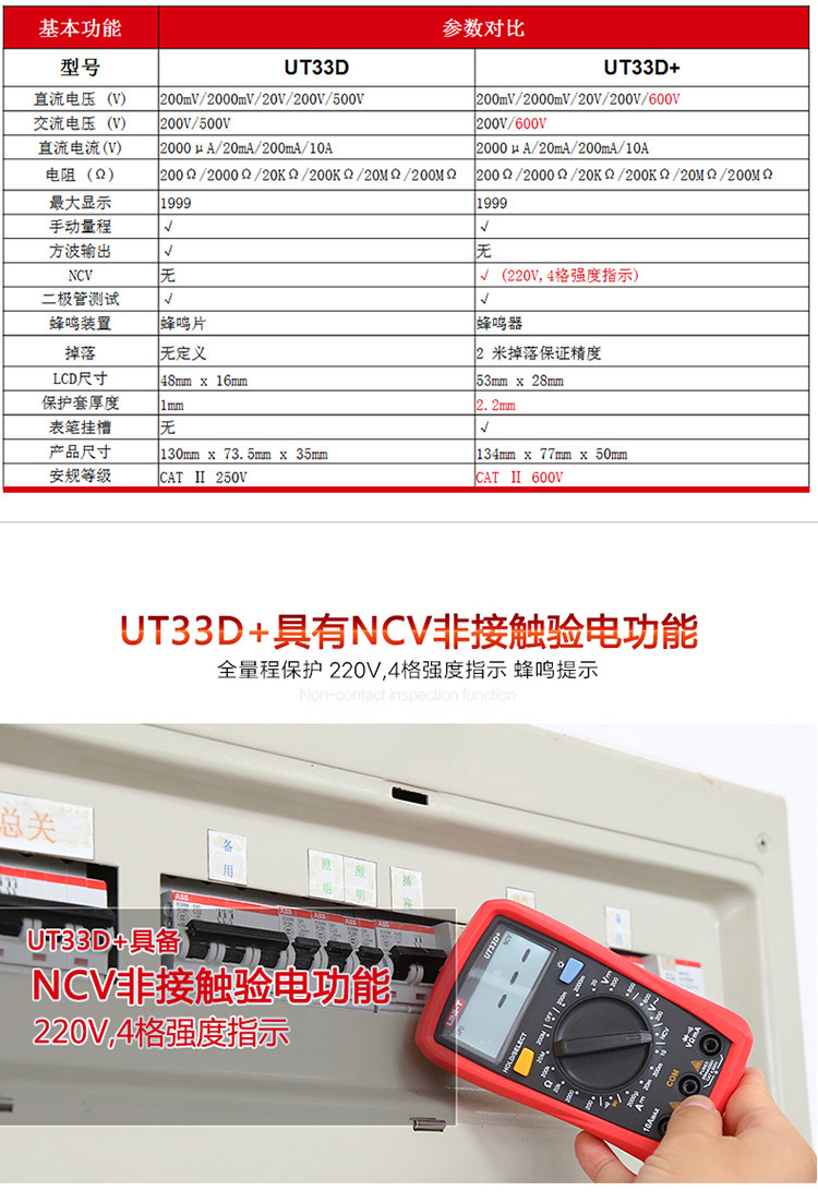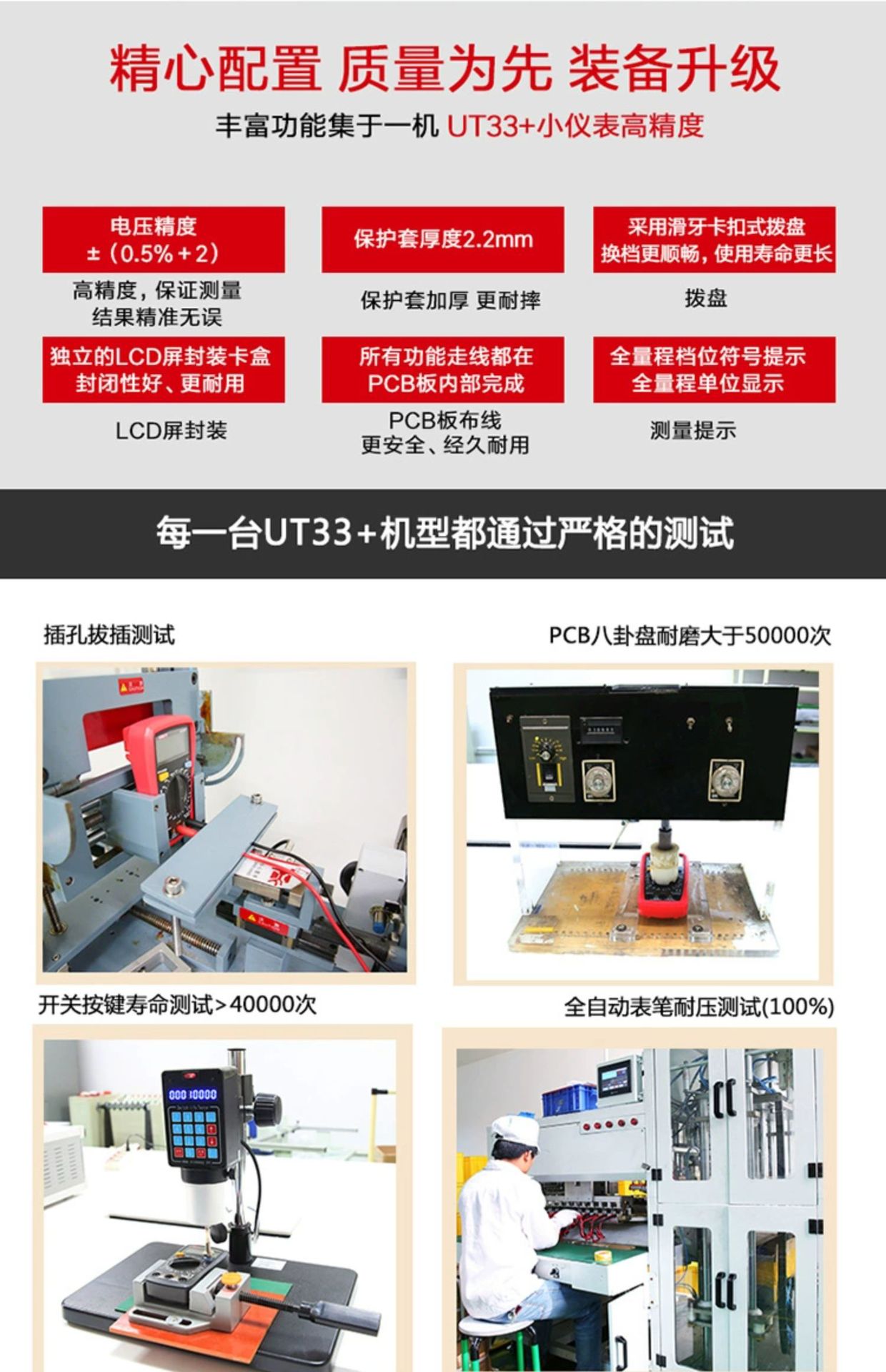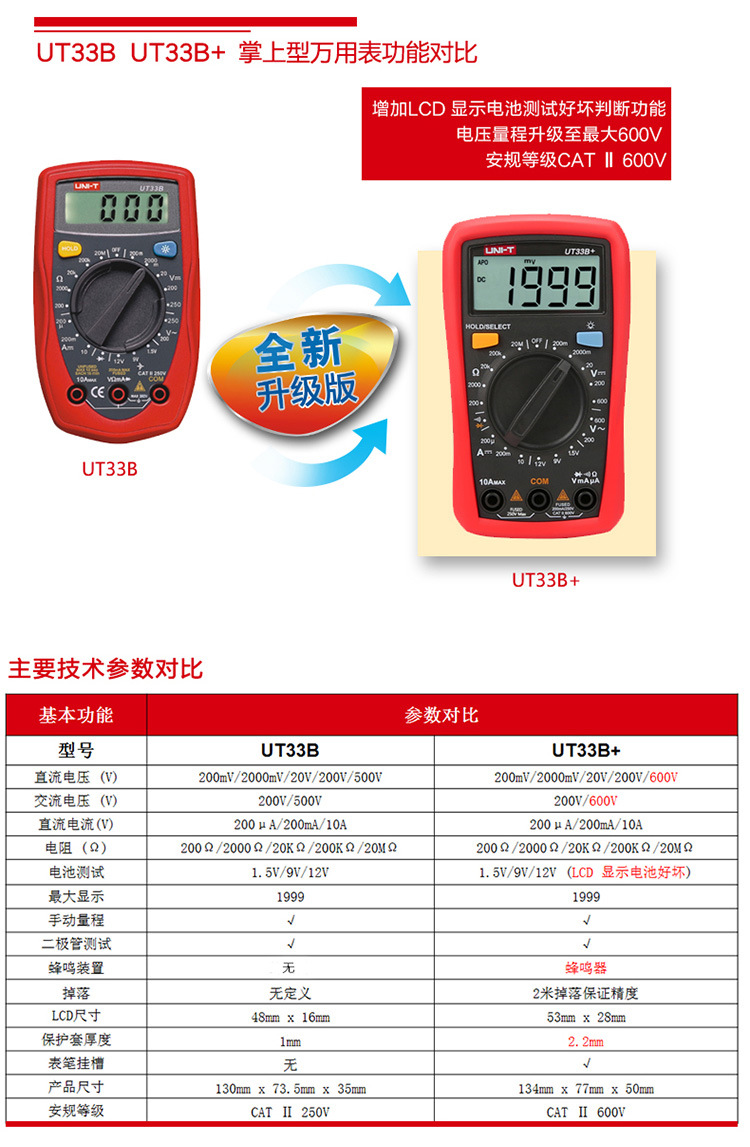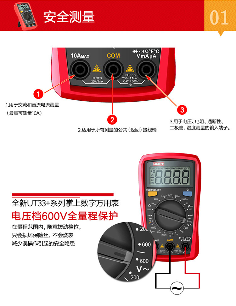UT33A+ (измерение емкости с автоматическим диапазоном) поставляется с предохранителем.; UT33B+ (оценка качества батареи) поставляется с предохранителем; UT33C+ (измерение температуры) поставляется с предохранителем.; UT33D+ (бесконтактное измерение NCV) поставляется с предохранителем