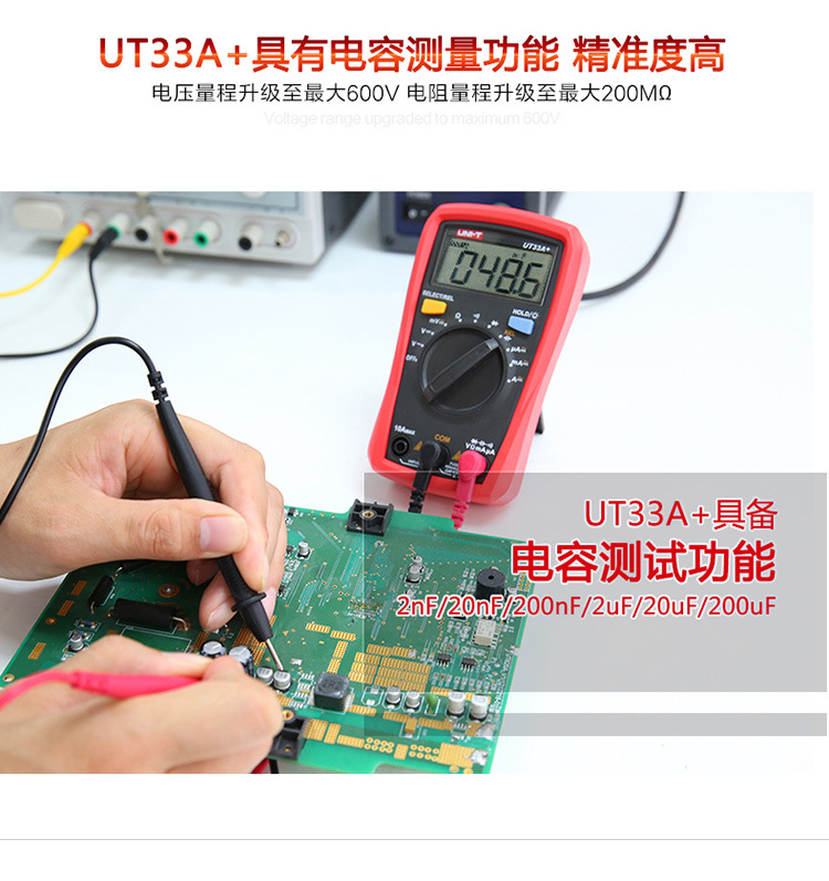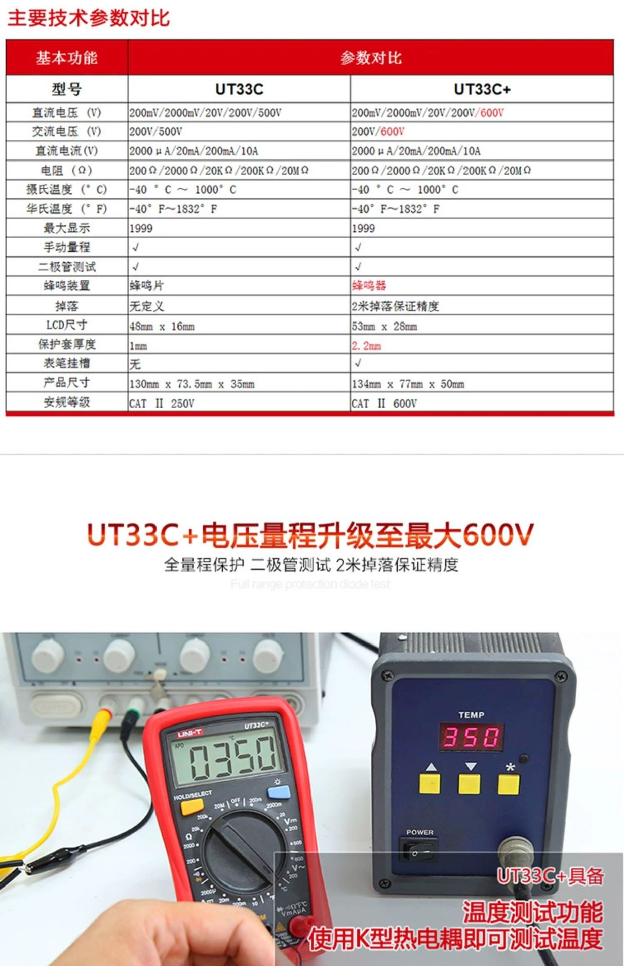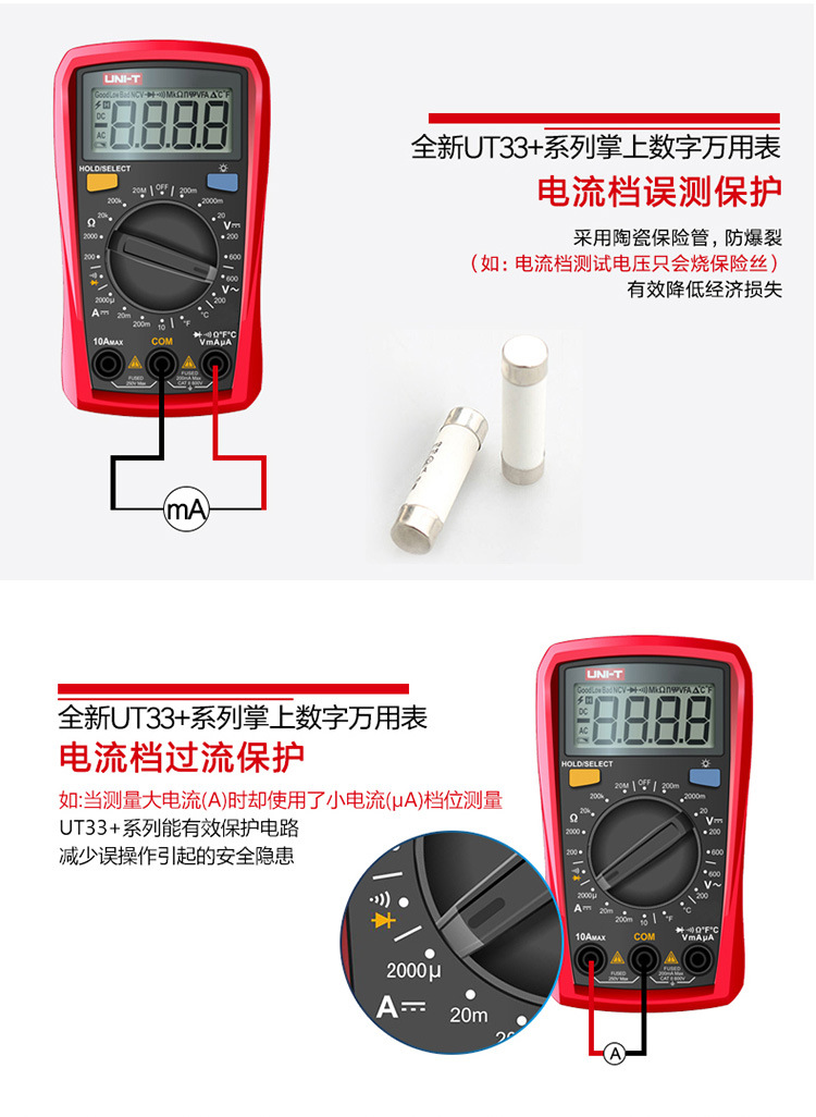UT33A+ (измерение емкости с автоматическим диапазоном) поставляется с предохранителем. UT33B+ (оценка качества батареи) поставляется с предохранителем. UT33C+ (температура