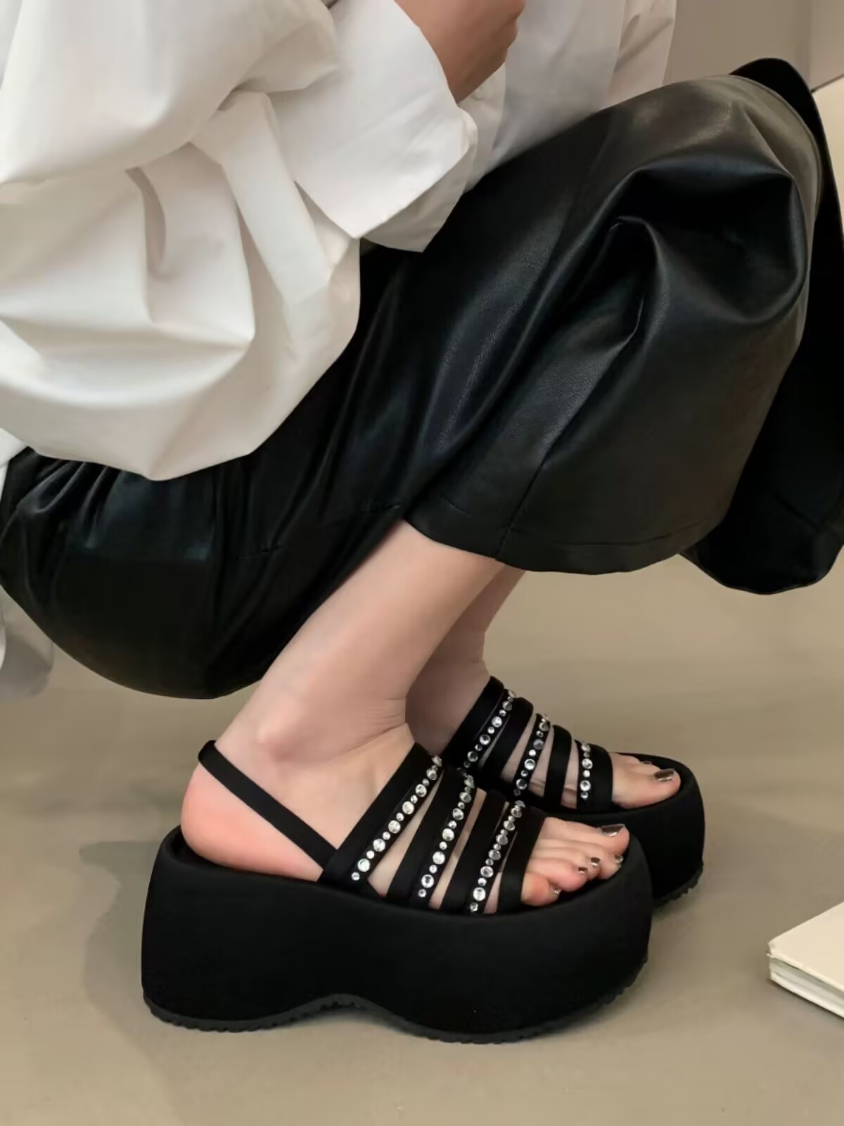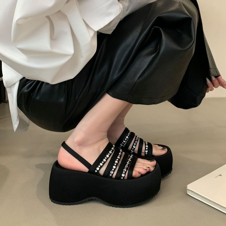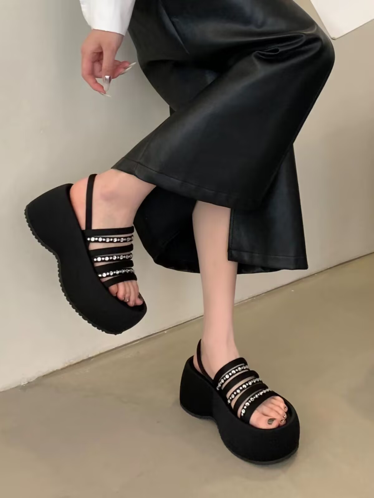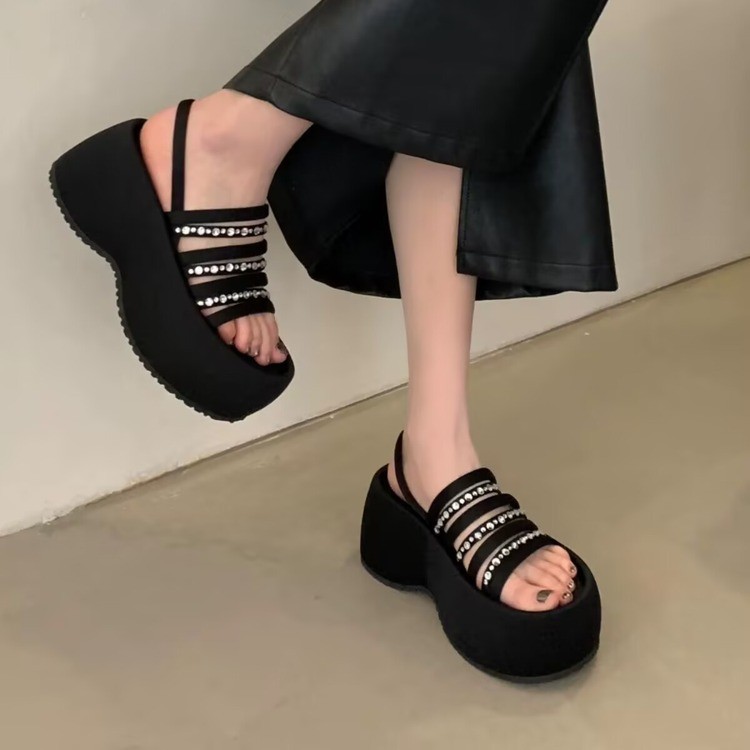 Стразы черные модные сандалии женские весна и лето 2025 новый толстый подошв Рим дикий комфорт повышен шлепанцы