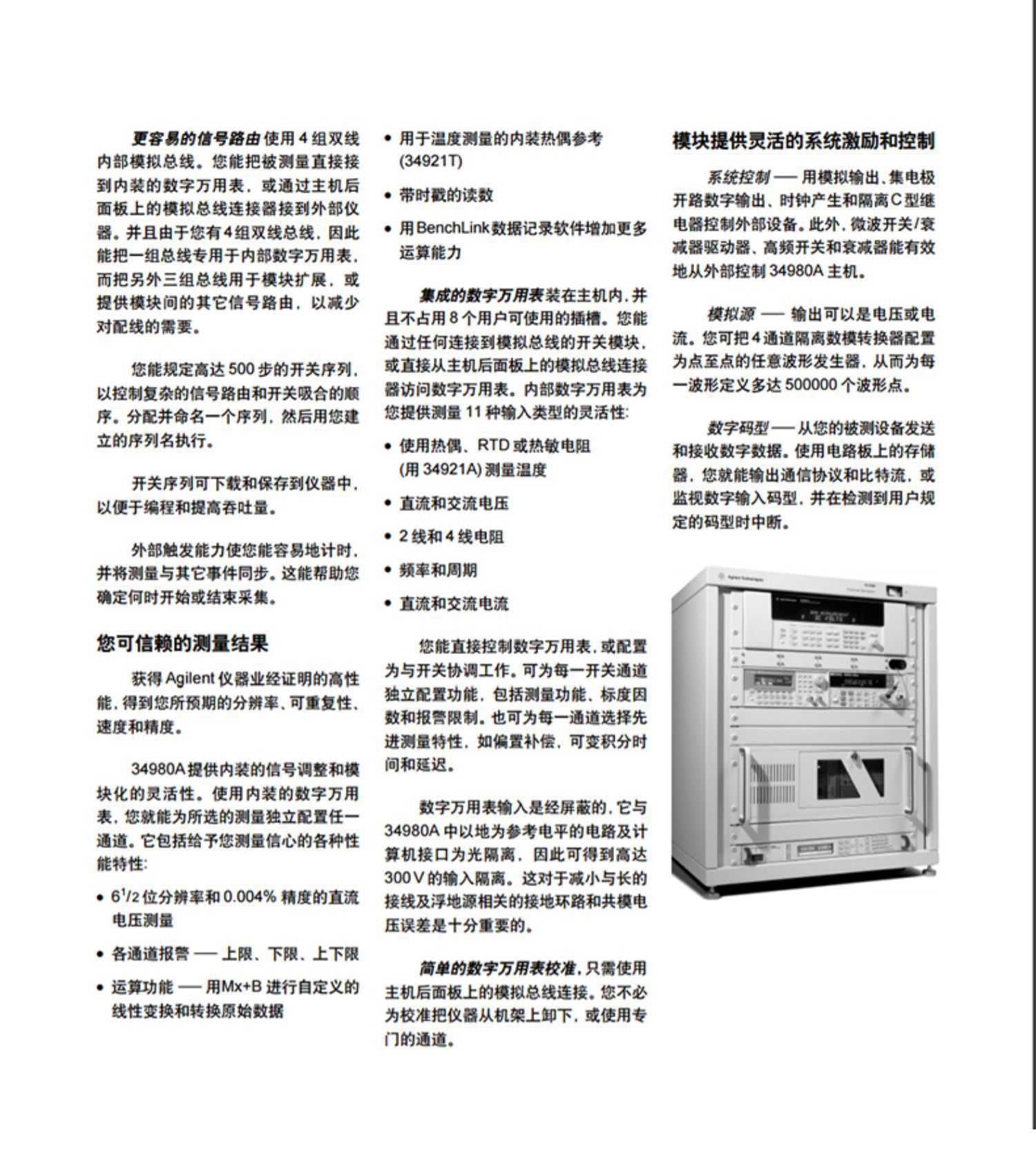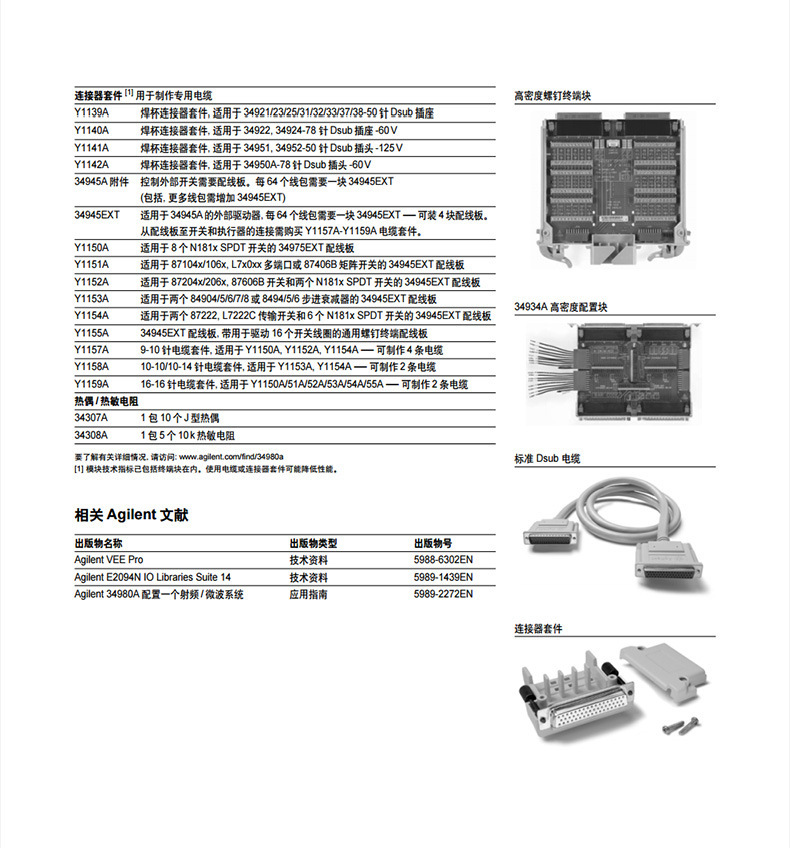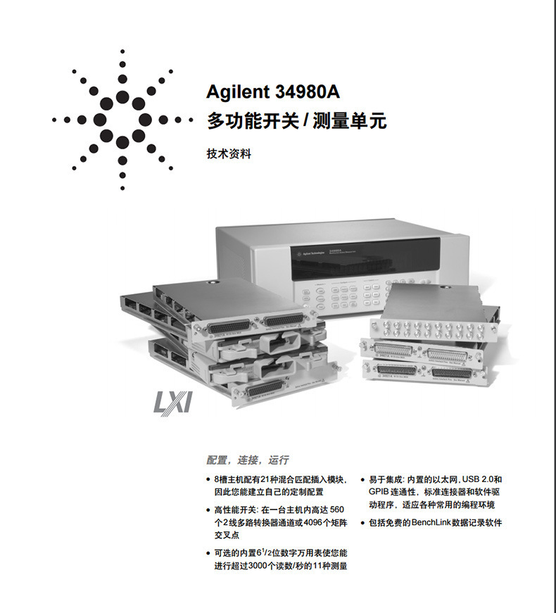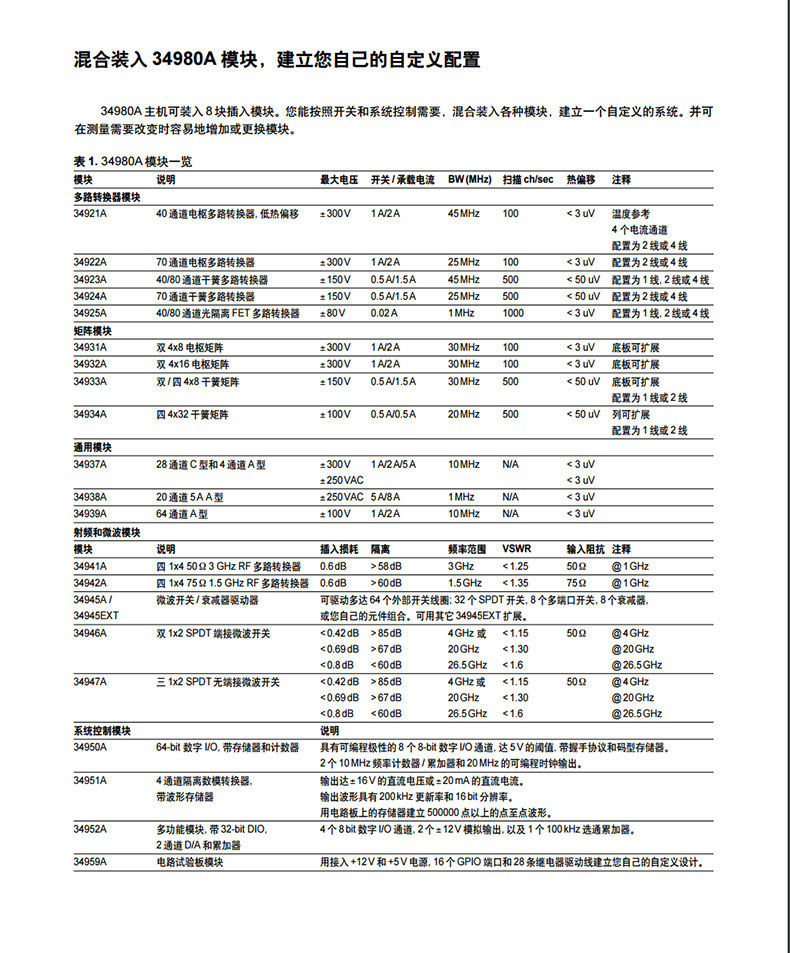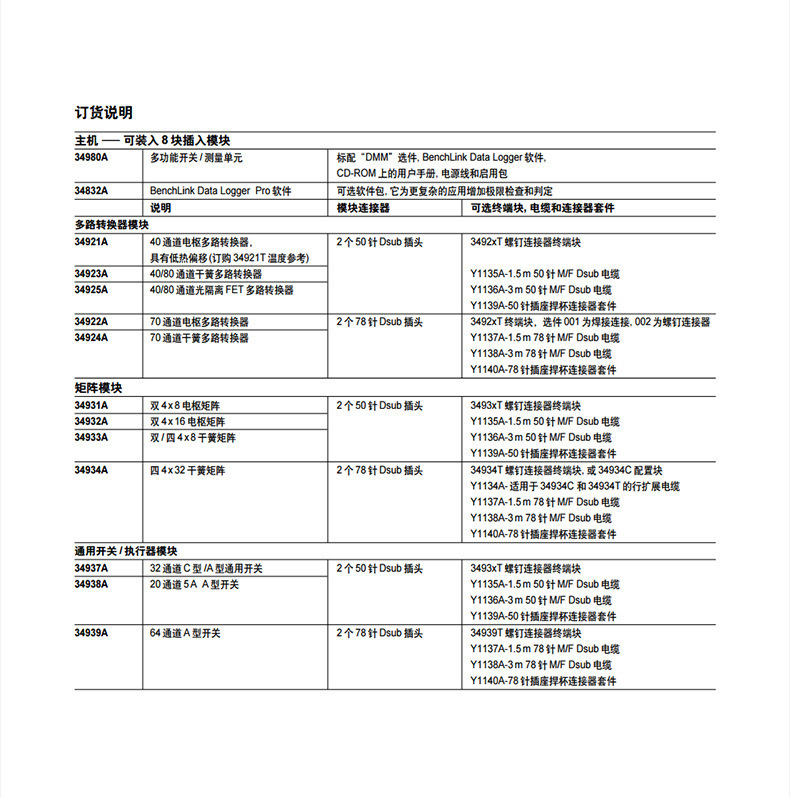 34980A (хост с 8 слотами, встроенный цифровой мультиметр с 6 слотами); 34980A+34921A*1+34921T*1 (общий испытательный комплект); 34921А (40-канальный мультиплексор якоря); 34921T (терминал 34921A); 34922А-001 (70-канальный мультиплексор якоря); 34922T-002 (терминал 34922A); 34923A (40/80-канальный герконовый мультиплексор); 34923T (терминал 34923A); 34924А (70-канальный герконовый мультиплексор); 34924T (разъемная коробка 34924)