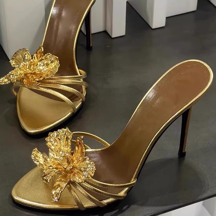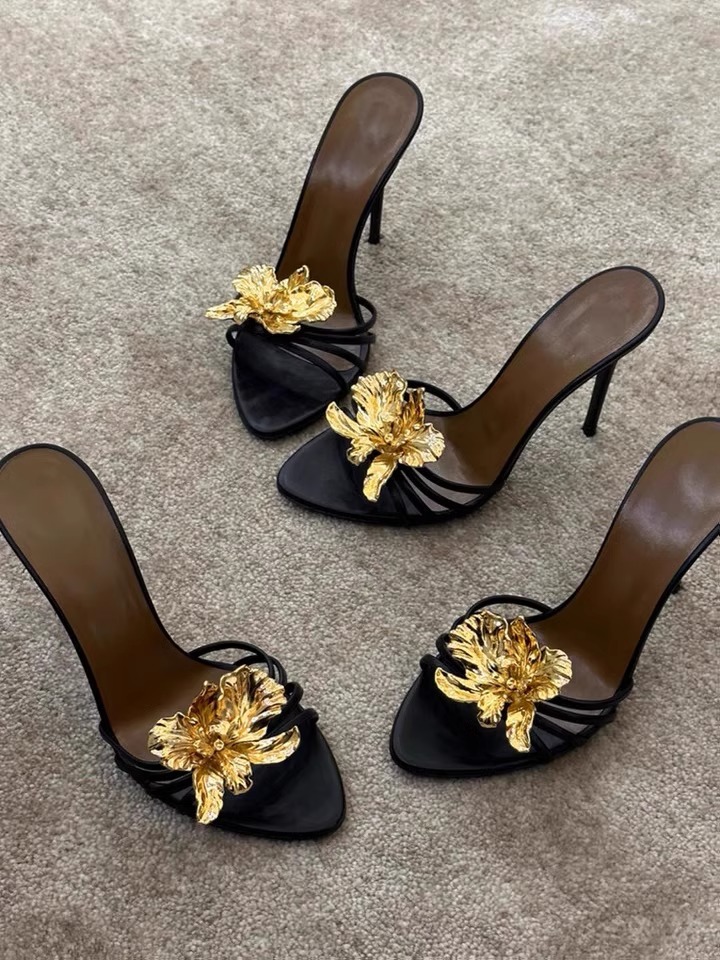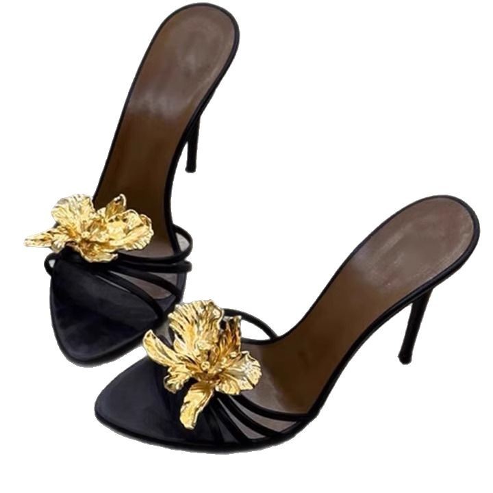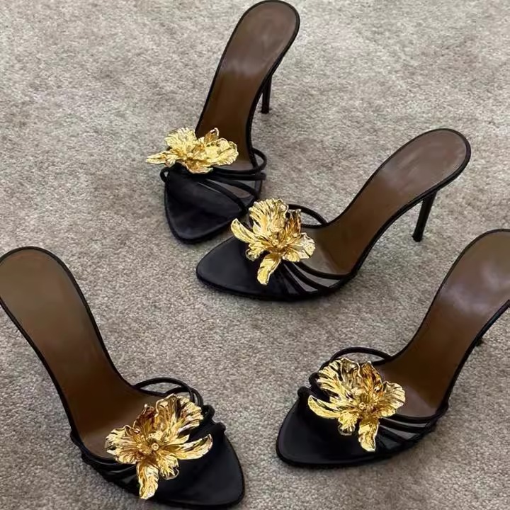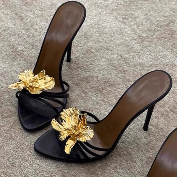 2025 новый летний металлический цветок французские красивые модные сандалии женские каблуки на каблуках черные сандалии