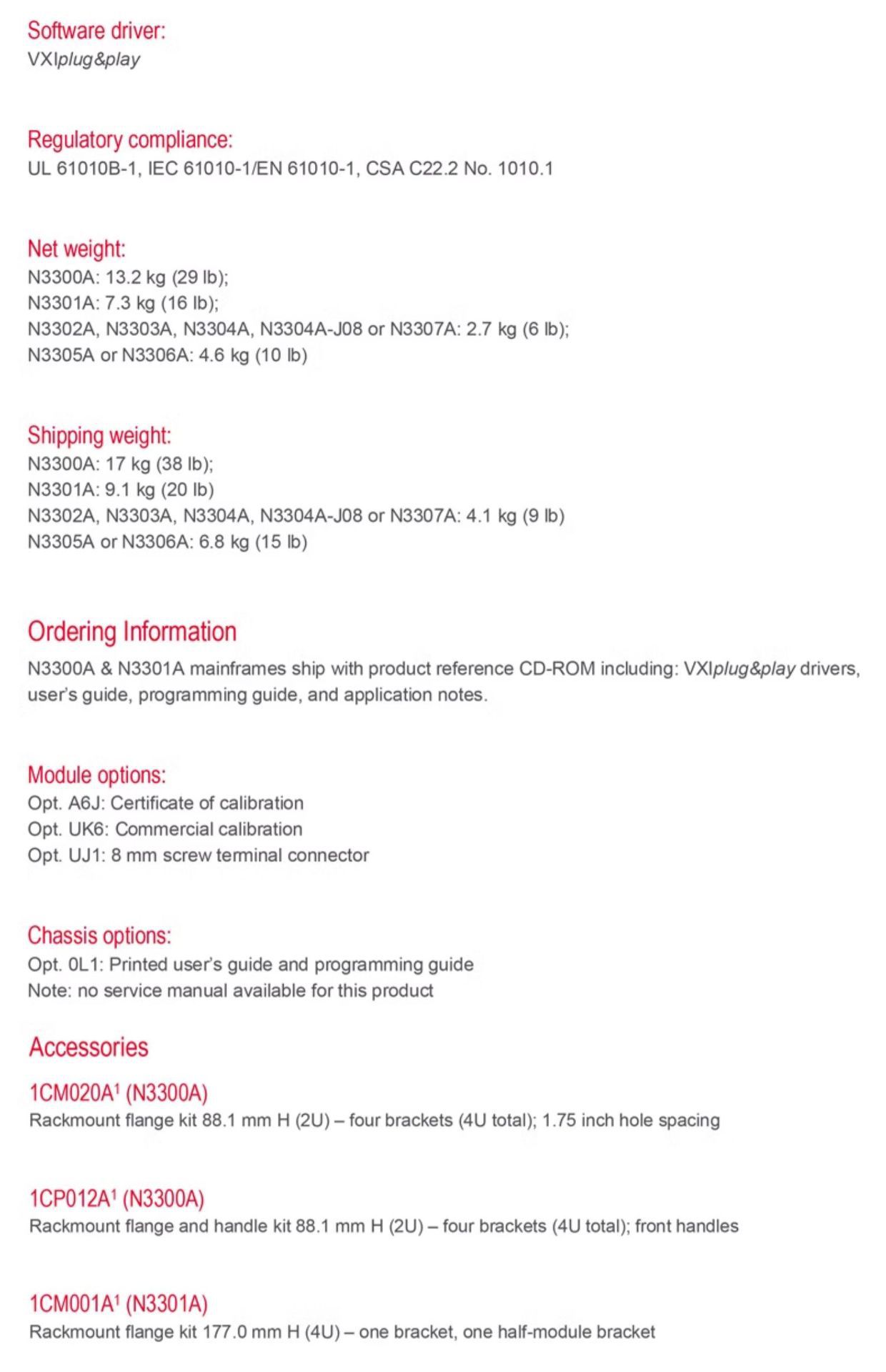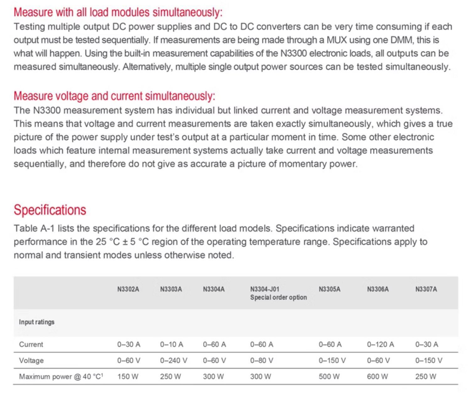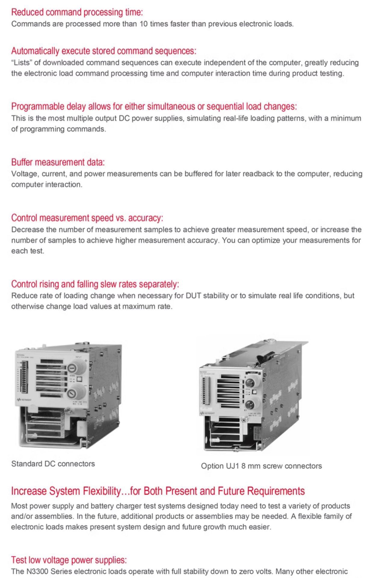 N3300A (электронная нагрузка постоянного тока 1800 Вт, 6 слотов); N3301A (электронная нагрузка постоянного тока 600 Вт, 2 слота); N3302A (цифровой модуль нагрузки 150 Вт); N3303A (цифровой модуль нагрузки 250 Вт); N3304A (цифровой модуль нагрузки 300 Вт); N3305A (цифровой модуль нагрузки 500 Вт); N3306A (цифровой модуль нагрузки 600 Вт); N3307A (цифровой модуль нагрузки 250 Вт)