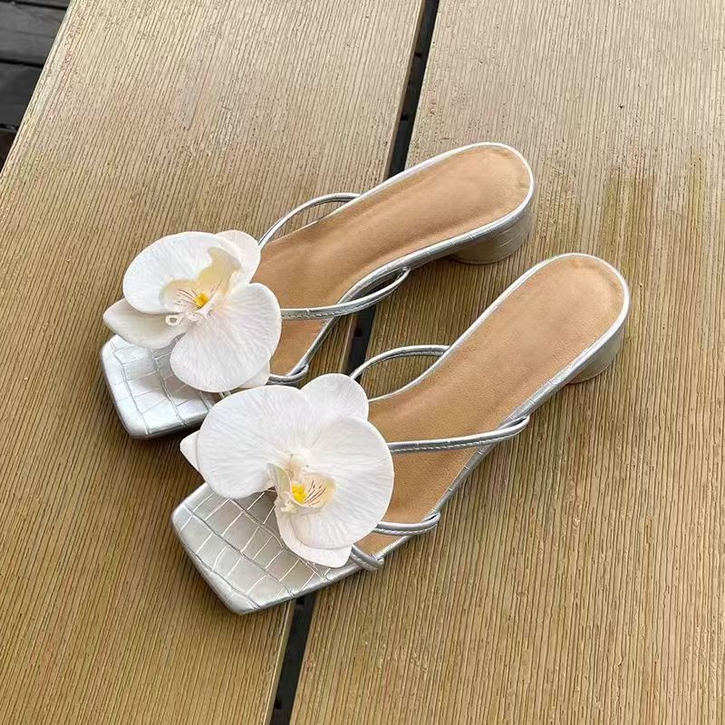 Леди Французский летний пляж Песчаные тапочки 2024 Новые нишевые цветы Квадратные Тапки на высоком каблуке с юбкой