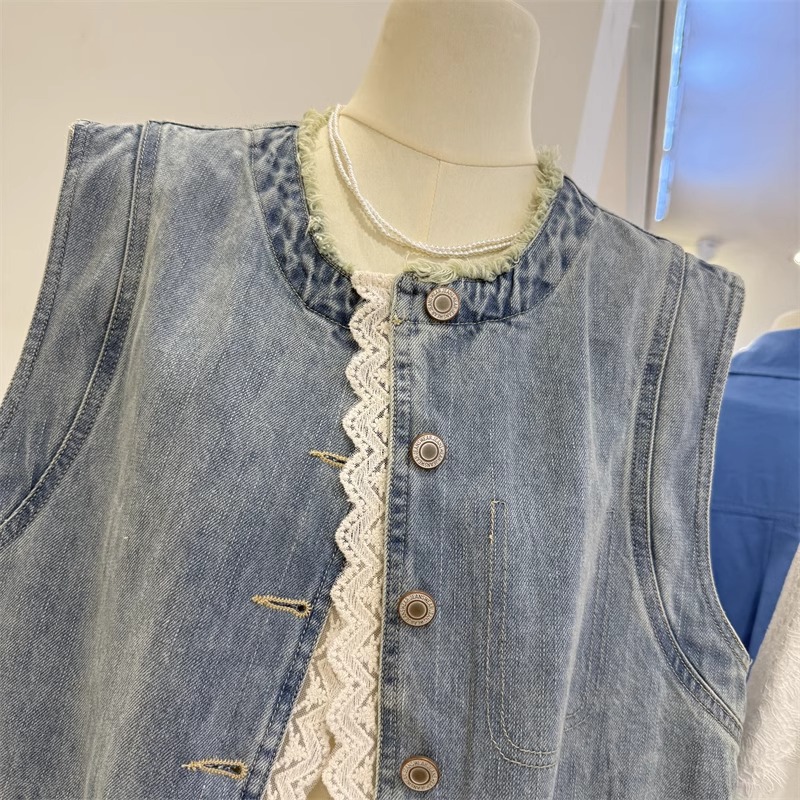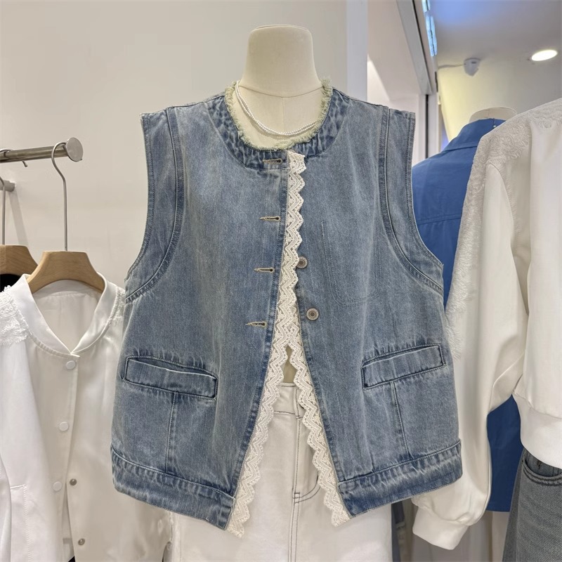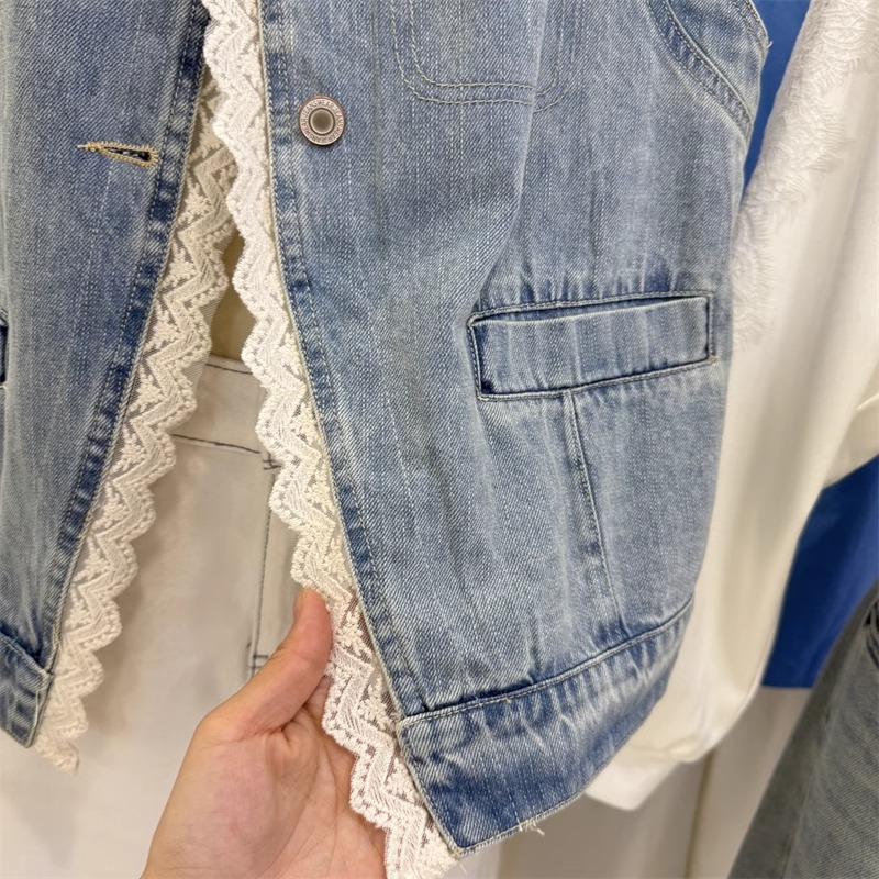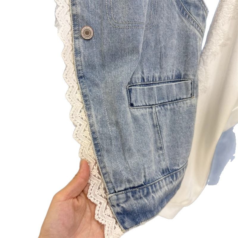 Лавочник толкает новую корейскую модную кружевную кружевную ретро джинсовую куртку без рукавов для женщин весной 2025 года
