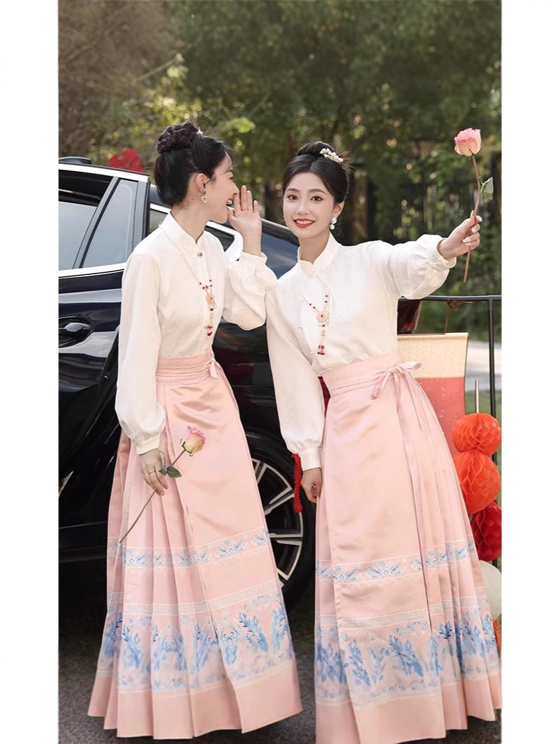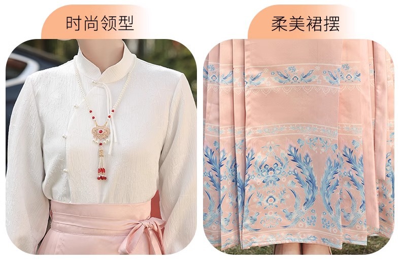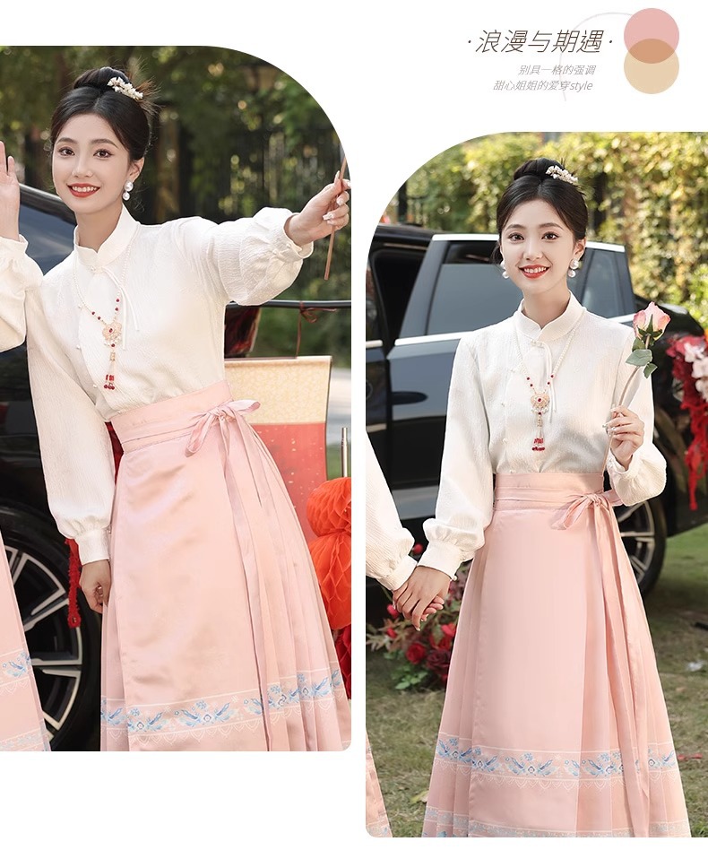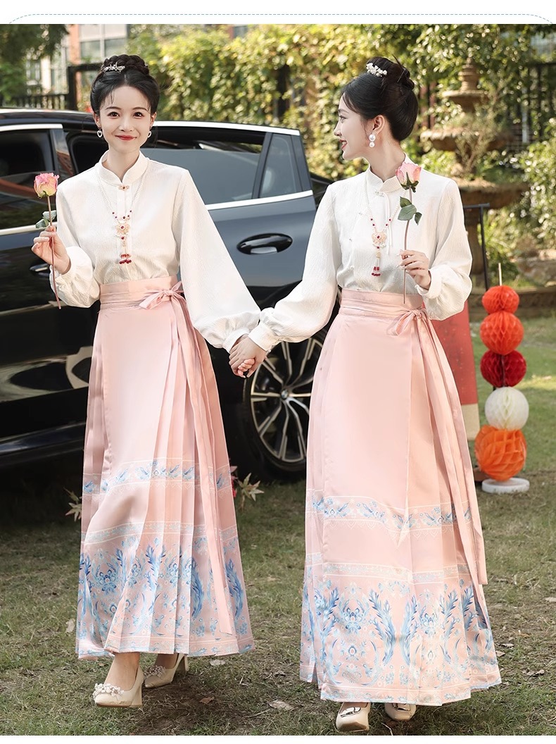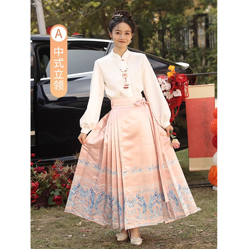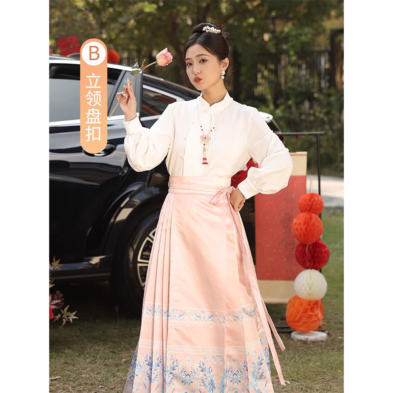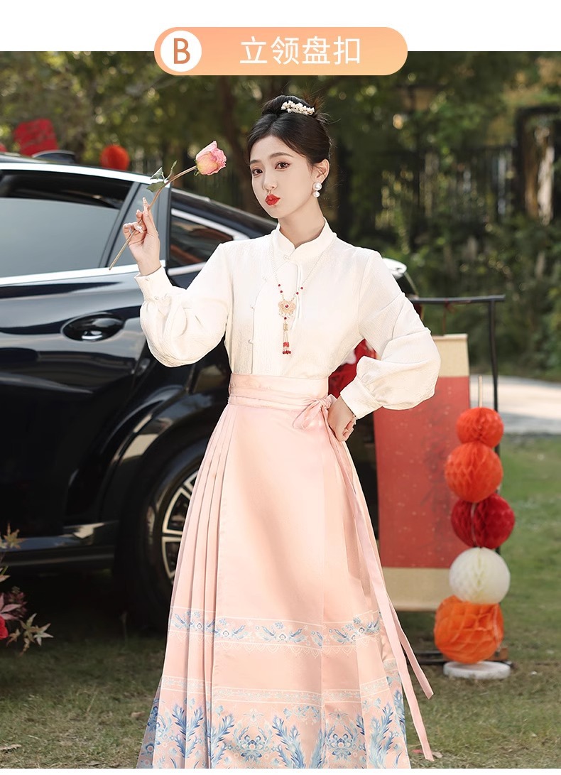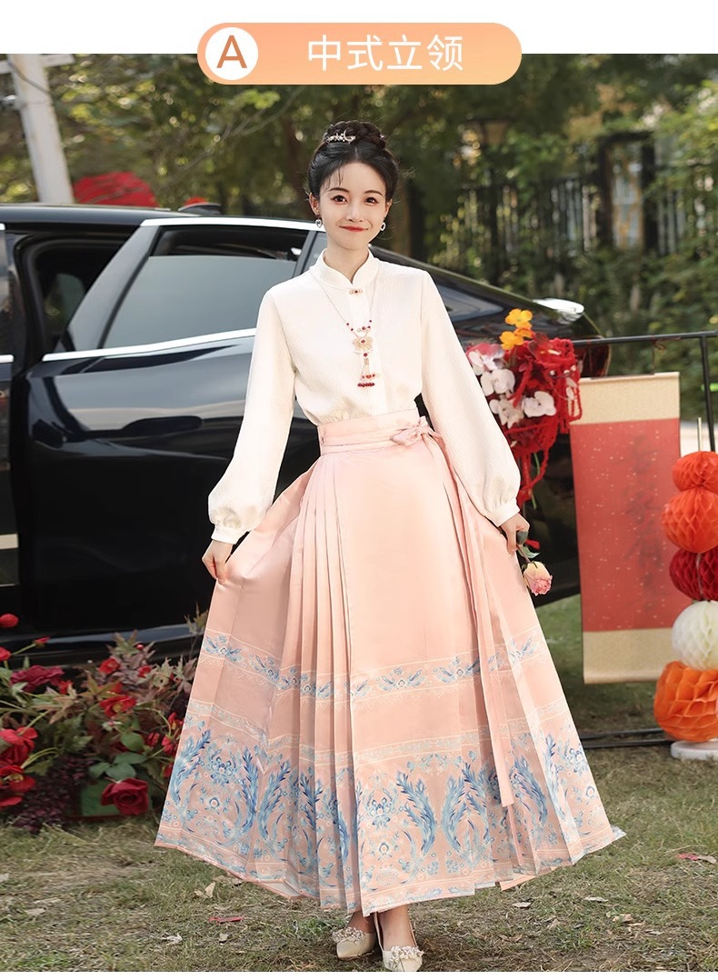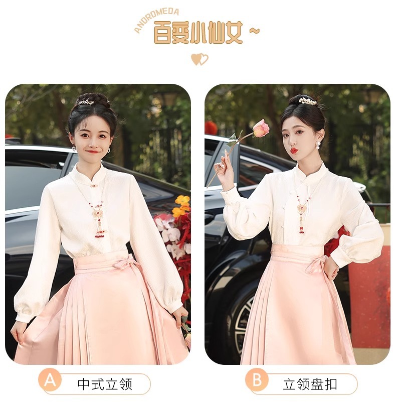 Тип А: китайский топ с воротником-стойкой + розовая юбка-лошадь; Топ на пуговицах с воротником-стойкой типа B + розовая юбка-лошадь