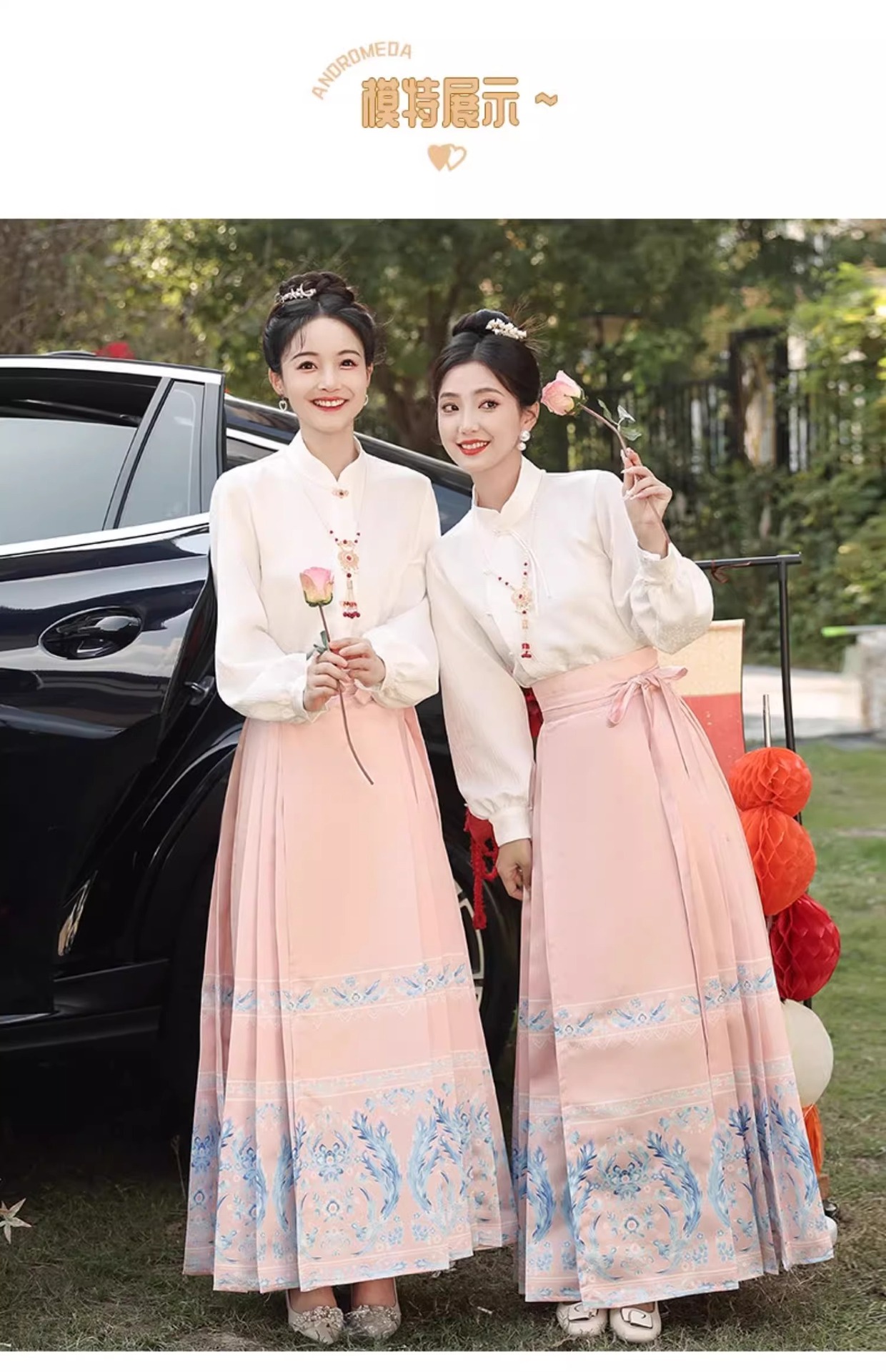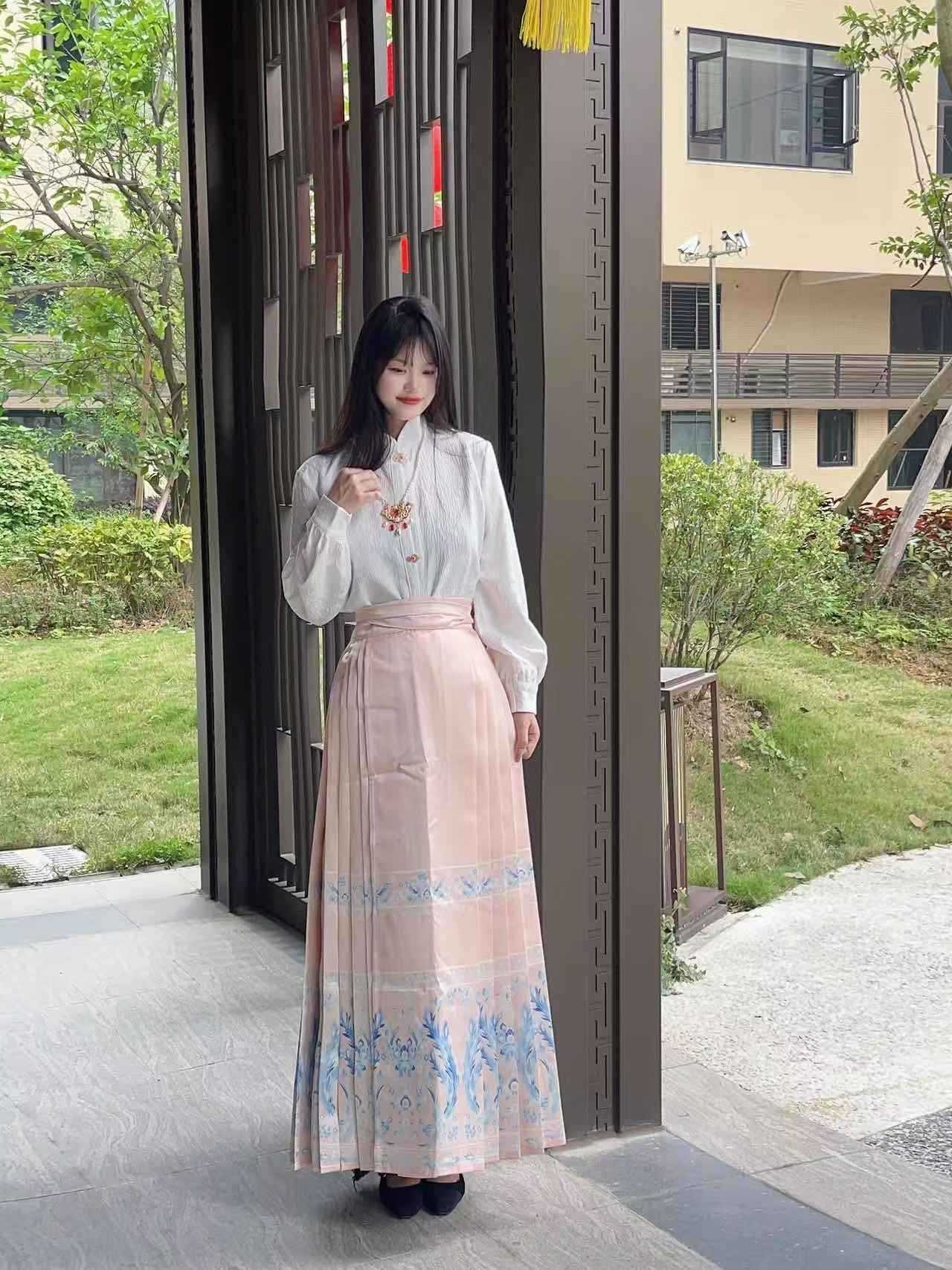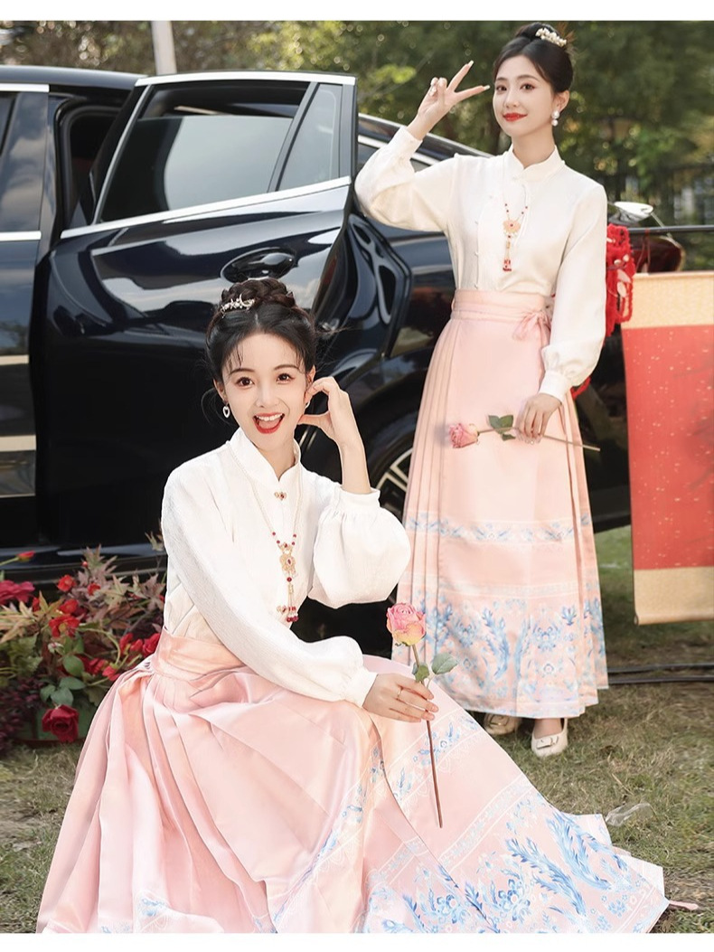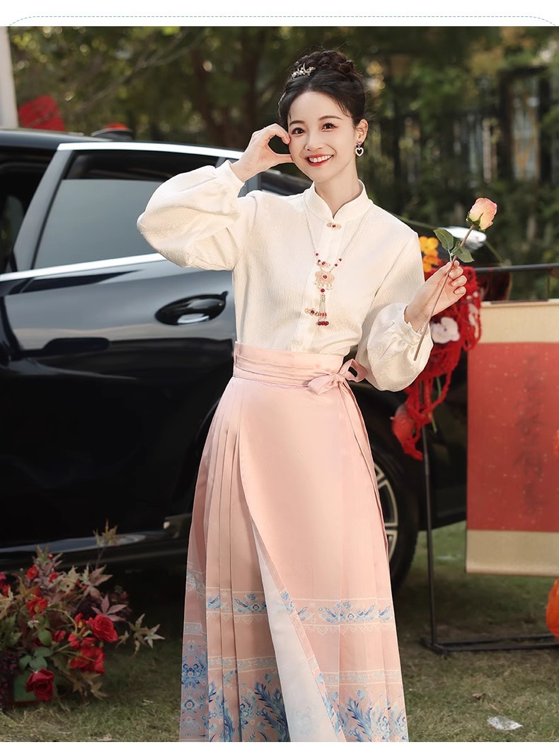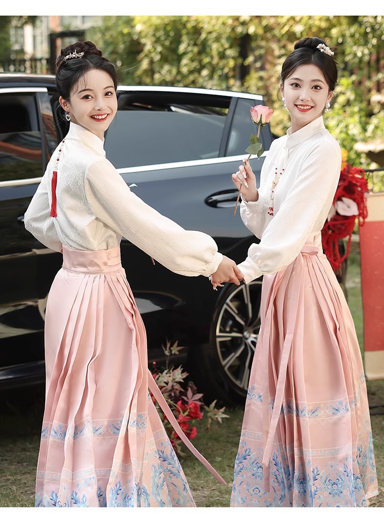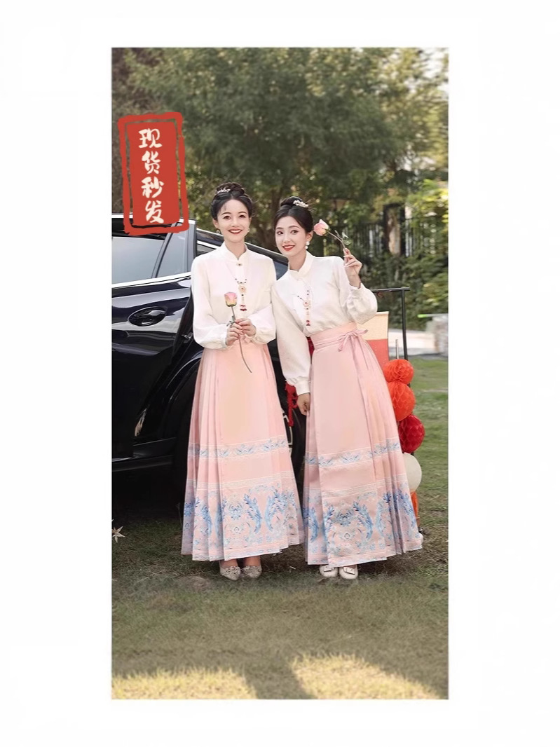 Тип А: китайский топ с воротником-стойкой + розовая юбка-лошадь; Топ на пуговицах с воротником-стойкой типа B + розовая юбка-лошадь