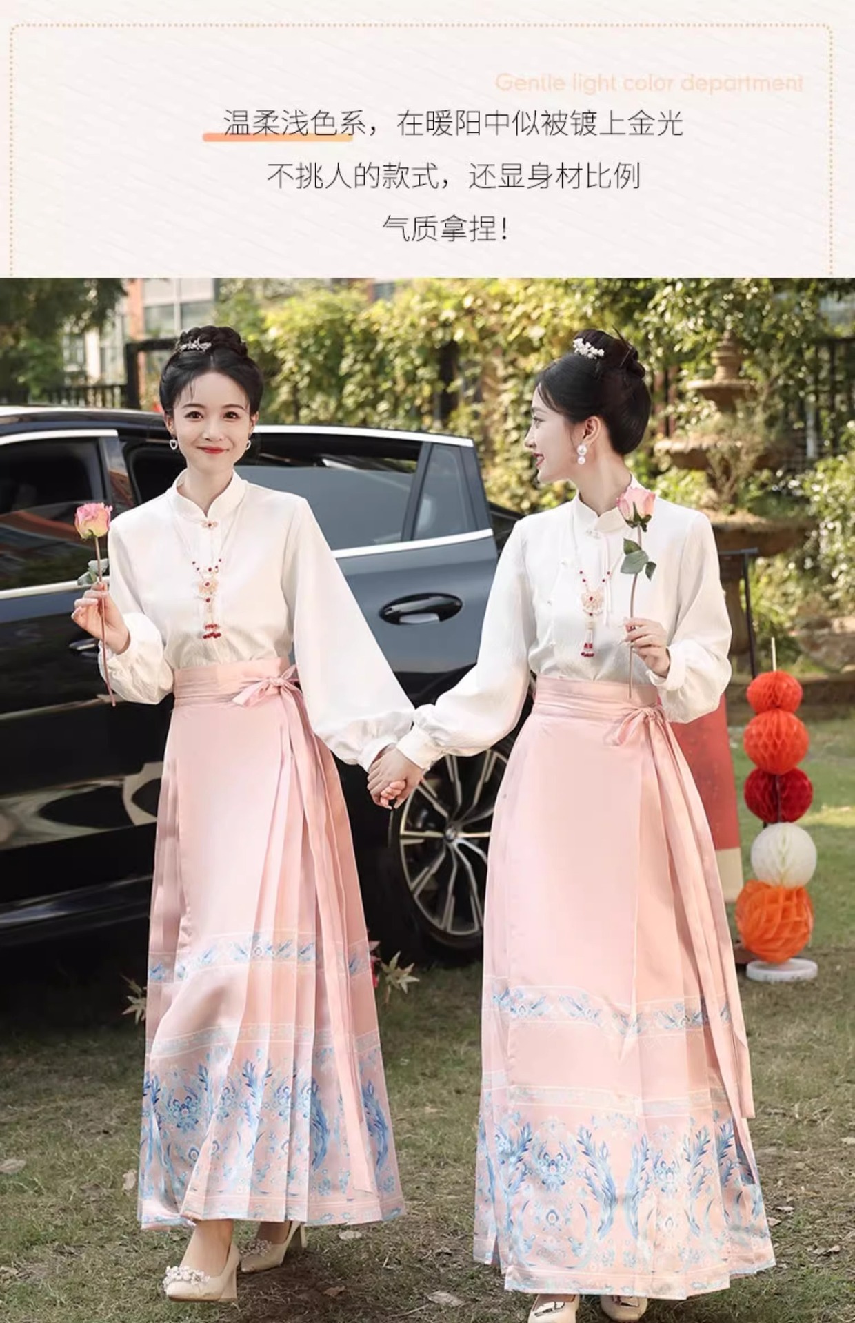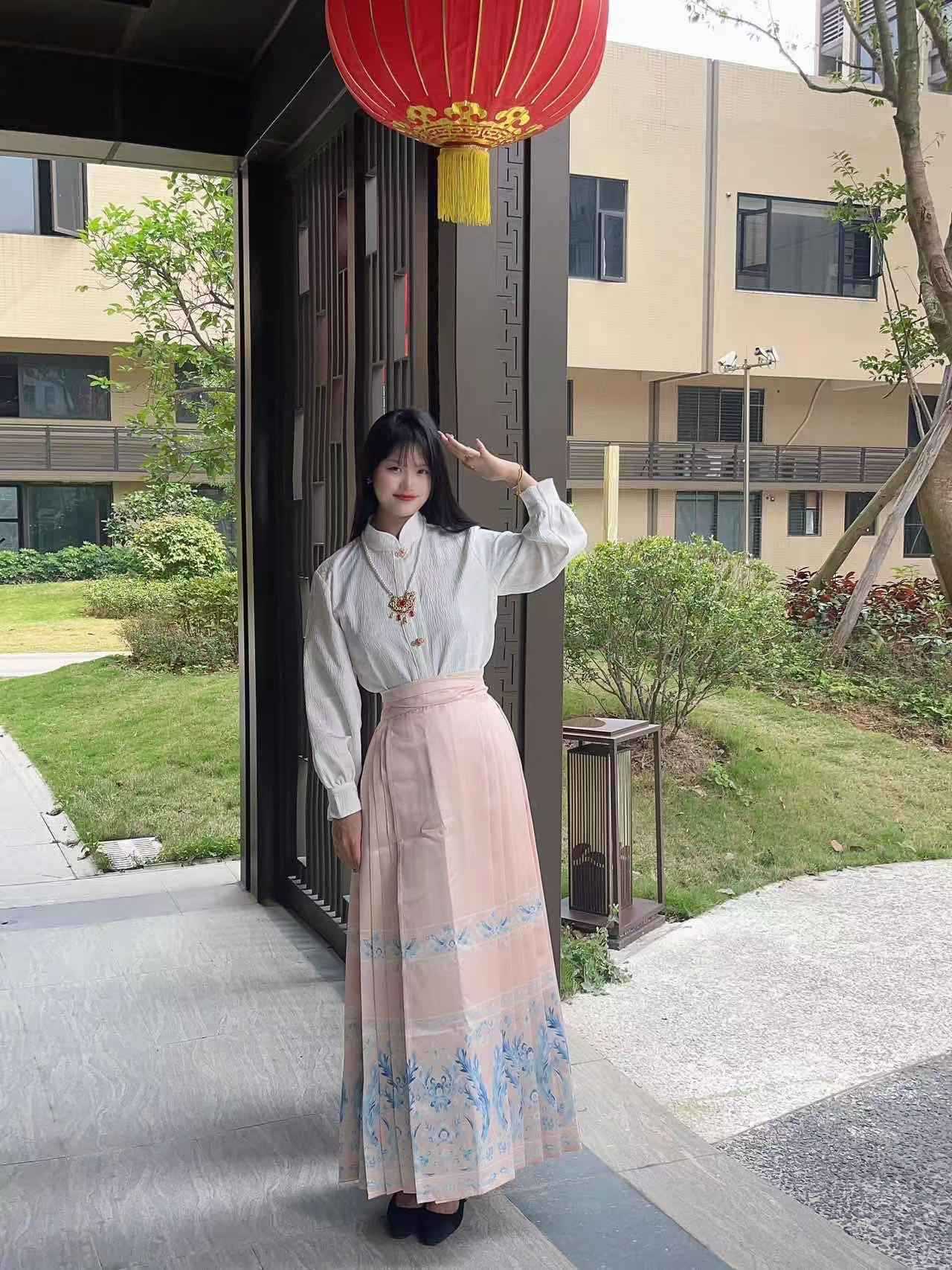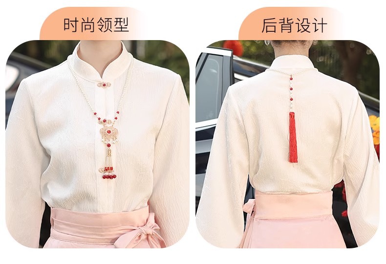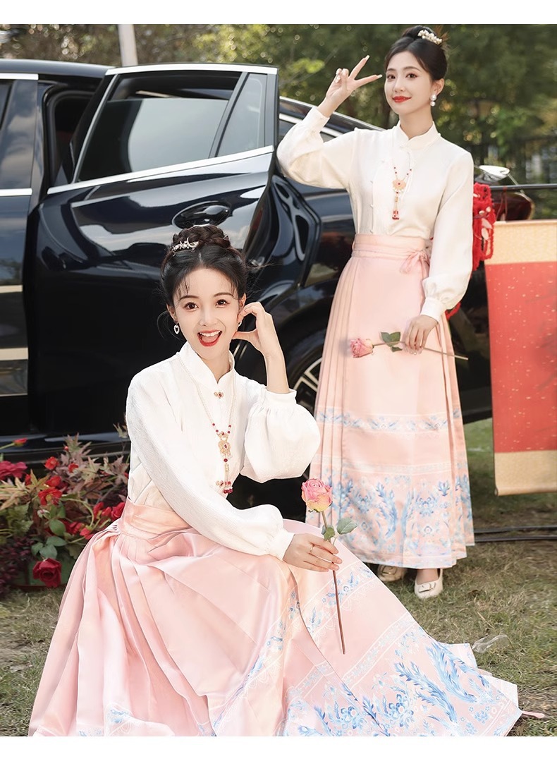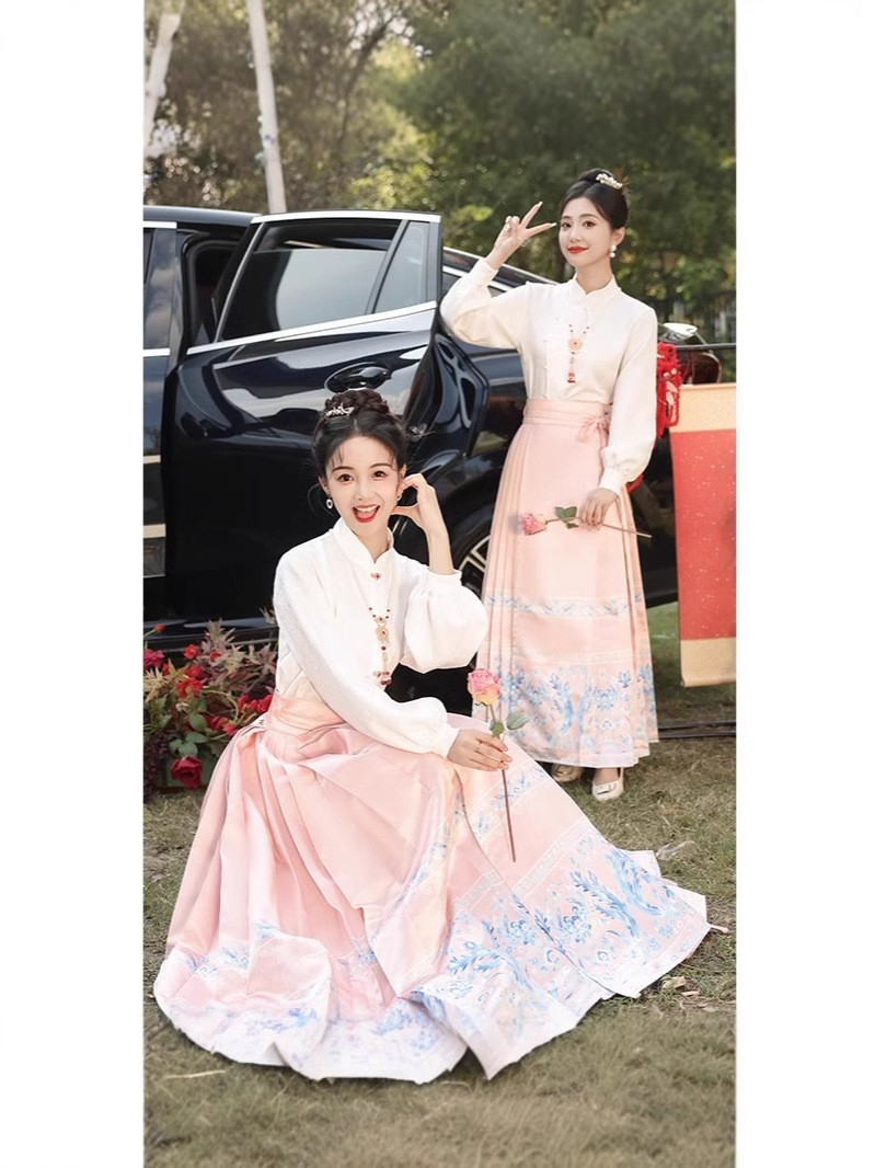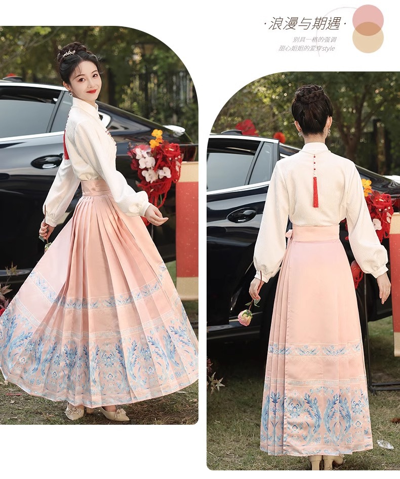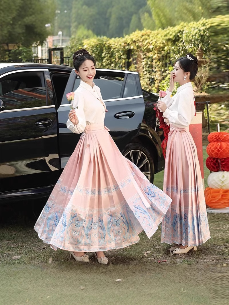 Тип А: китайский топ с воротником-стойкой + розовая юбка-лошадь; Топ на пуговицах с воротником-стойкой типа B + розовая юбка-лошадь