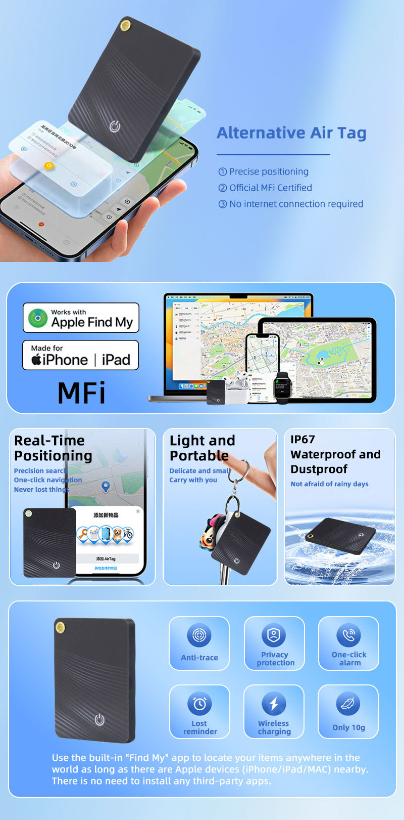 Перезаряжаемая анти-потерянная карта Find My Предметы Найти локатор iTag анти-потерянный
