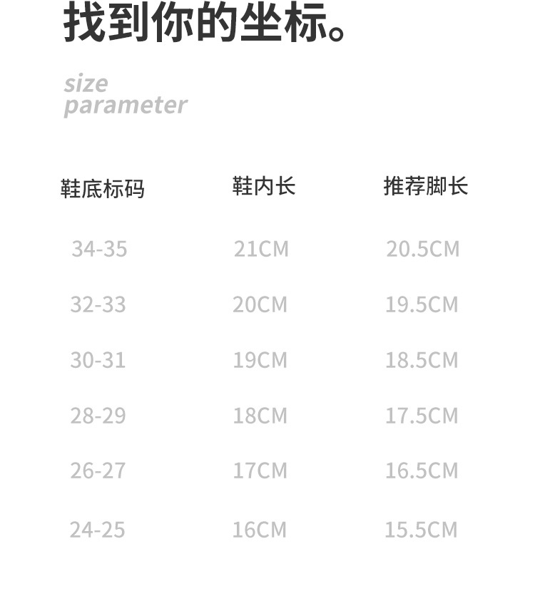 Размер 24-25 [внутренняя длина 16 см]; Размер 26-27 [внутренняя длина 17 см]; Размер 28-29 [внутренняя длина 18 см]; Размер 30-31 [внутренняя длина 19 см]; Размер 32-33 [внутренняя длина 20 см]; Размер 34-35 [внутренняя длина 21см]