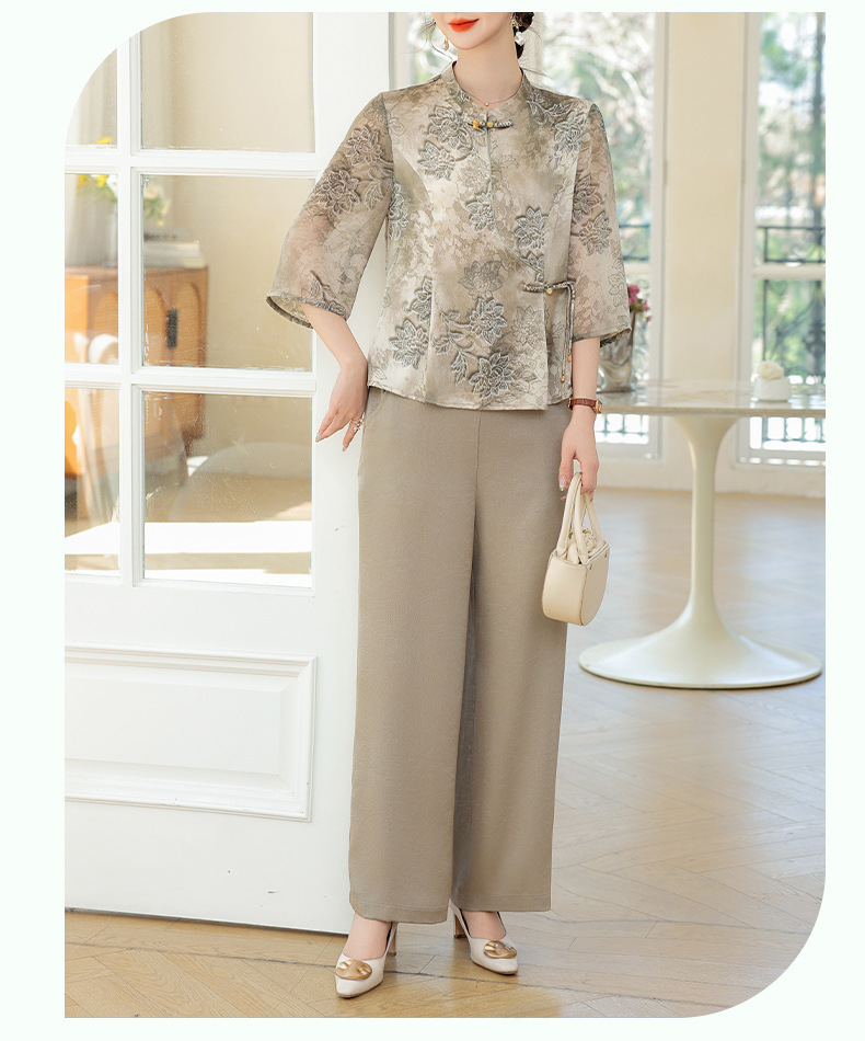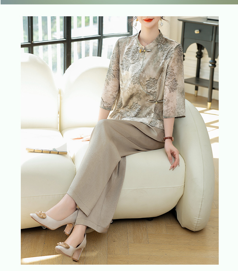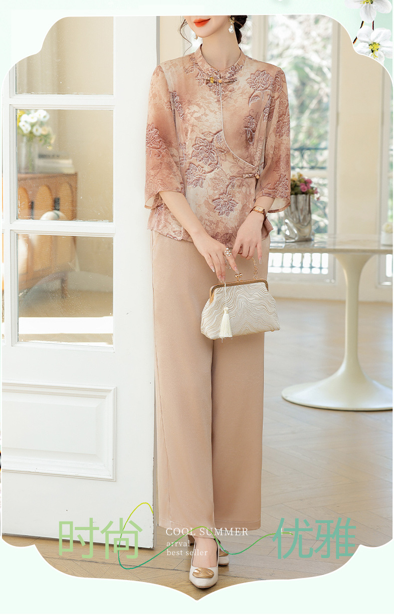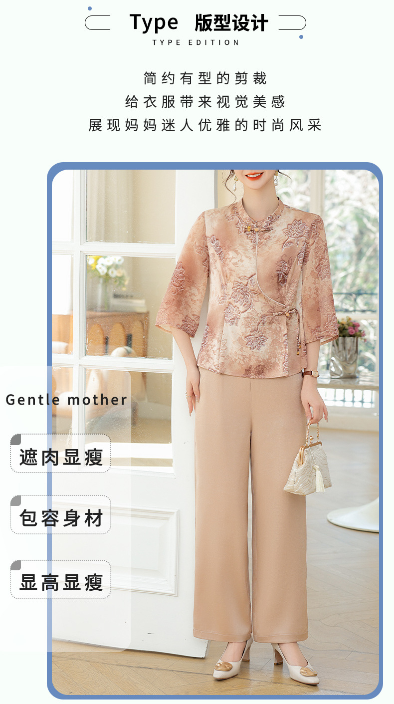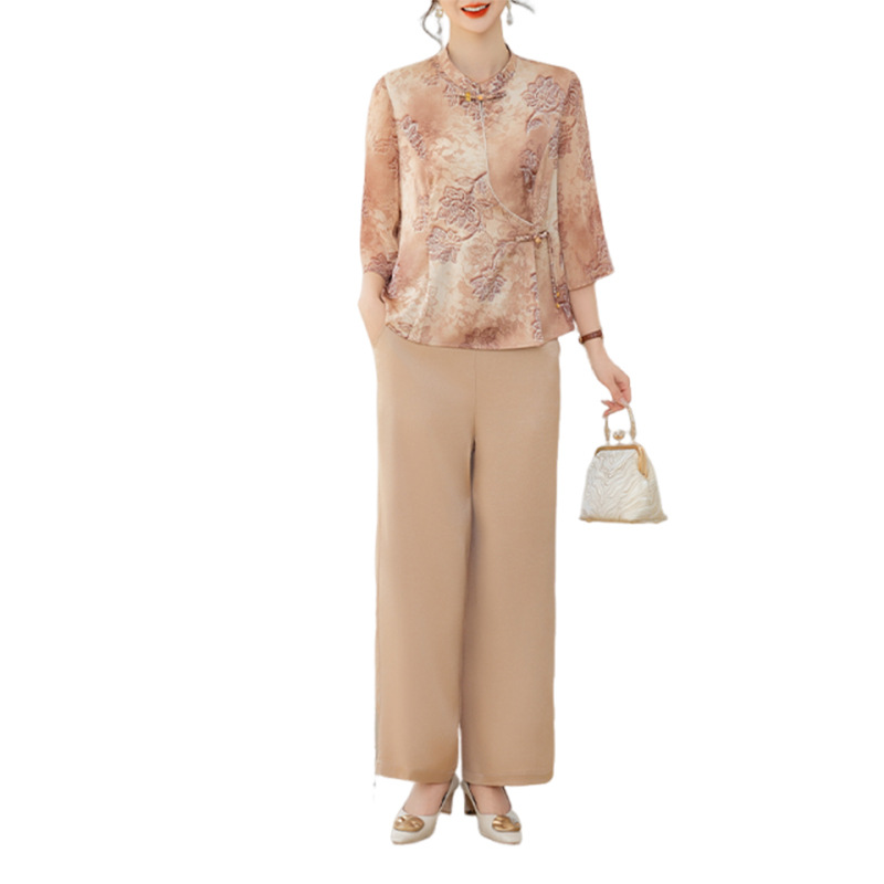 Летний костюм для мамы с цветущими цветами, новый комплект из двух предметов в национальном стиле в стиле шинуазри с тиснением и элегантной одеждой для мам среднего и пожилого возраста.