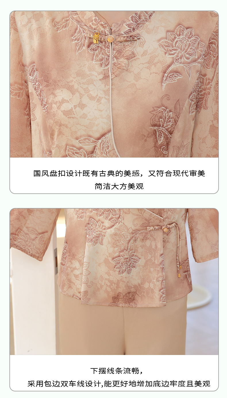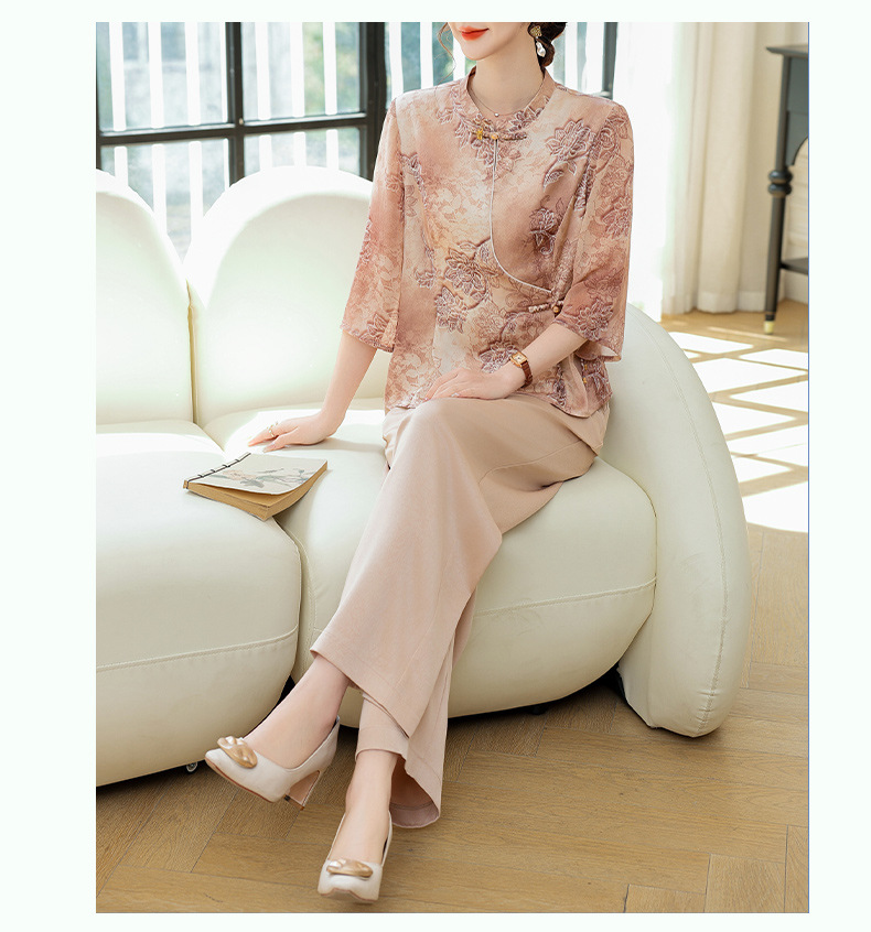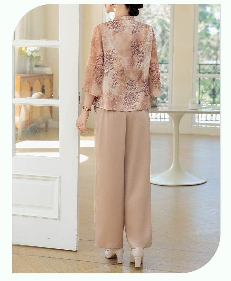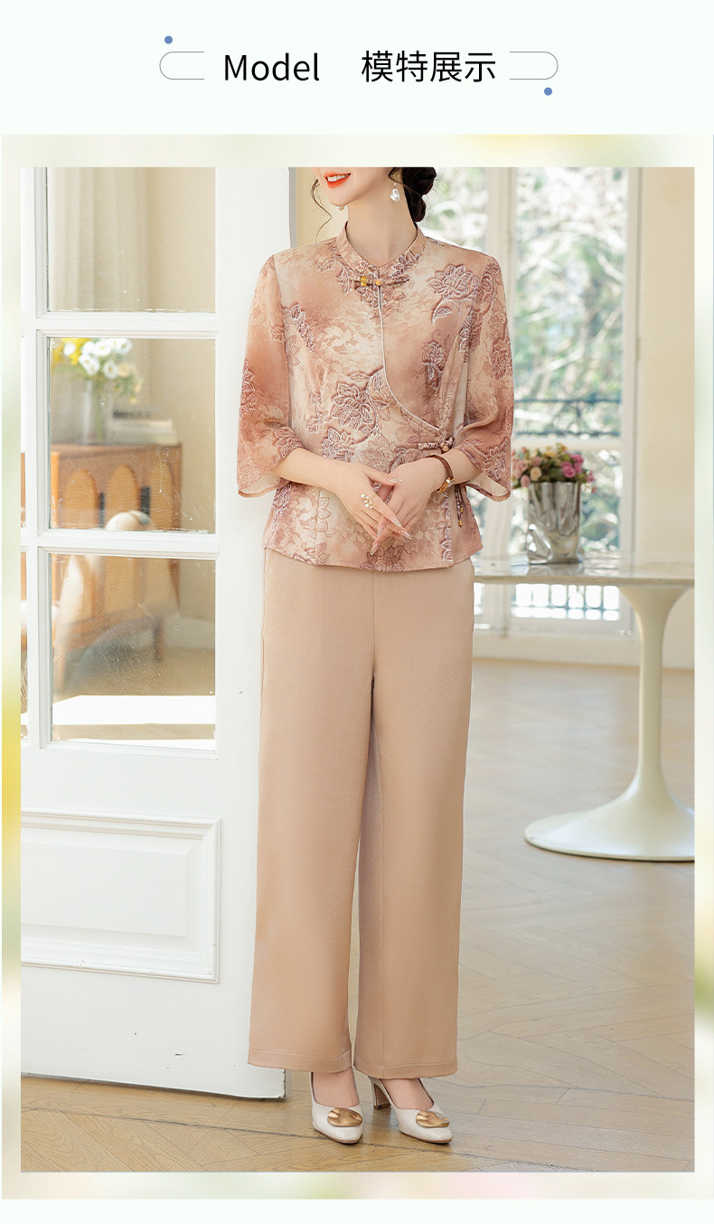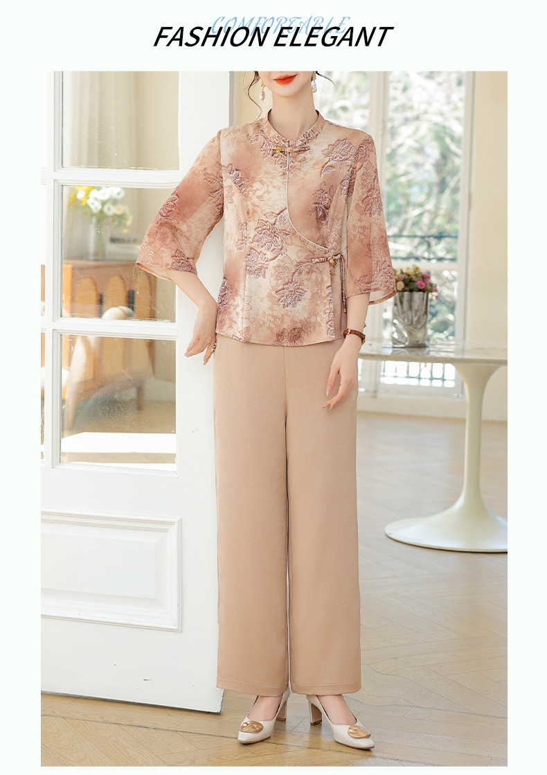 Летний костюм для мамы с цветущими цветами, новый комплект из двух предметов в национальном стиле в стиле шинуазри с тиснением и элегантной одеждой для мам среднего и пожилого возраста.