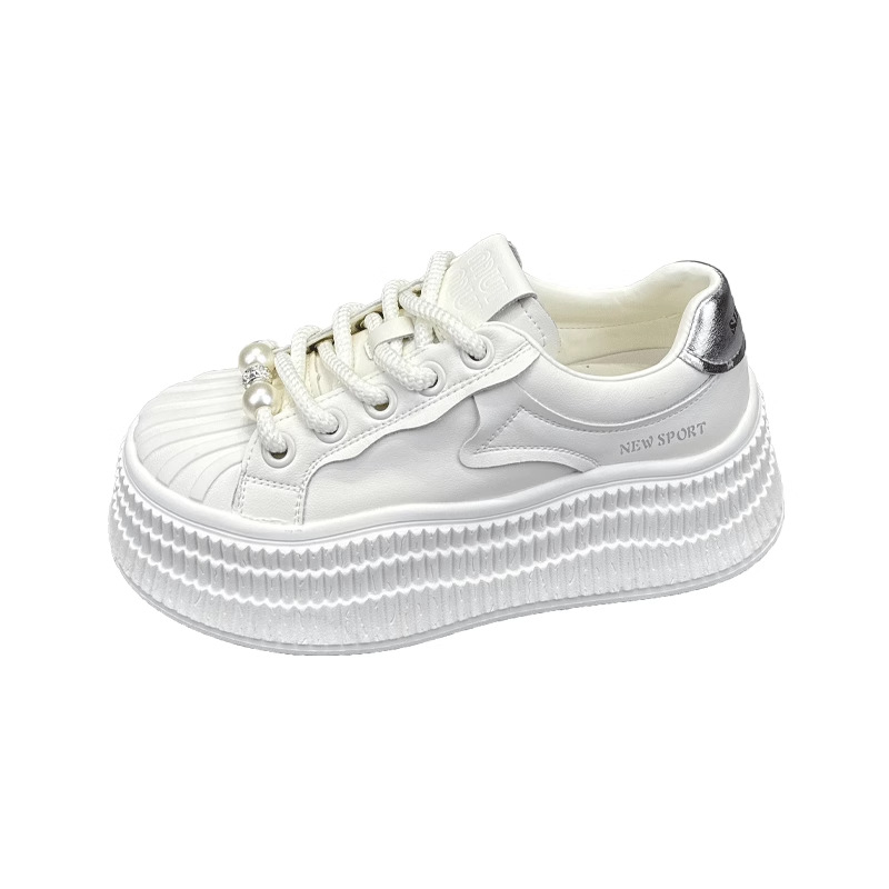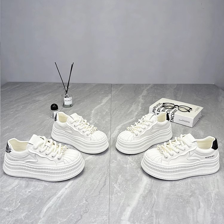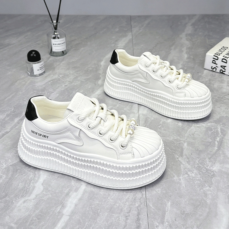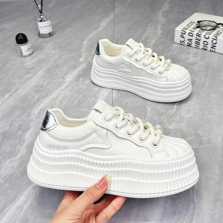 Бисквитные кроссовки на каблуке 5 см, легкие и дышащие белые туфли 2025 для женщин, новые весенне-осенние спортивные и повседневные туфли на толстой подошве.