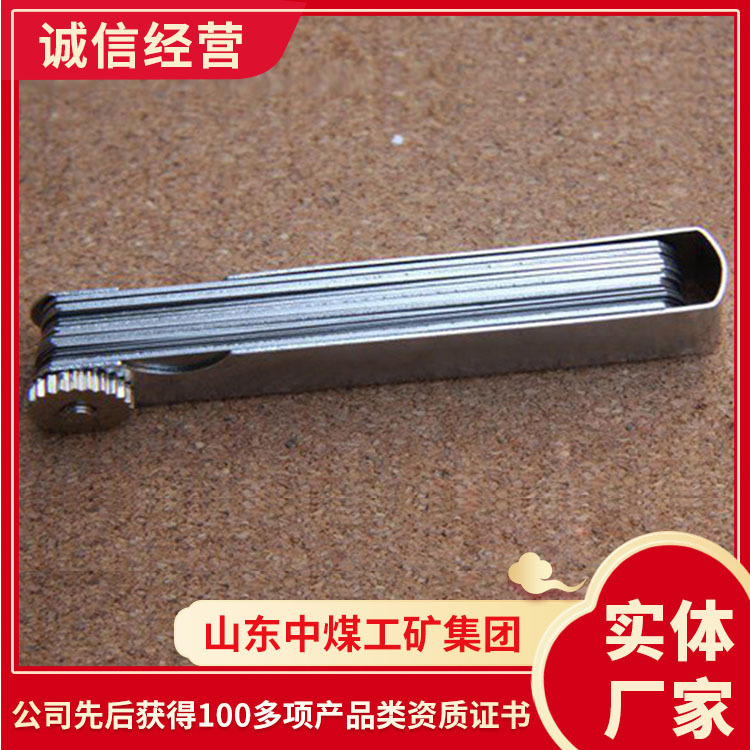 塞尺又称测微片或厚薄规,是用于检验间隙的测量器具之一,横截面为直角三角形,在斜边上有刻度,利用锐角正玄直接将短边的长度表示在斜边上,这样就可以直接读出缝的大小了。塞尺使用前必须先清除塞尺和工件上的污垢与灰尘。使用时可用一片或数片重叠插入间隙,以稍感拖滞为宜。测量时动作要轻,不允许硬插。也不允许测量温度较高的零件。