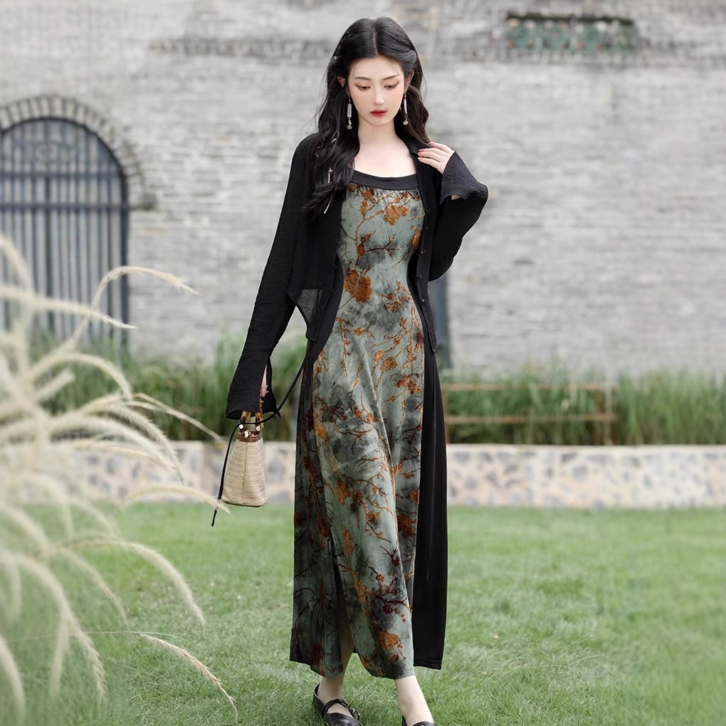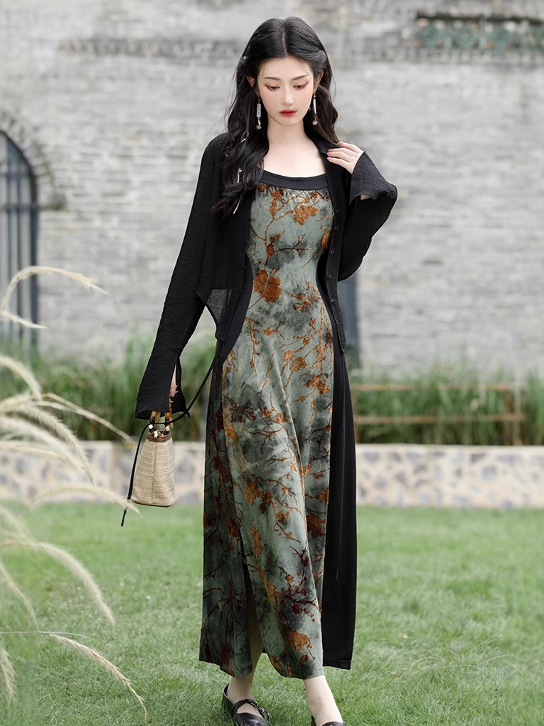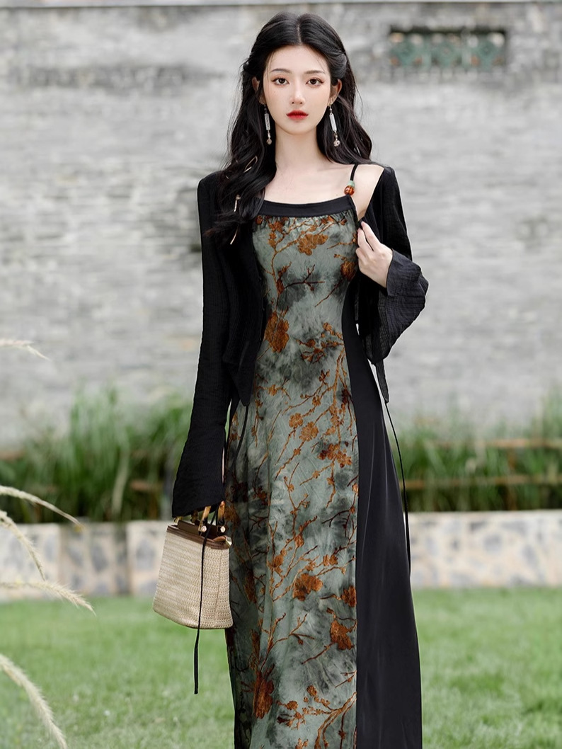 Новое национальное платье в китайском стиле с рисунком тушью, осеннее женское нишевое платье с флокированием на подтяжках, маленький дизайн костюма