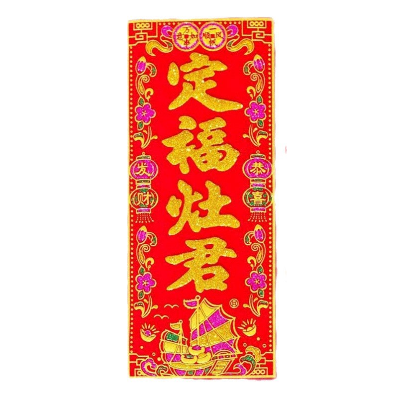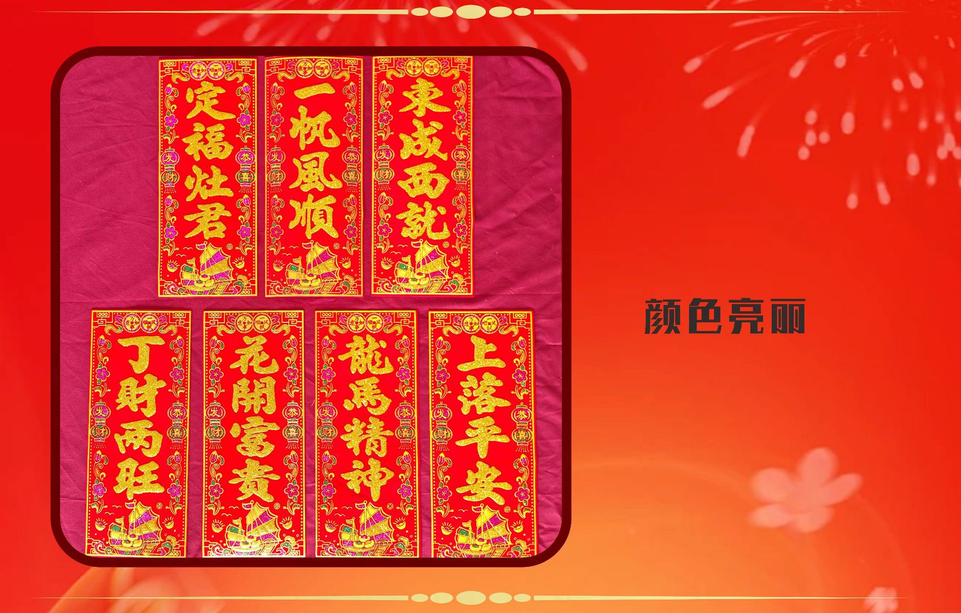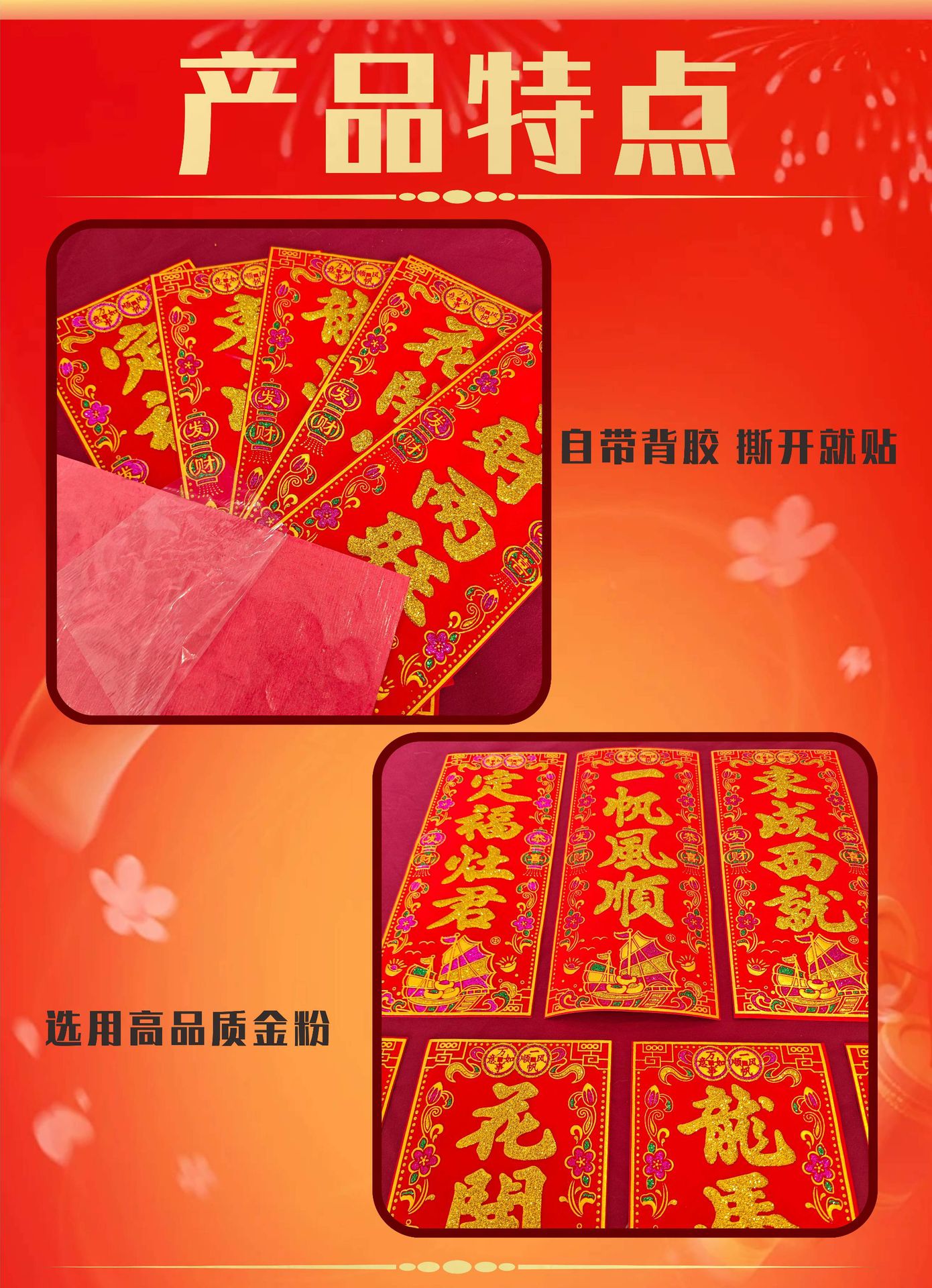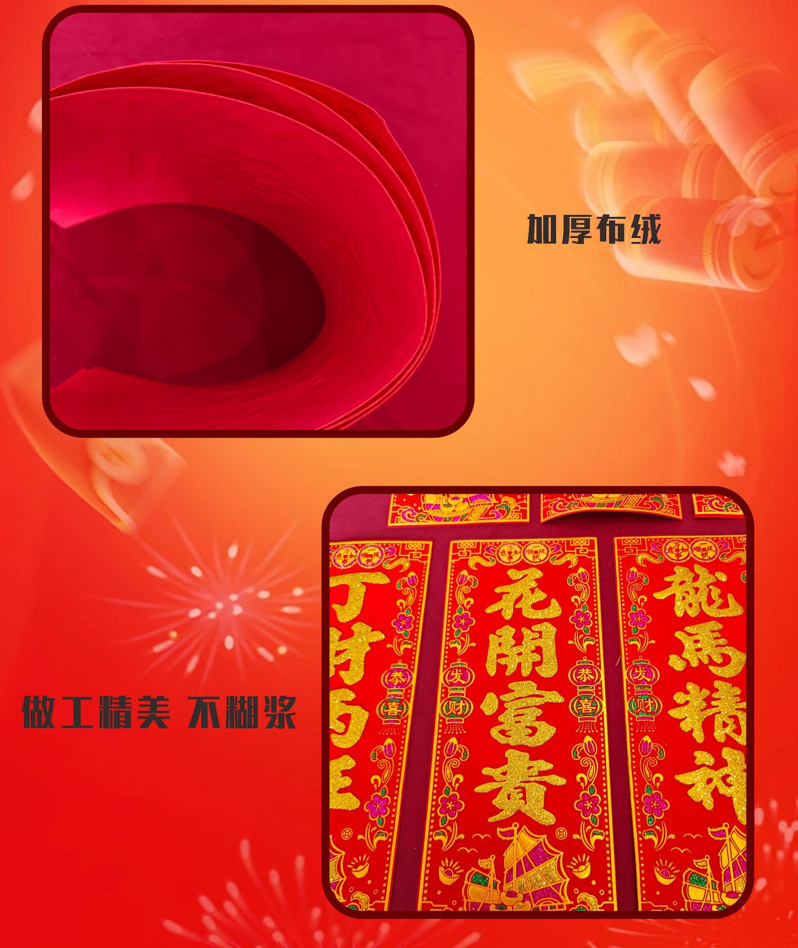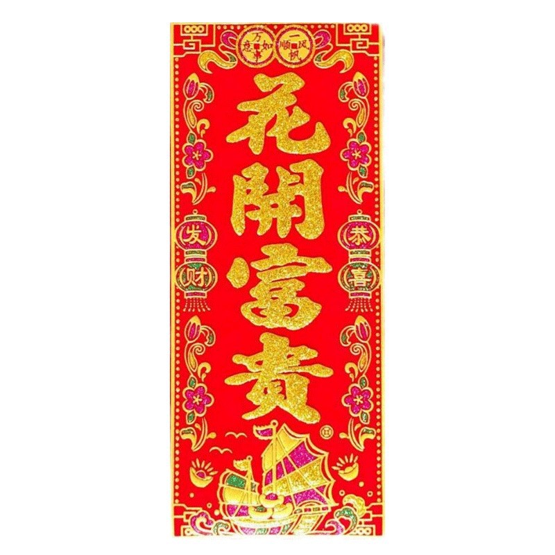 Цветы распускаются, богатство в руках, гарантированы благословения Востока и Запада, красный фон с бархатными самоклеящимися четырехсимвольными куплетами на Золотой фольге.