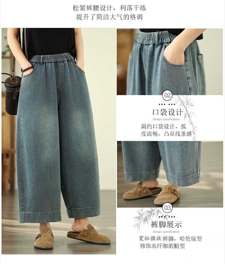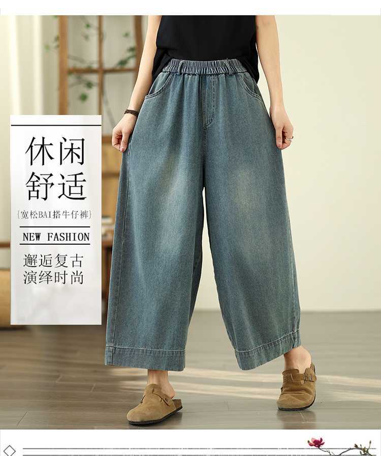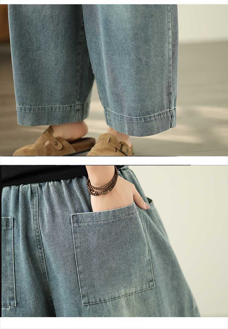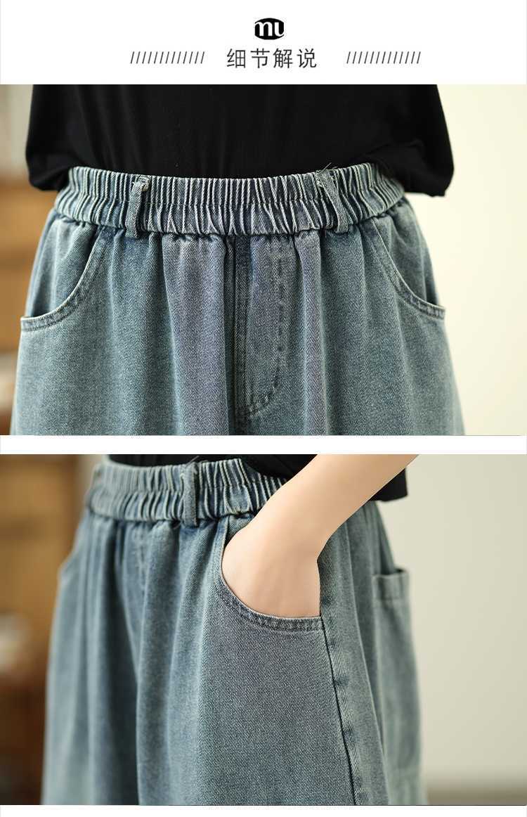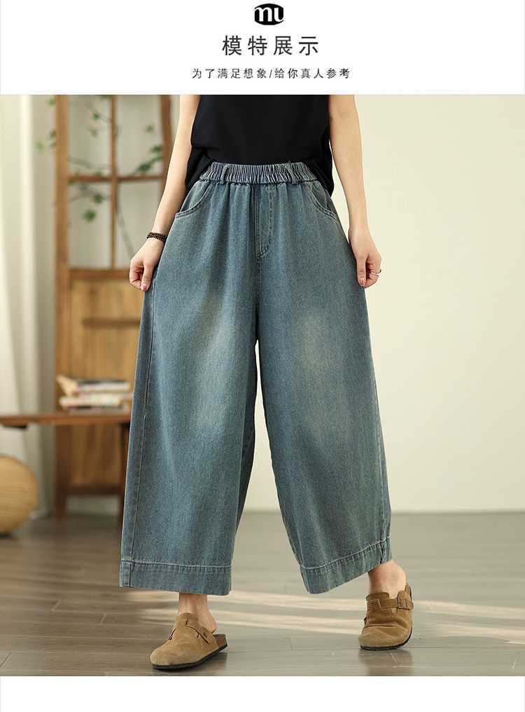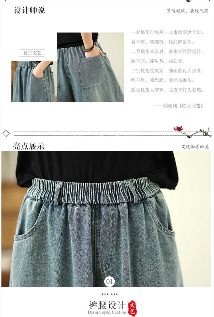 Настоящая фотография летних новых однотонных свободных брюк-шаровары из стираного денима больших размеров для пышных женщин.