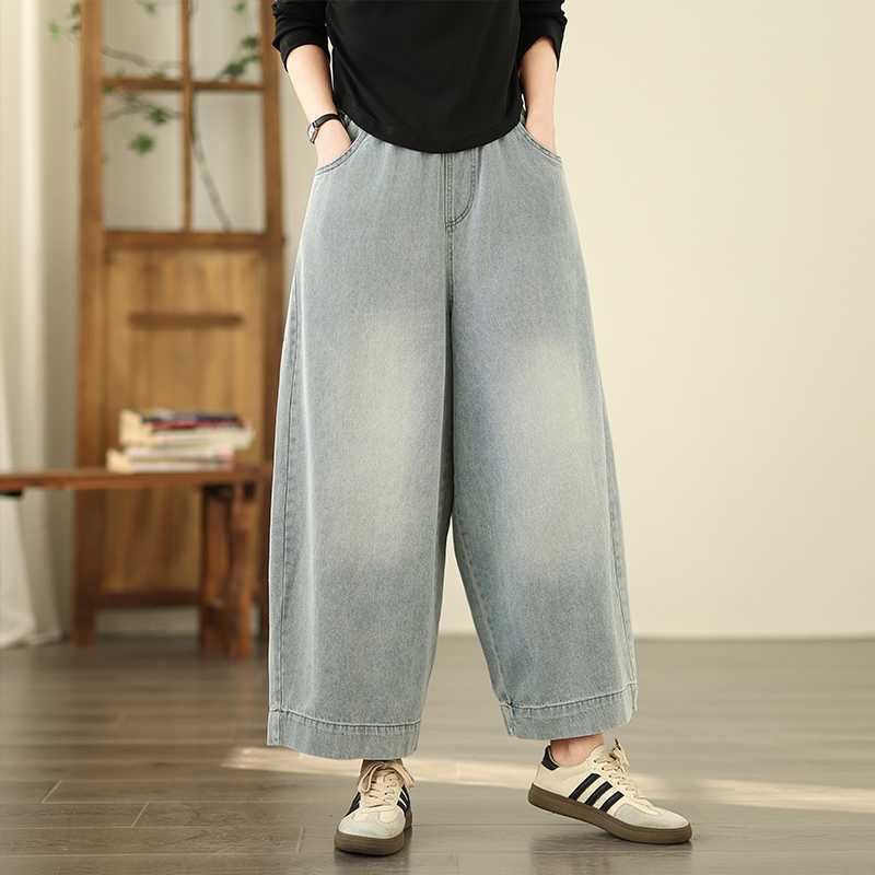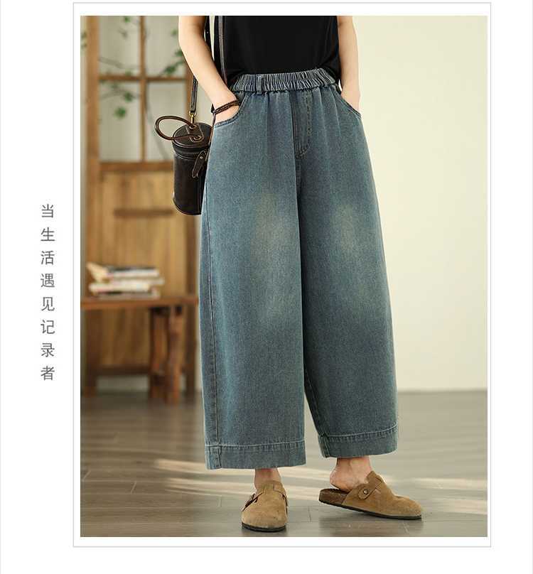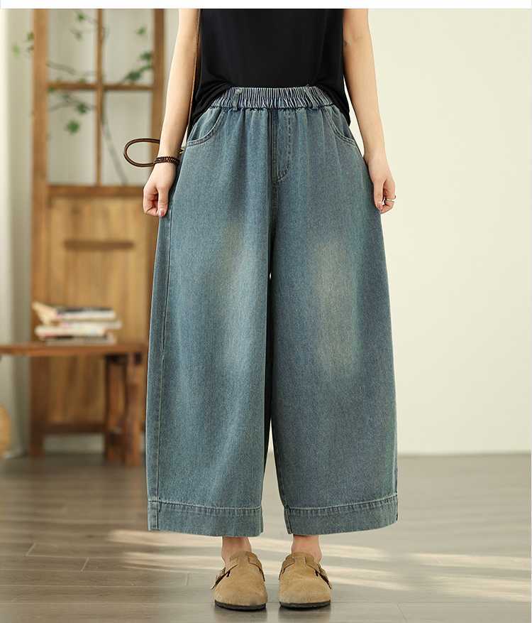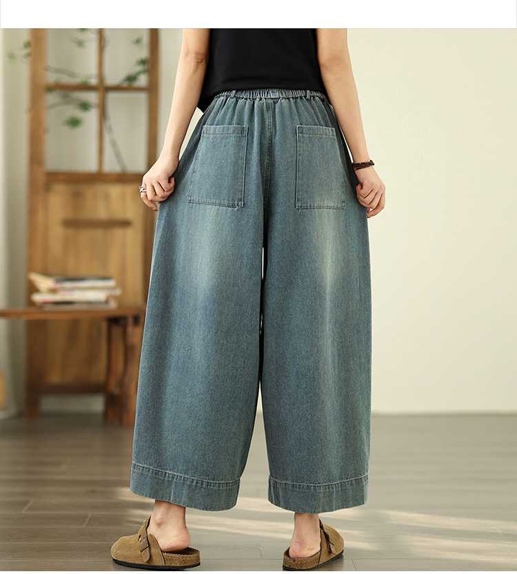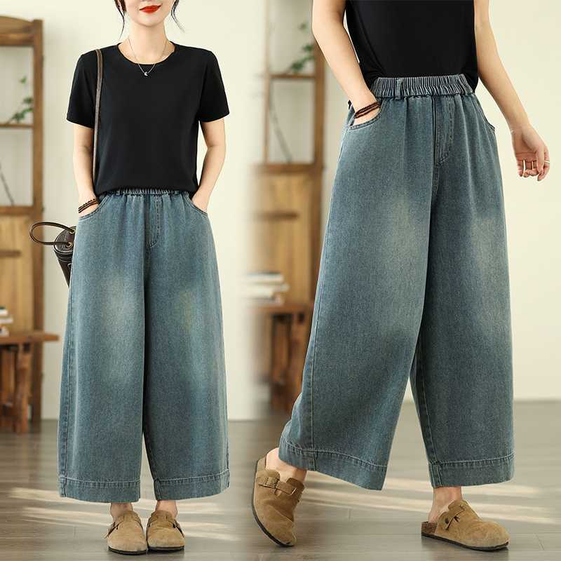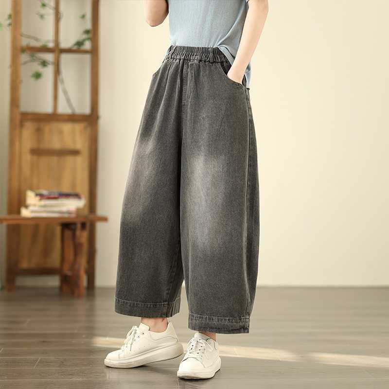 Настоящая фотография летних новых однотонных свободных брюк-шаровары из стираного денима больших размеров для пышных женщин.