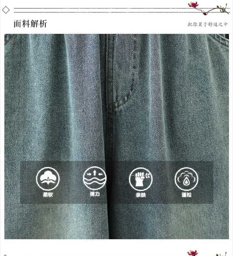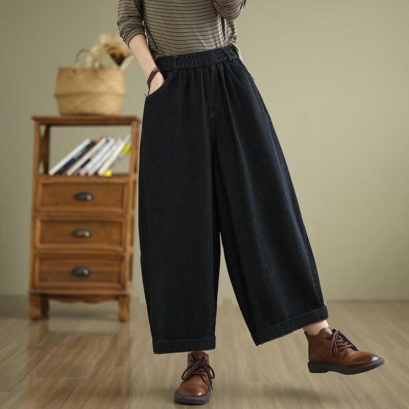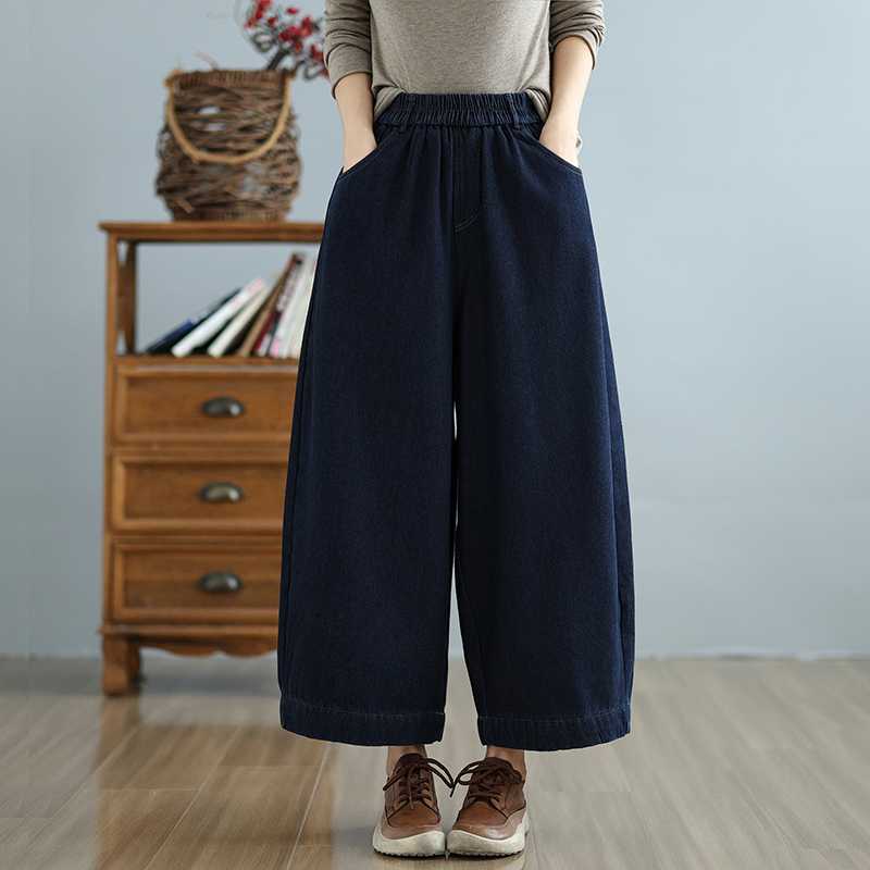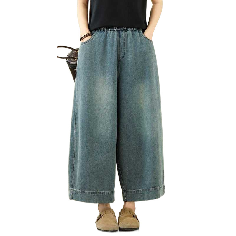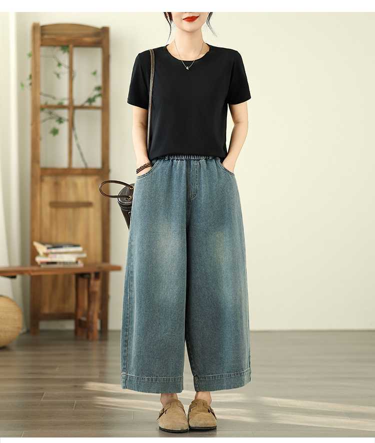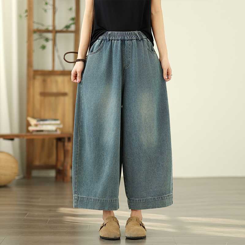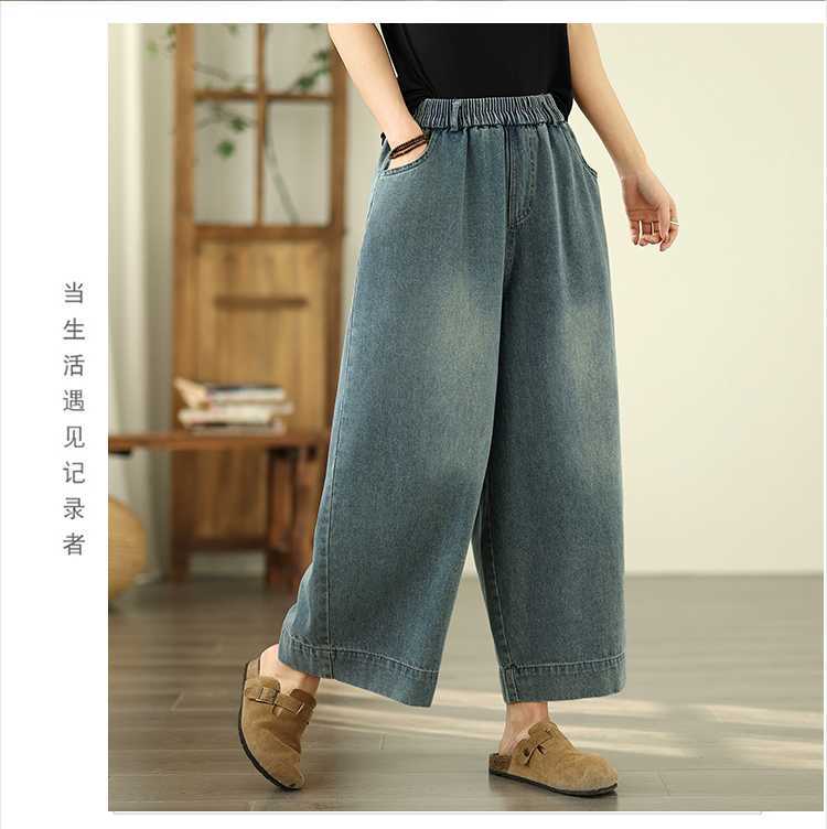 Настоящая фотография летних новых однотонных свободных брюк-шаровары из стираного денима больших размеров для пышных женщин.