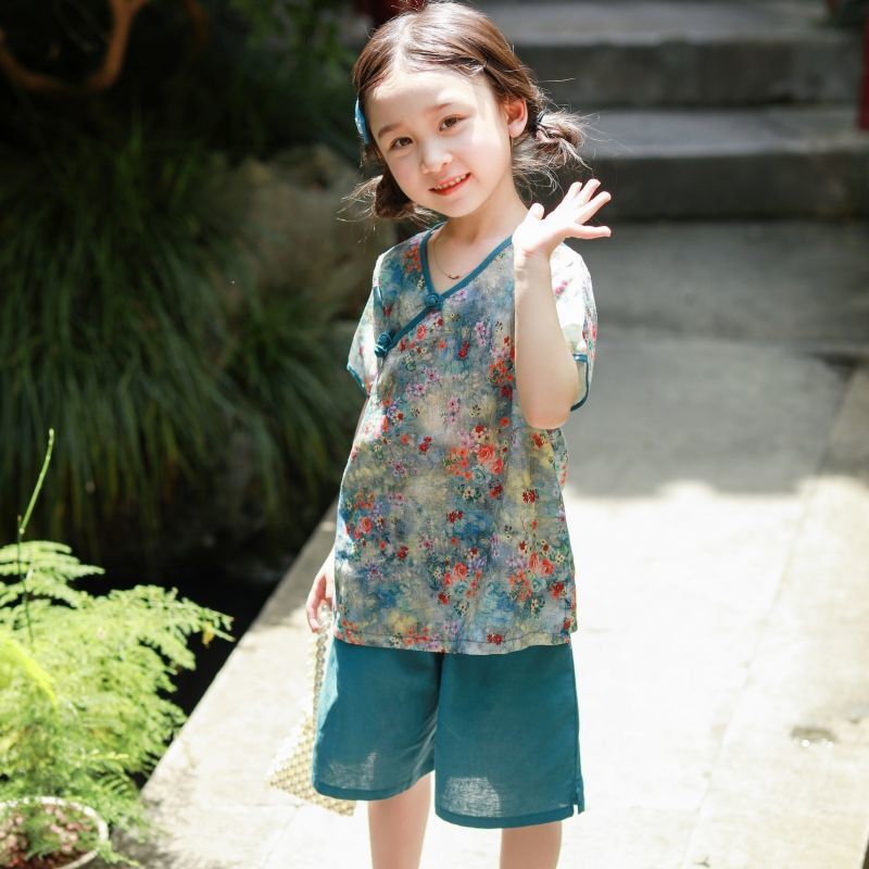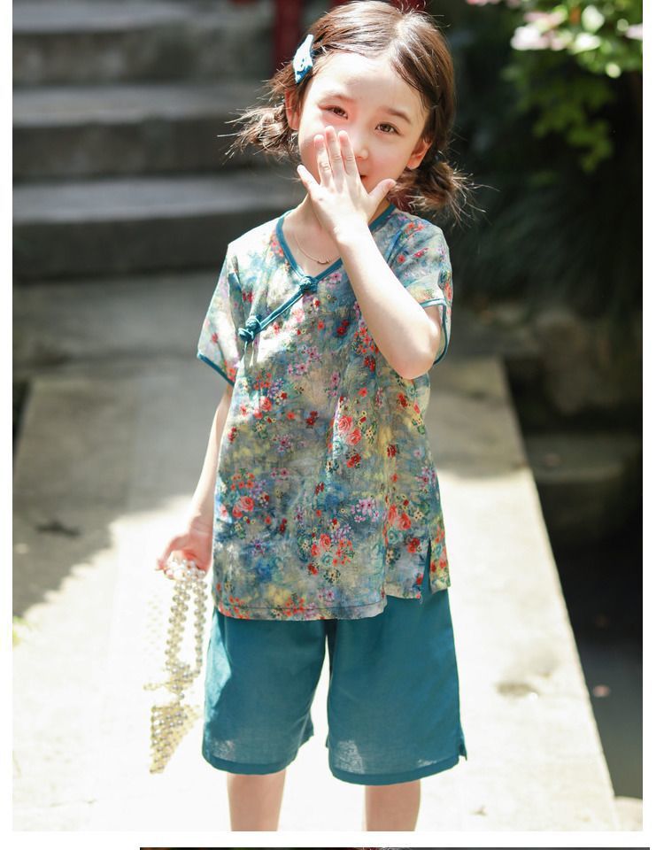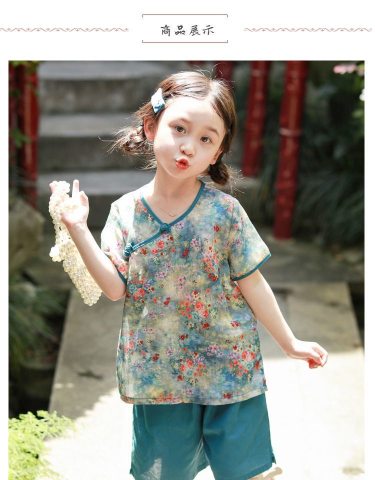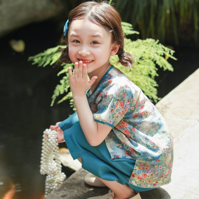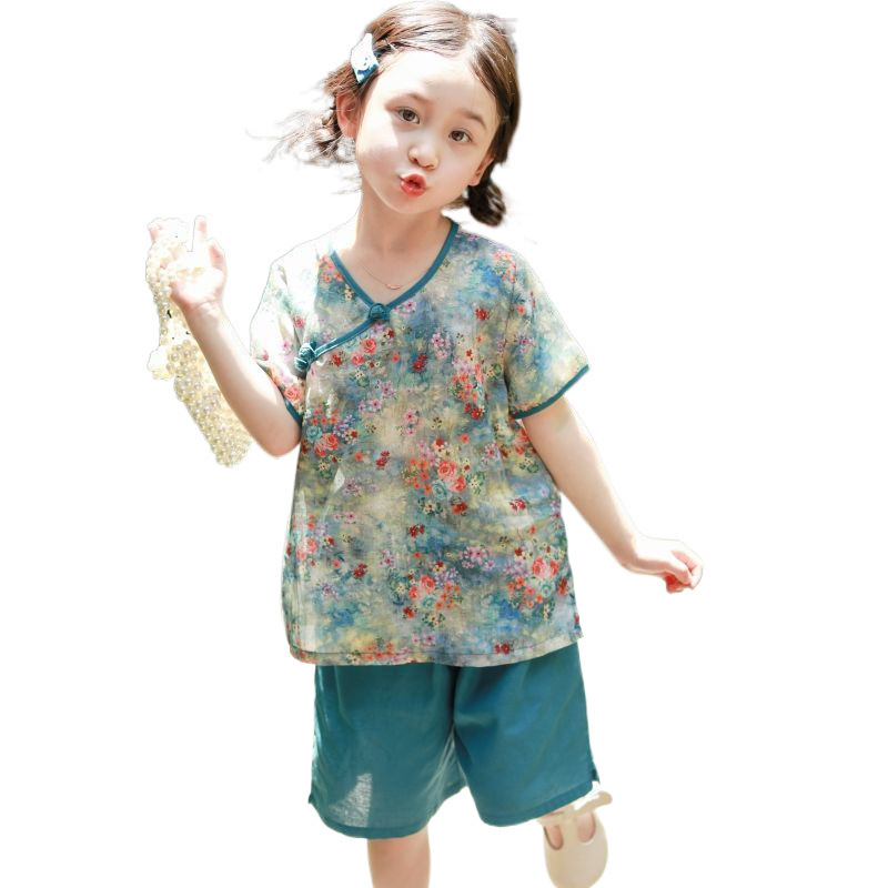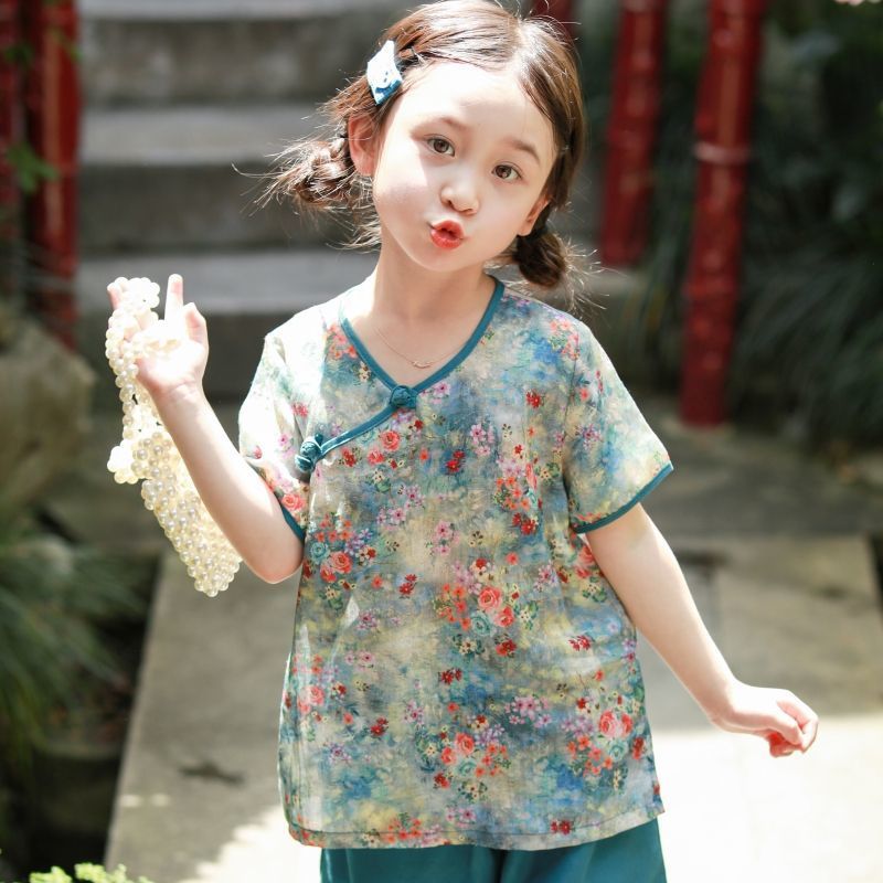 Комплект ханьфу для девочек для маленьких девочек, летний легкий костюм Тан с короткими рукавами в древнем стиле для девочек, улучшенный детский комплект из двух предметов с цветочным принтом.