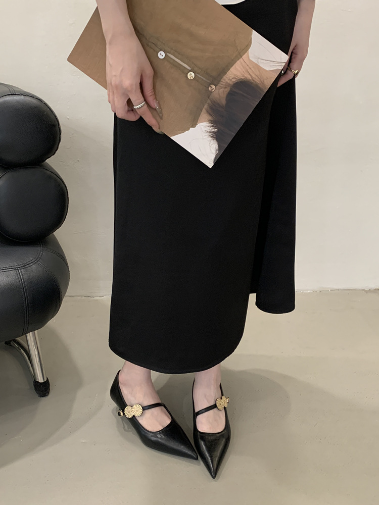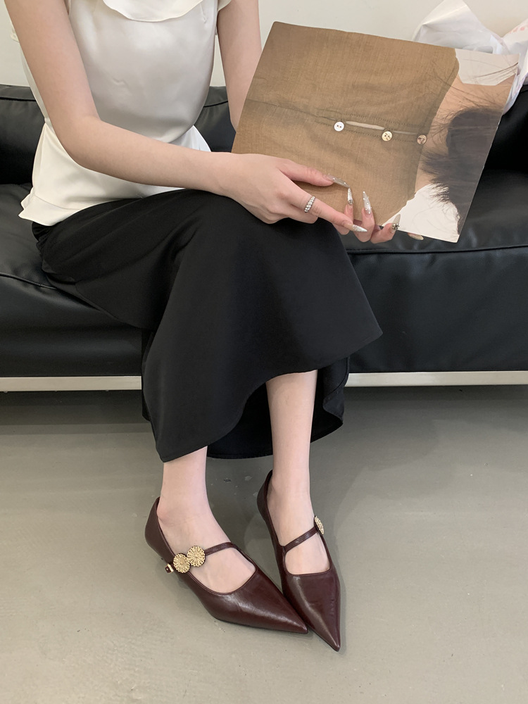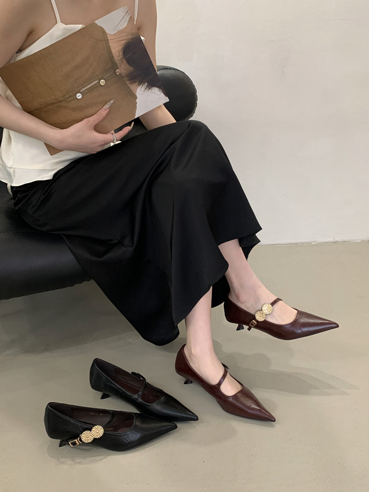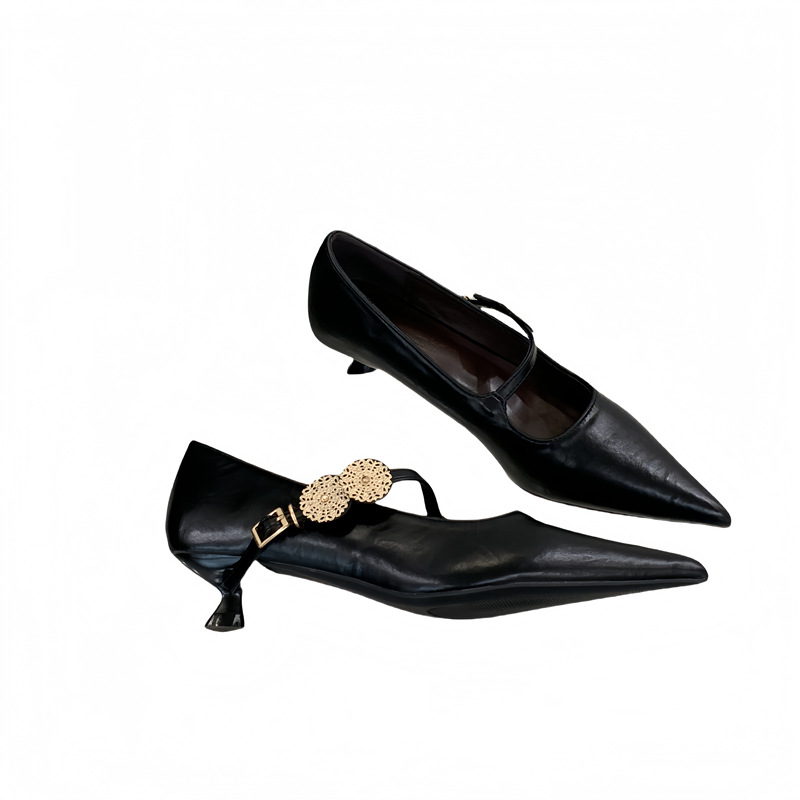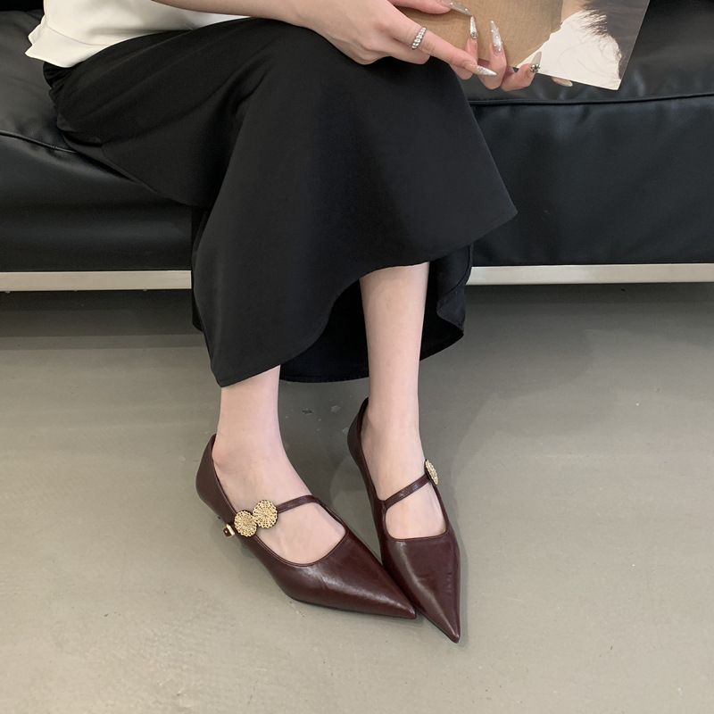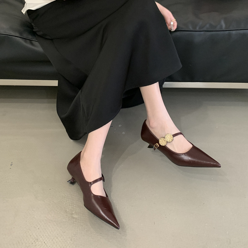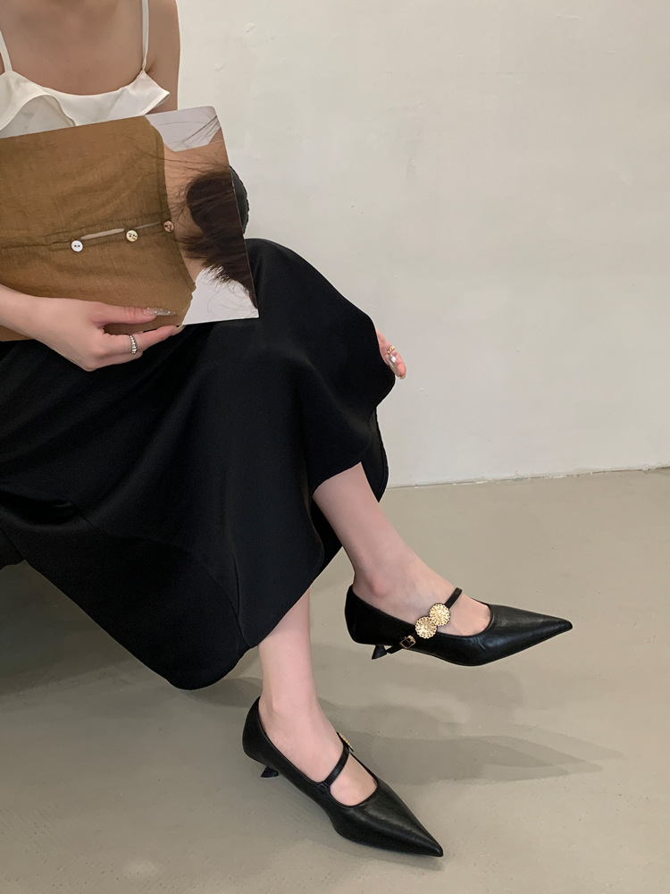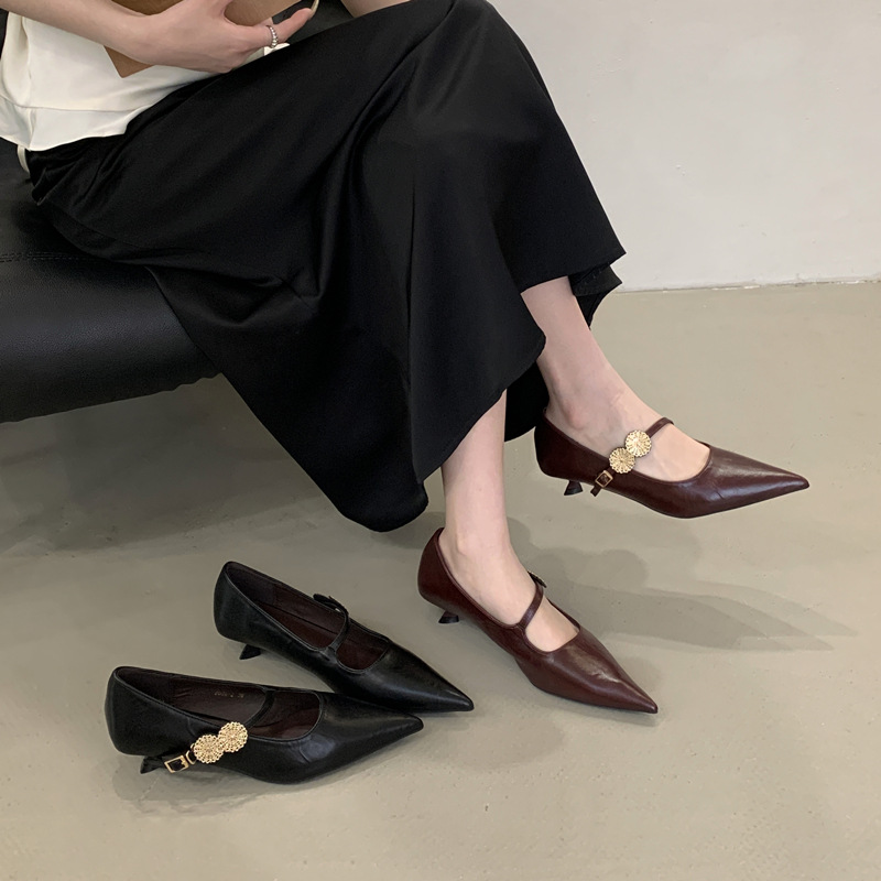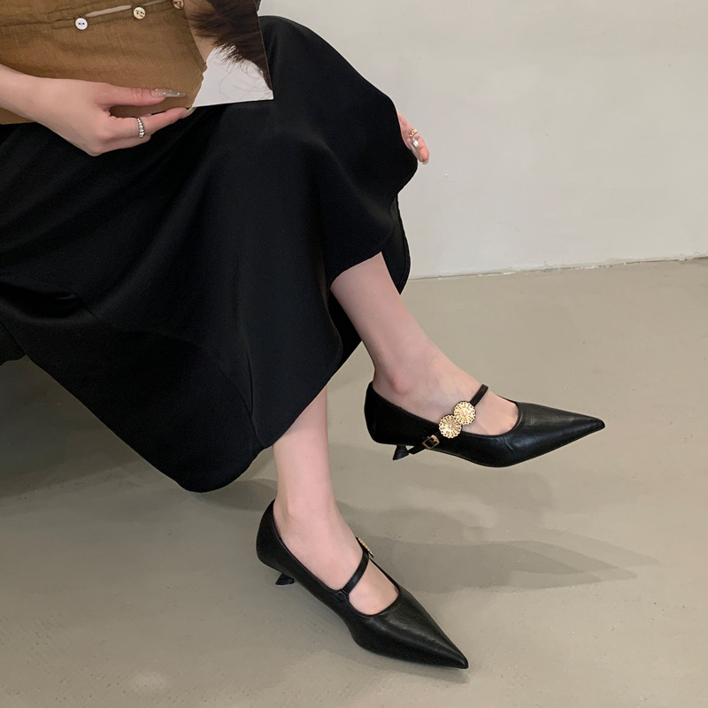 Женские черные туфли на низком каблуке с острым носком, металлической пряжкой и одним ремешком, на низком каблуке, для поездок на работу во французском стиле