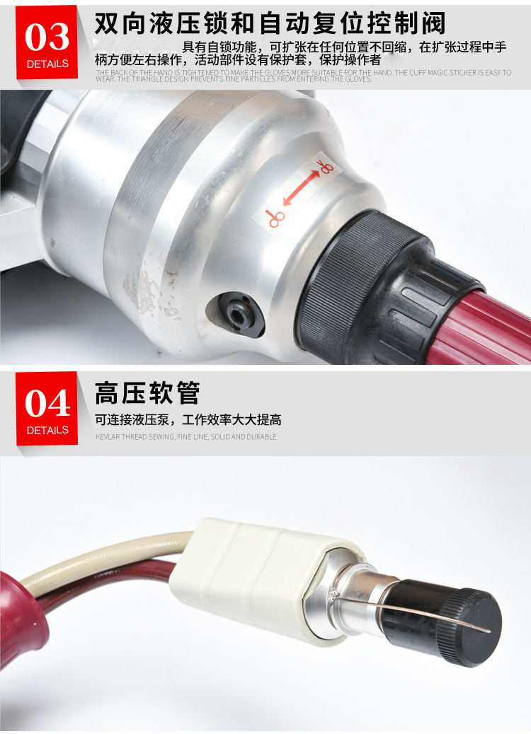 额定工作压力 63MPa,额定扩张力35KN-50KN,扩张距离530mm,牵引距离430mm,重量9.8kg,外形尺寸(长*宽*高)660×235×120mm,配件背负式背包一个