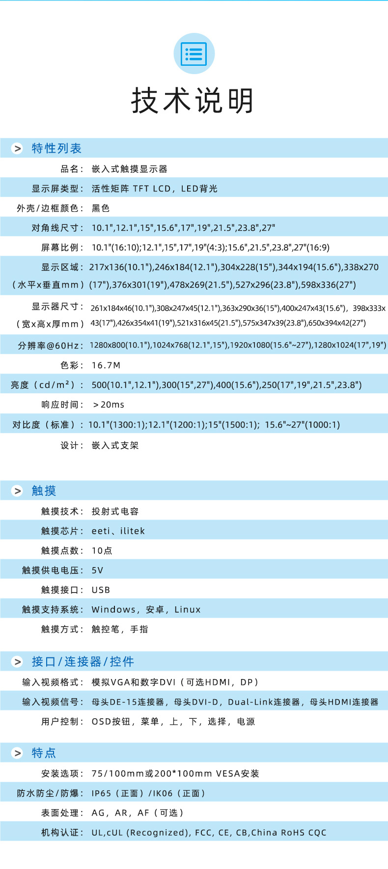 10,1-дюймовый сенсорный дисплей 3C; 12,1-дюймовый сенсорный дисплей 3C; 15-дюймовый сенсорный монитор 3C; 15,6-дюймовый сенсорный монитор 3C; 17-дюймовый сенсорный монитор 3C; 19-дюймовый сенсорный монитор 3C; 21,5-дюймовый сенсорный монитор 3C; 23,8-дюймовый сенсорный монитор 3C; 27-дюймовый сенсорный монитор 3C
