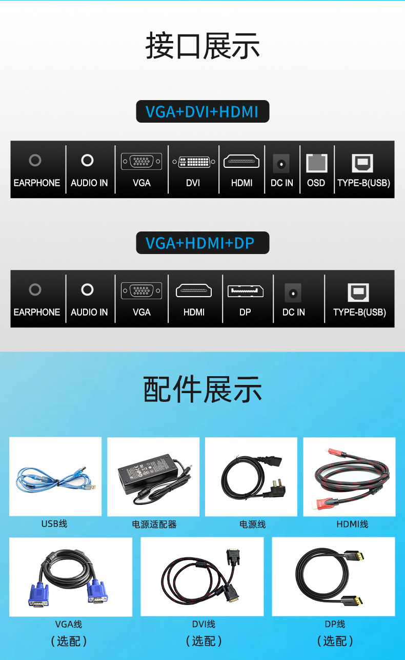 Шнур питания, адаптер питания, кабель HDMI/кабель VGA/кабель DVI/кабель DP, сенсорный USB-кабель