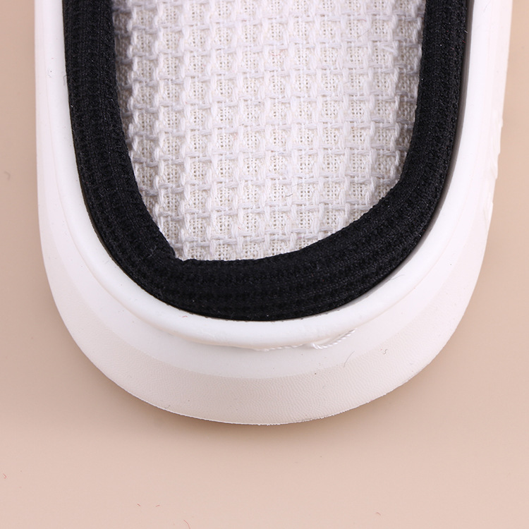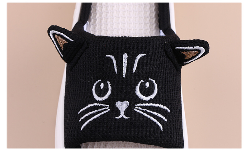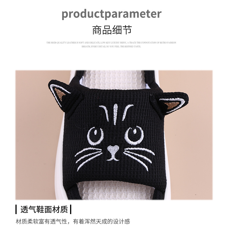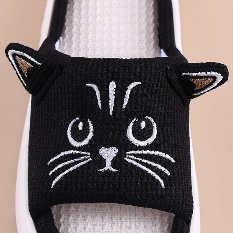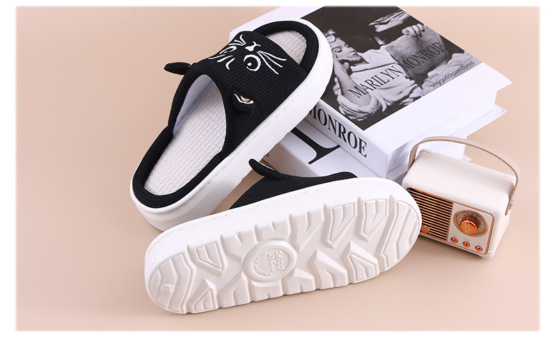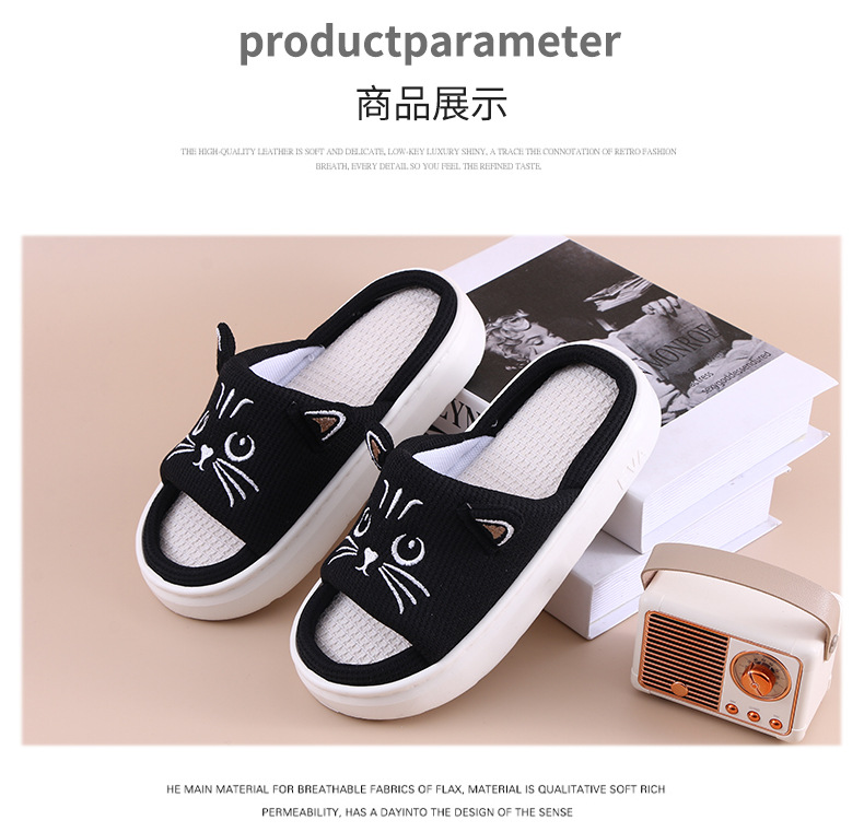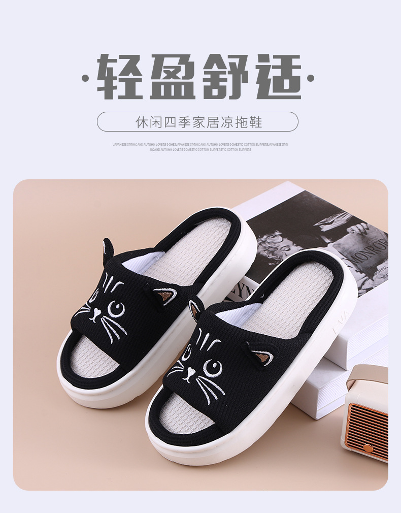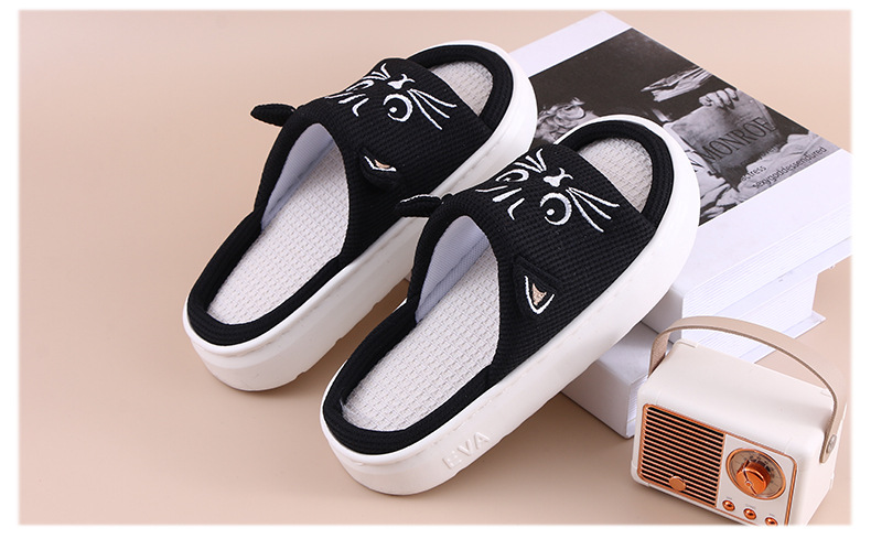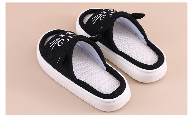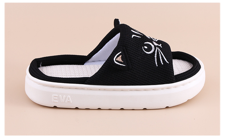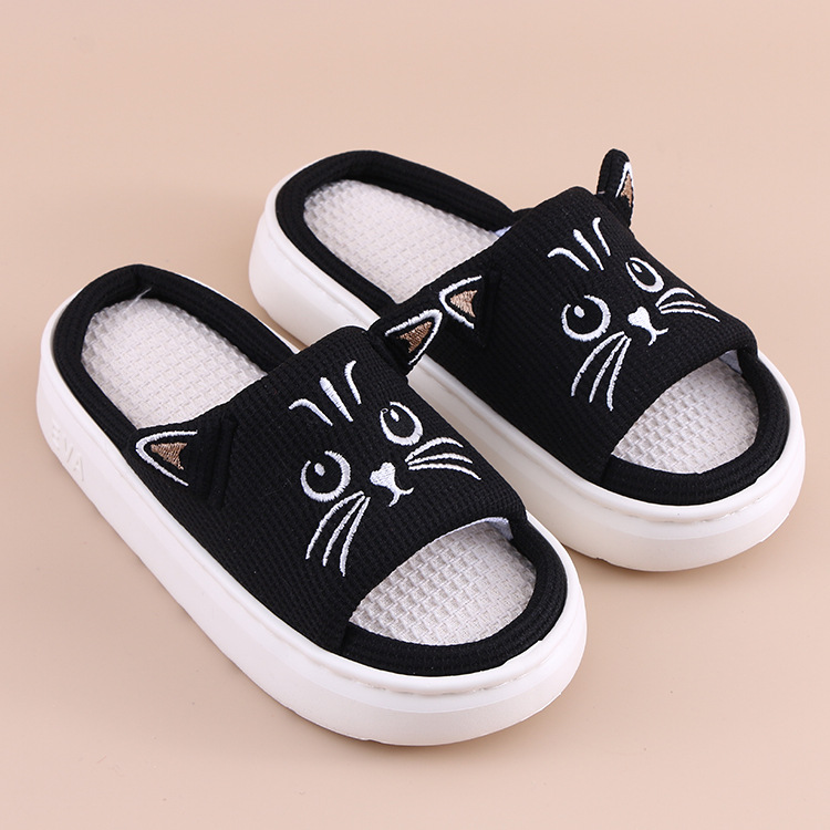 Льняные тапочки женские летние домашние нескользящие черные кошачьи толстые подошвы